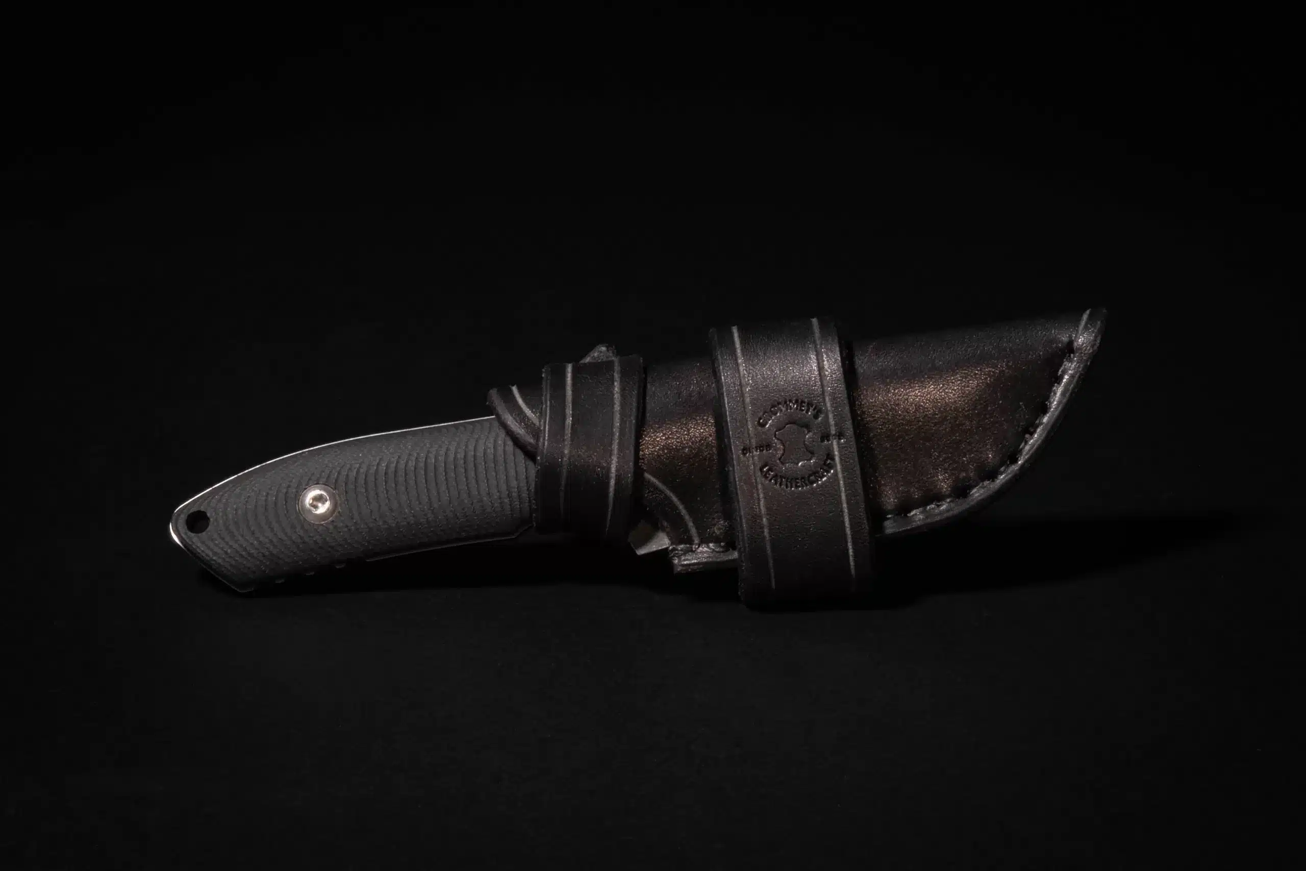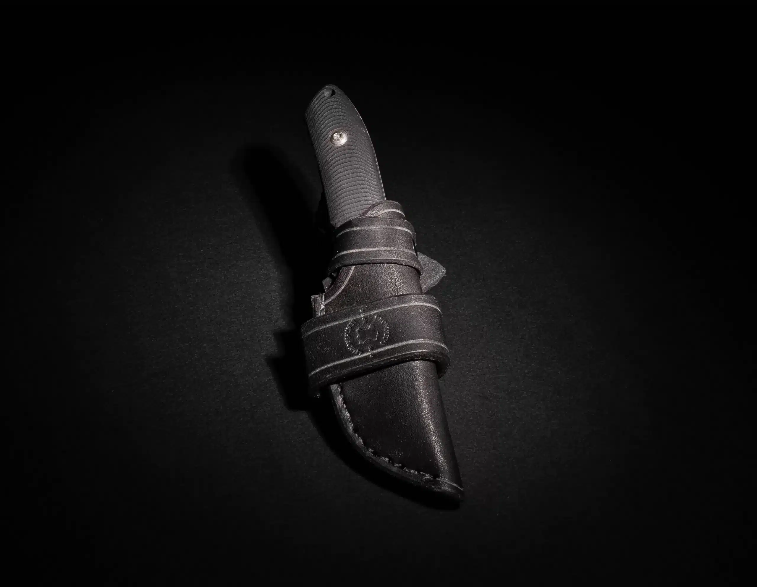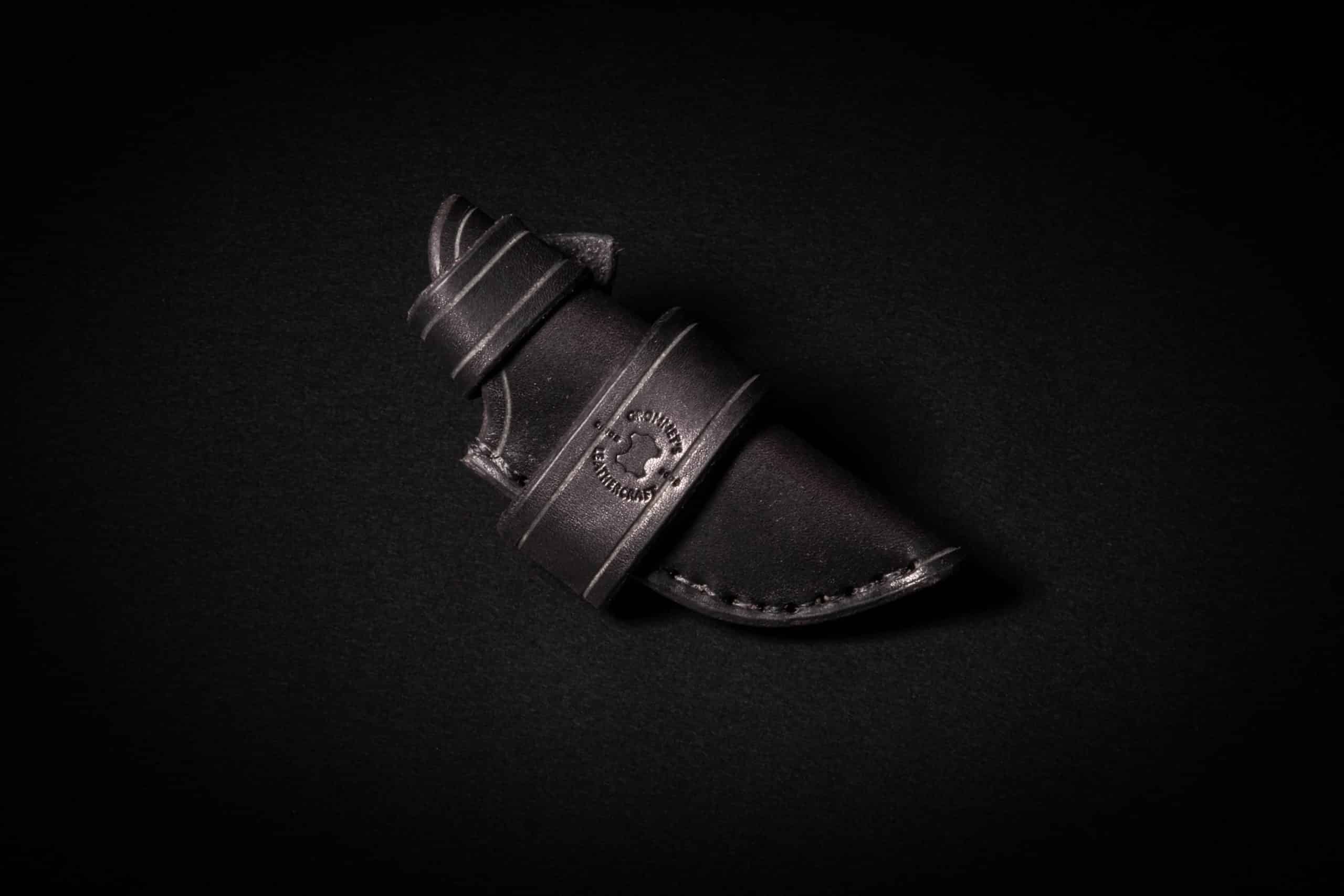 It is made out of 8-10 ounce latigo cowhide, and can be made with a vertical belt loop, or a 1″ horizontal strap that snaps closed. Each option features a snap closure for the grip of the knife.