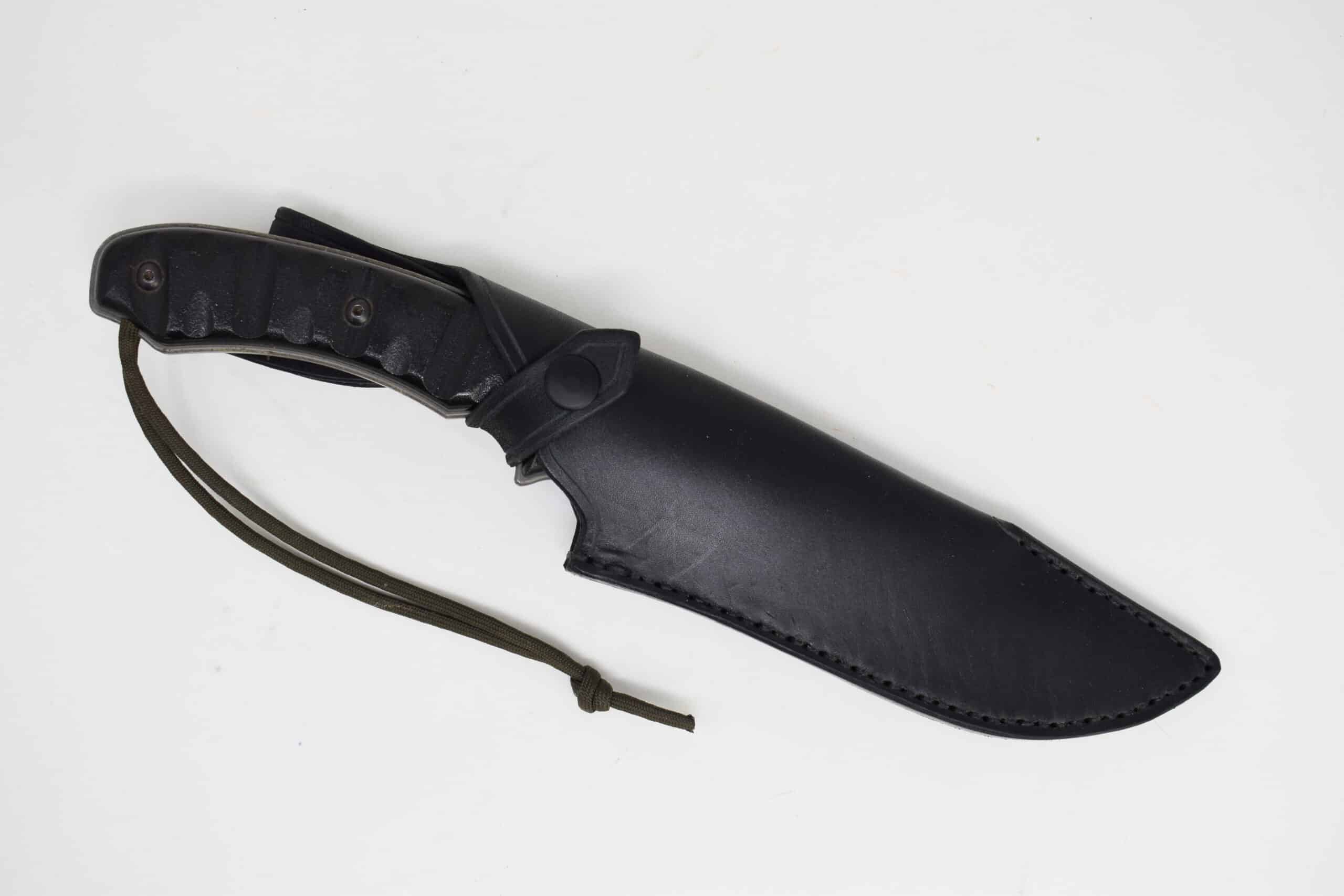 The knife is secured in the sheath via a leather strap that snaps closed, and for the scout style sheath can be swiveled to either side of the sheath, rendering the sheath ambidextrous.