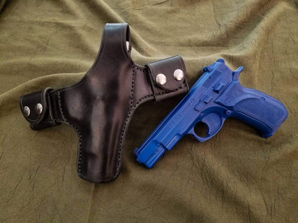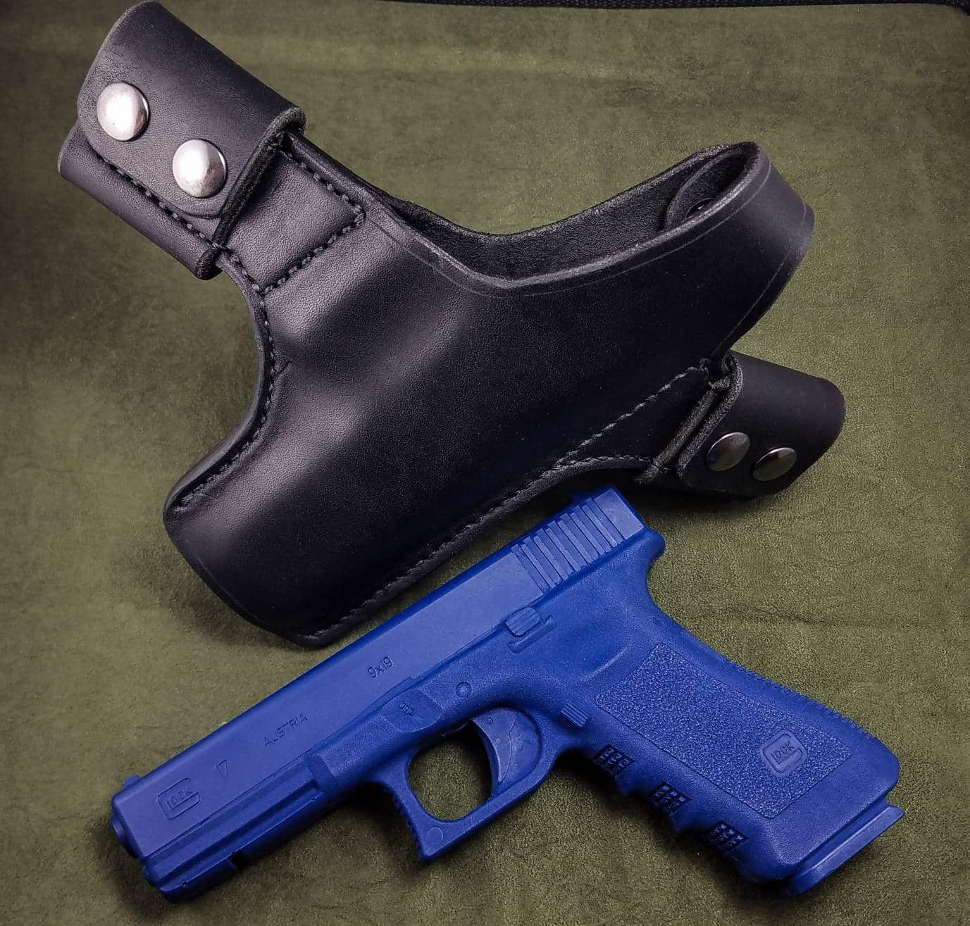 The holster is made out of 8-10 ounce latigo cowhide, unless the “natural” option is chosen, in which case it will be made out of 8-10 vegtan cowhide. The gun is secured in the holster by a thumb snap.