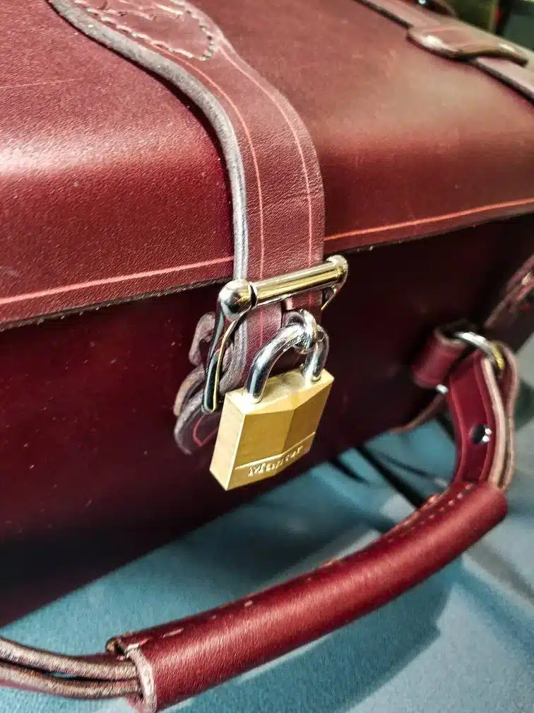Each suitcase is made out of 7-8 ounce latigo cowhide. The sides are 2 layers thick, with a slight overlap in the top to keep everything secure