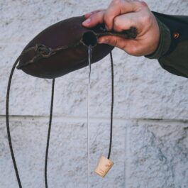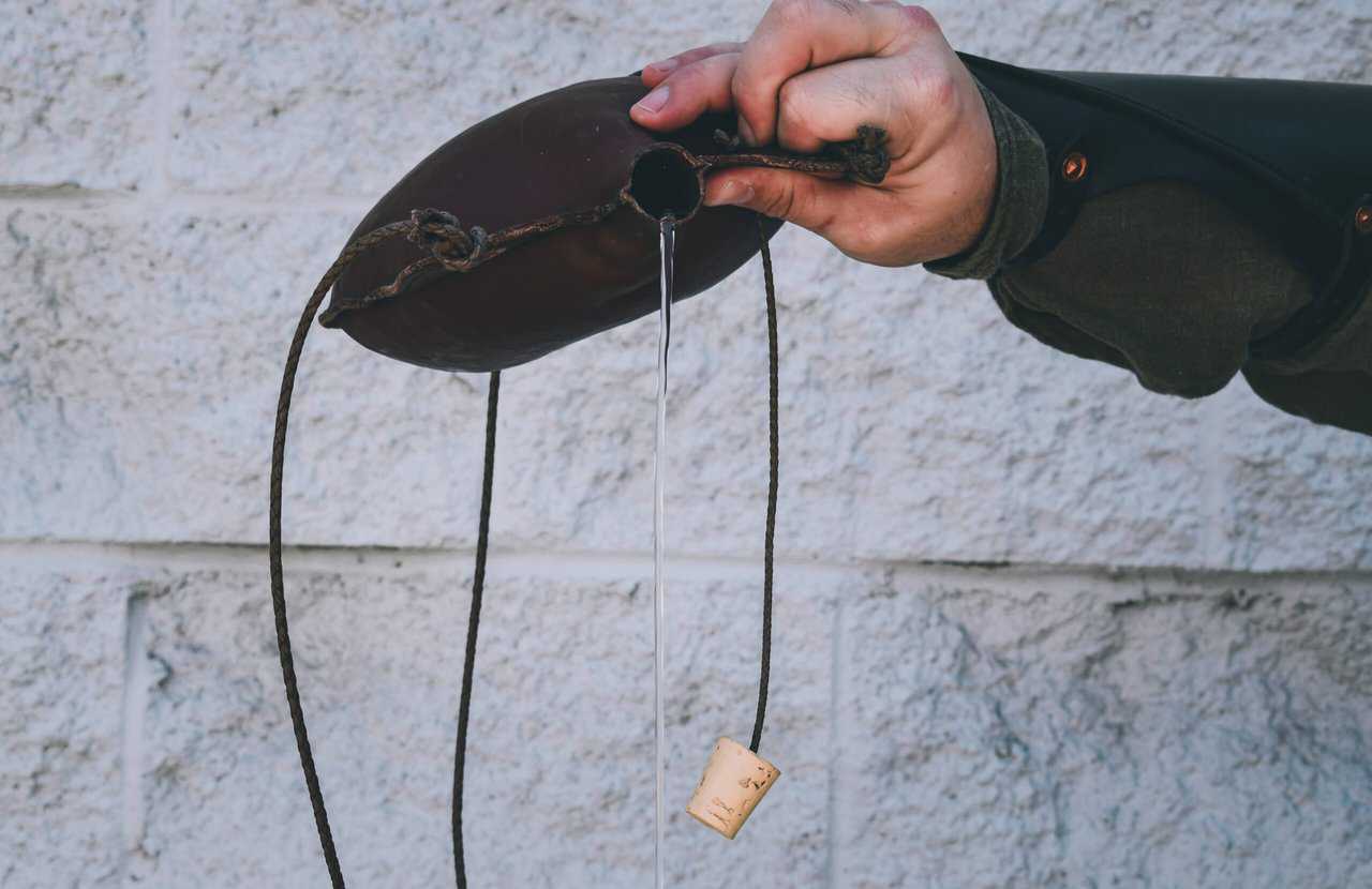 Each bottle is closed via a cork that is tethered by a length of braided cord, and comes with a 60″ length of cord to carry it over your shoulder.
