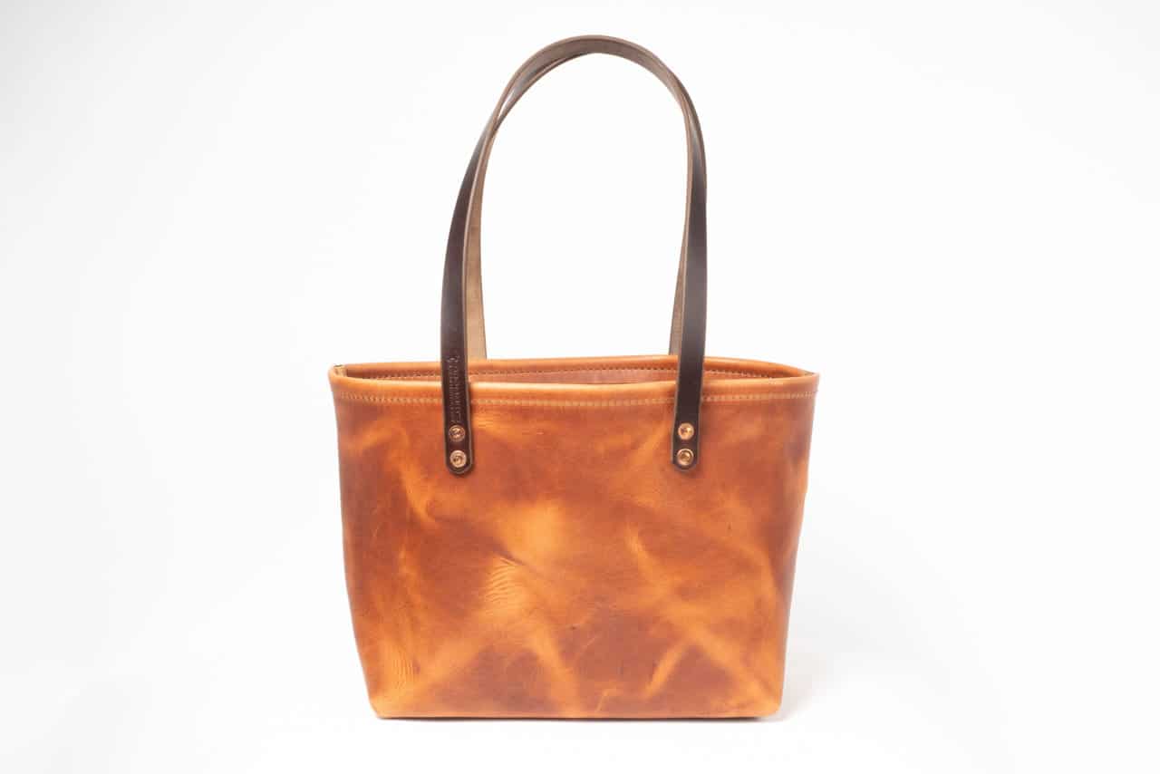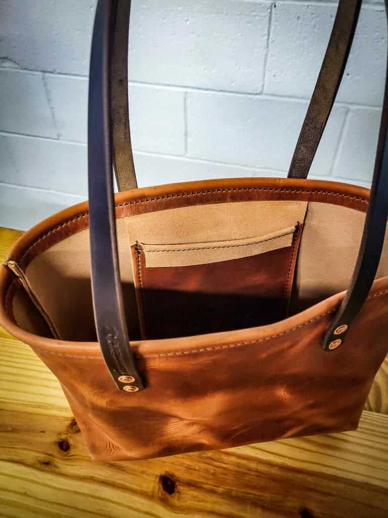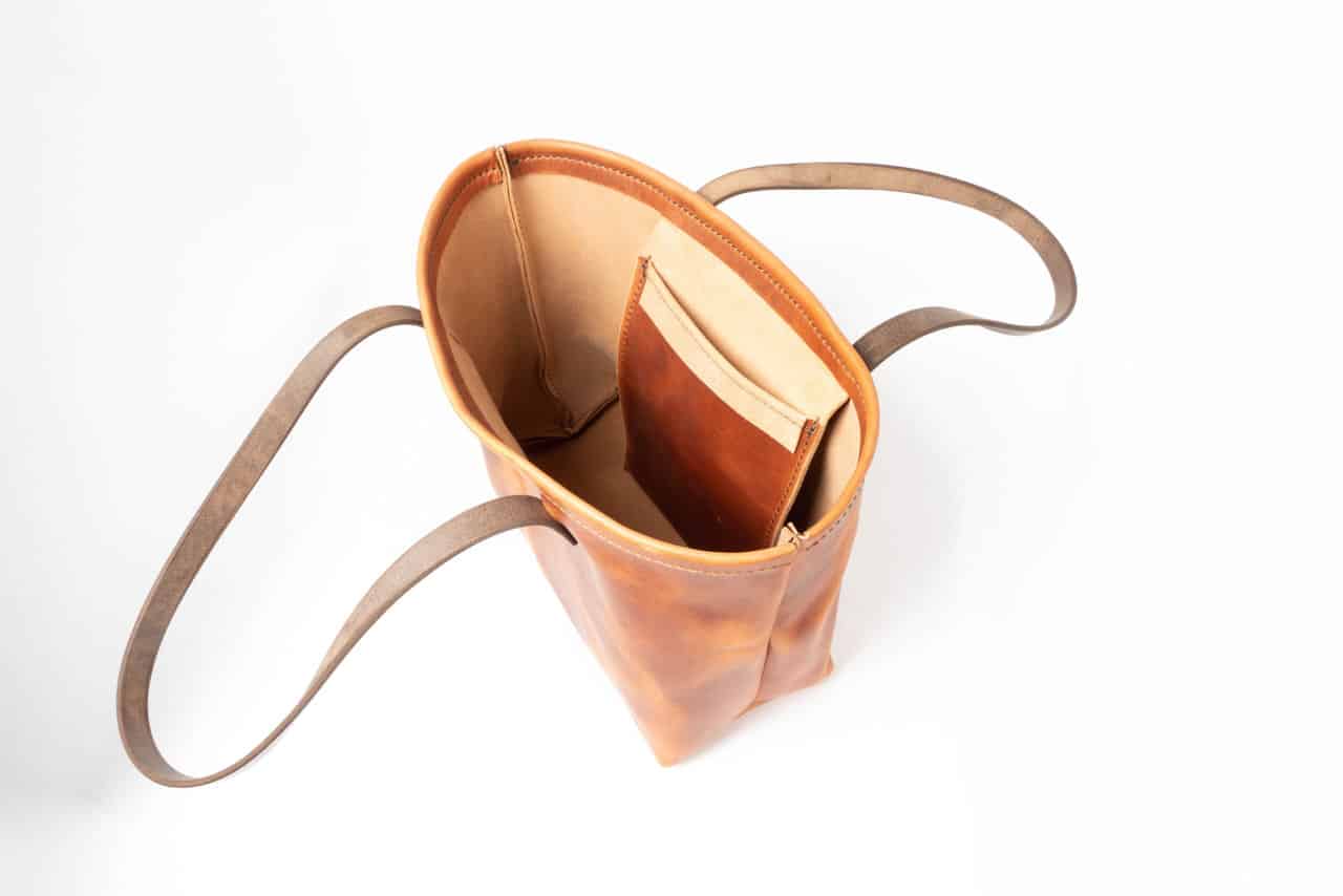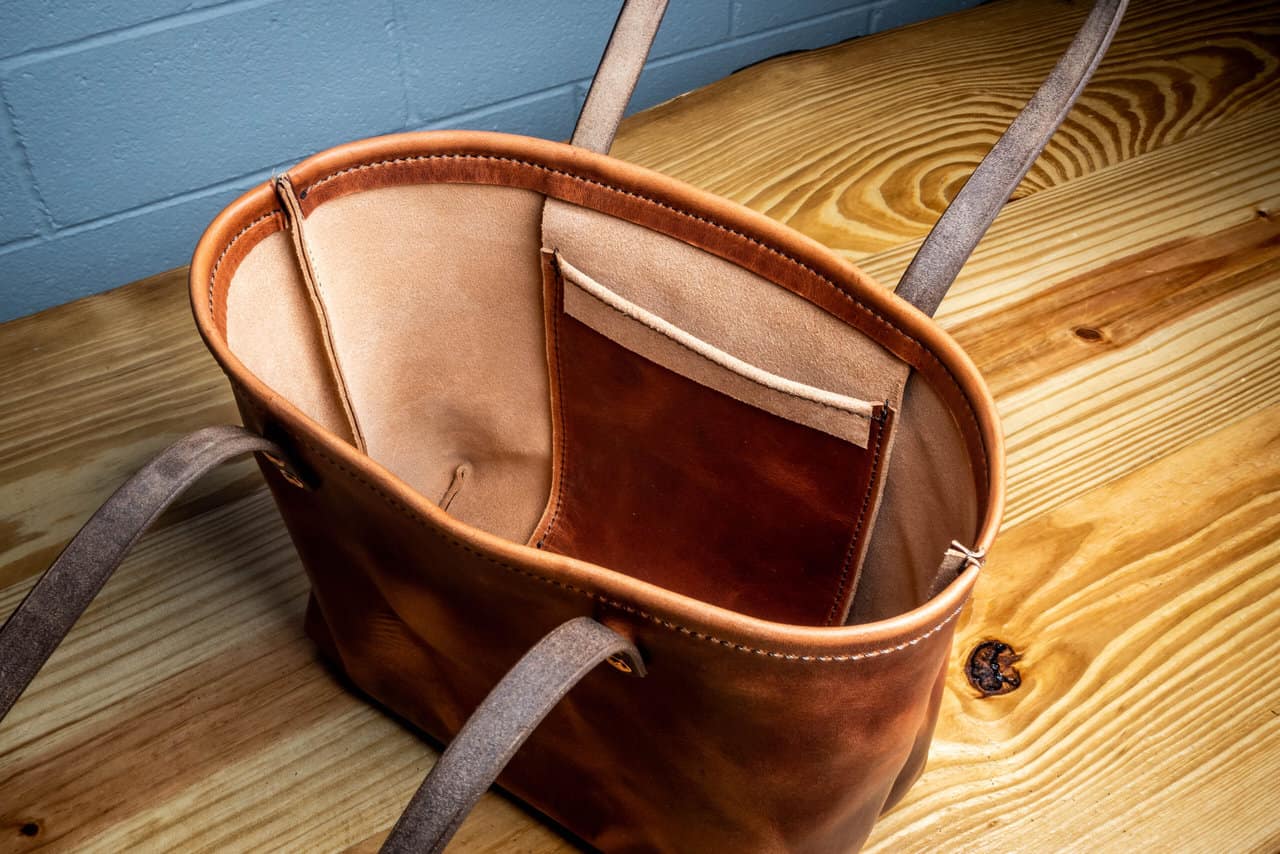 Like our standard totes, each bag is made out of a single piece of leather, stitched on the sides and bottom. The bag measures 12″ x 10″ x 4″ with a smaller (8″x5″) pocket on the inside of the bag, and two sturdy loop handles on each side made out of 8-10 ounce Chromexel.