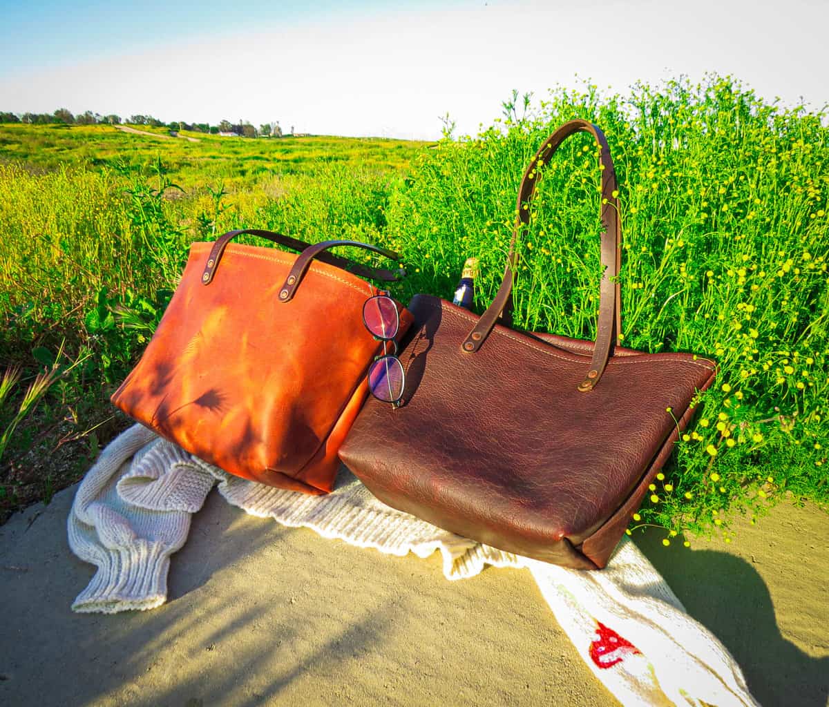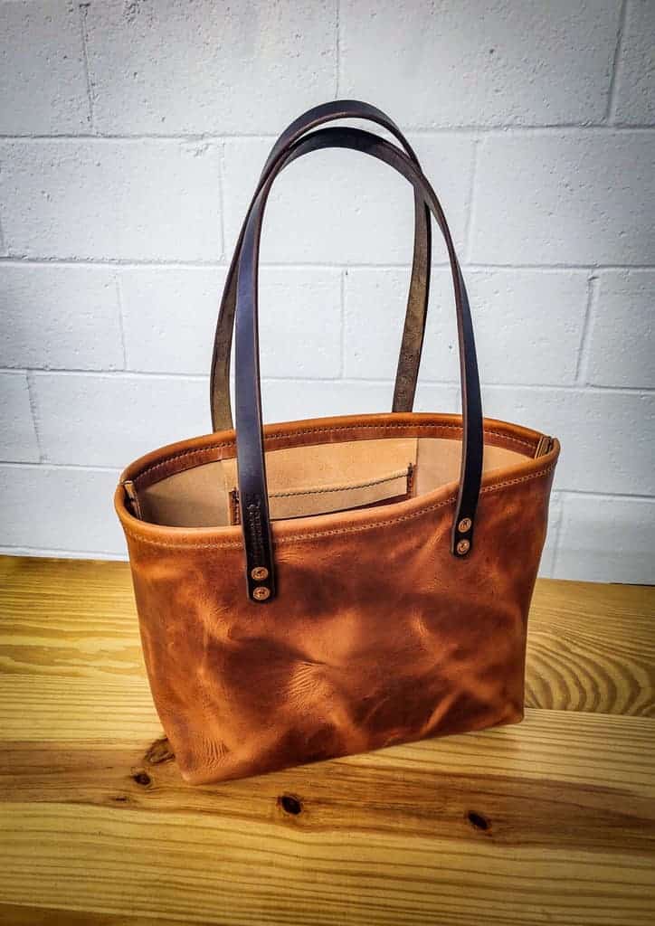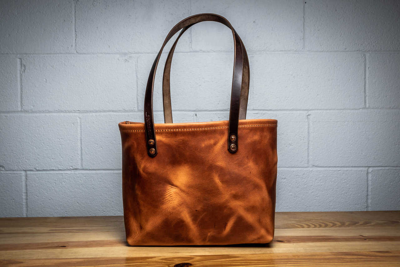 Like our standard totes, each bag is made out of a single piece of leather, stitched on the sides and bottom. The bag measures 12″ x 10″ x 4″ with a smaller (8″x5″) pocket on the inside of the bag, and two sturdy loop handles on each side made out of 8-10 ounce Chromexel.