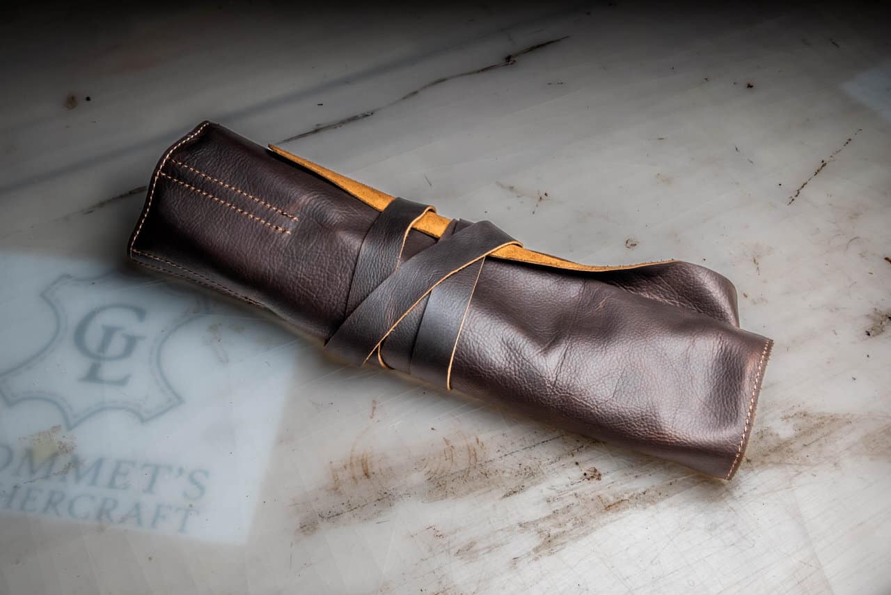Each roll is made out of 4-5 ounce Bison leather with a fold over flap to cover everything when rolled up. The roll features a length of leather that wraps and around and ties to close the roll for transportation.