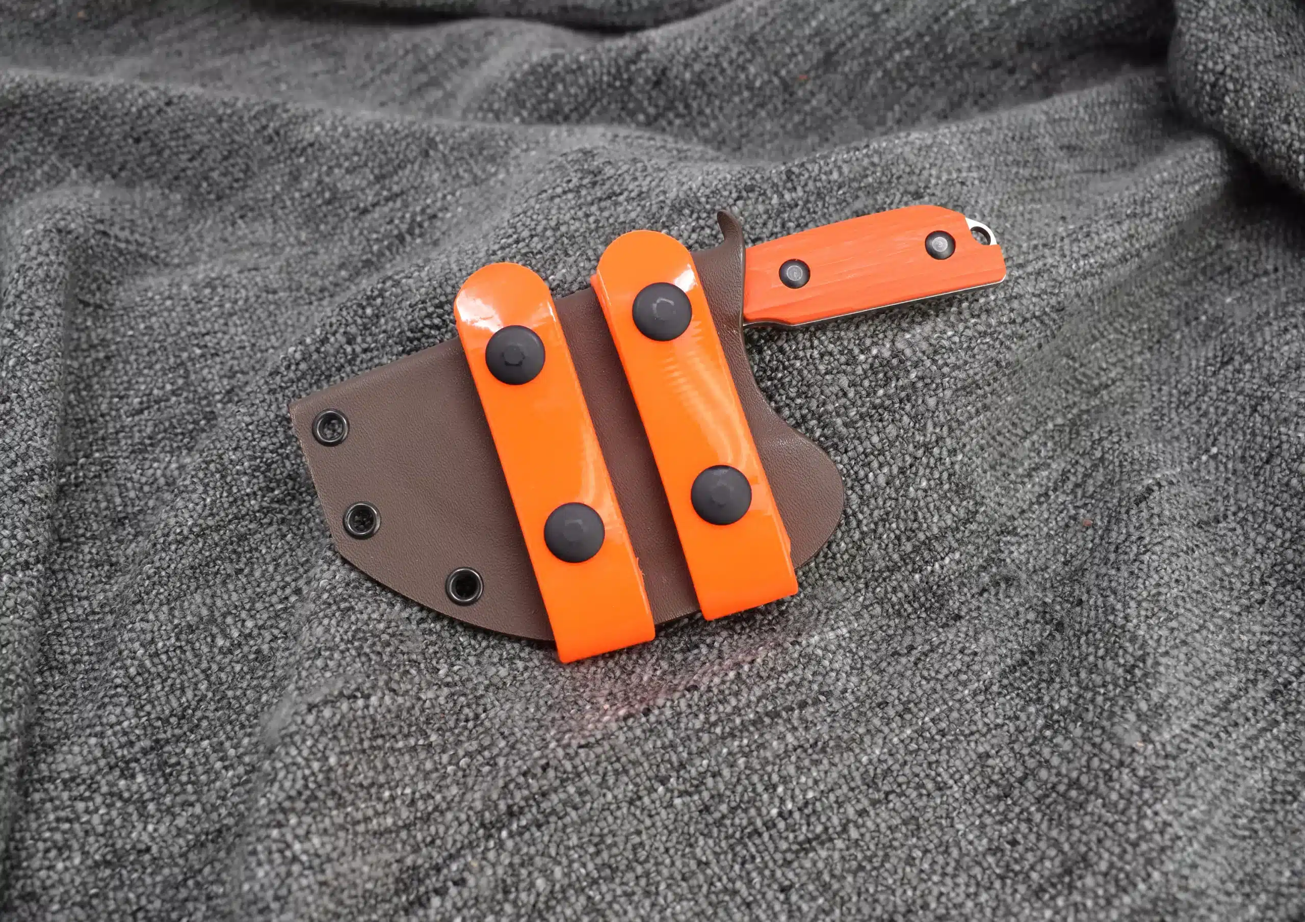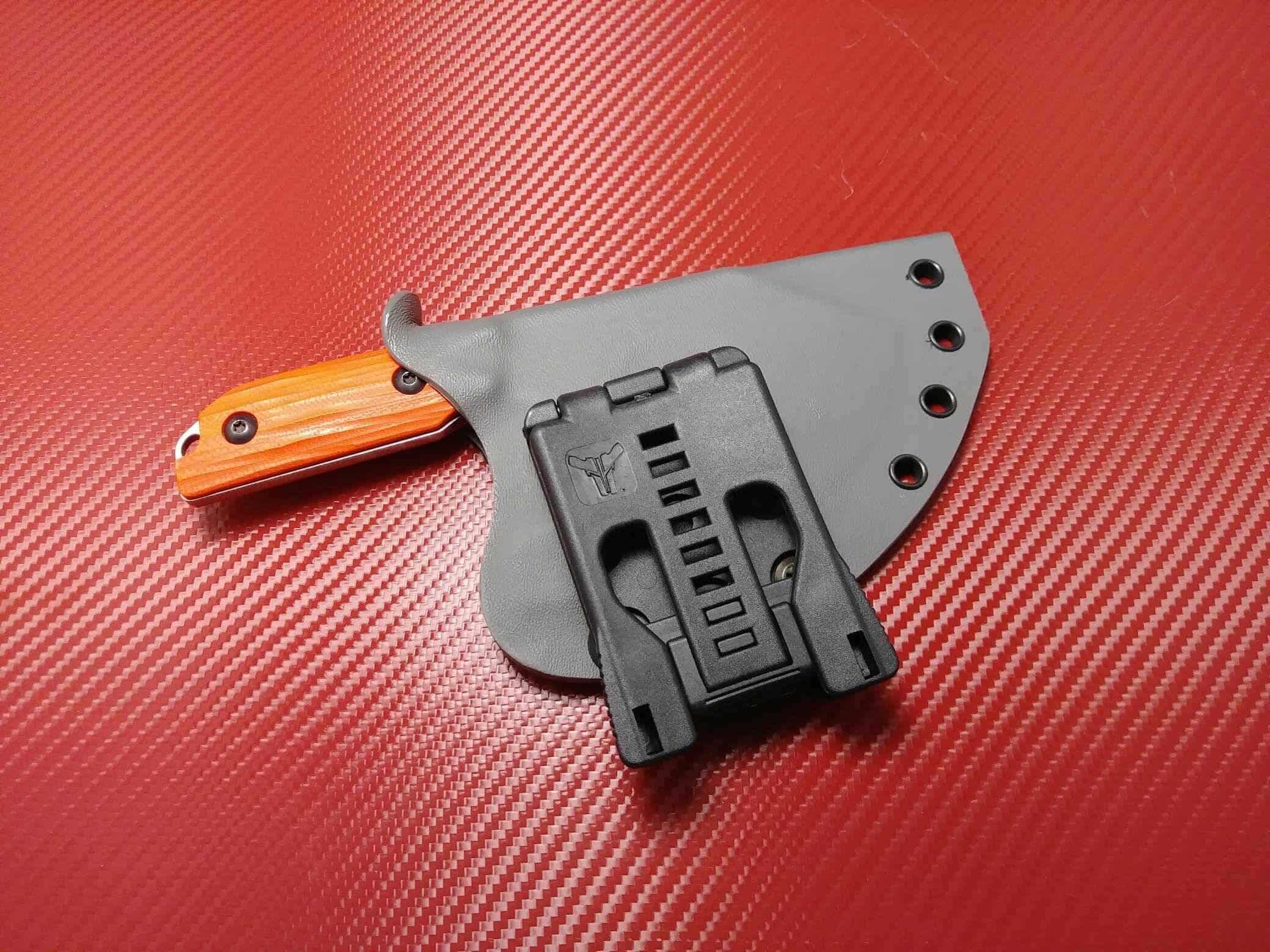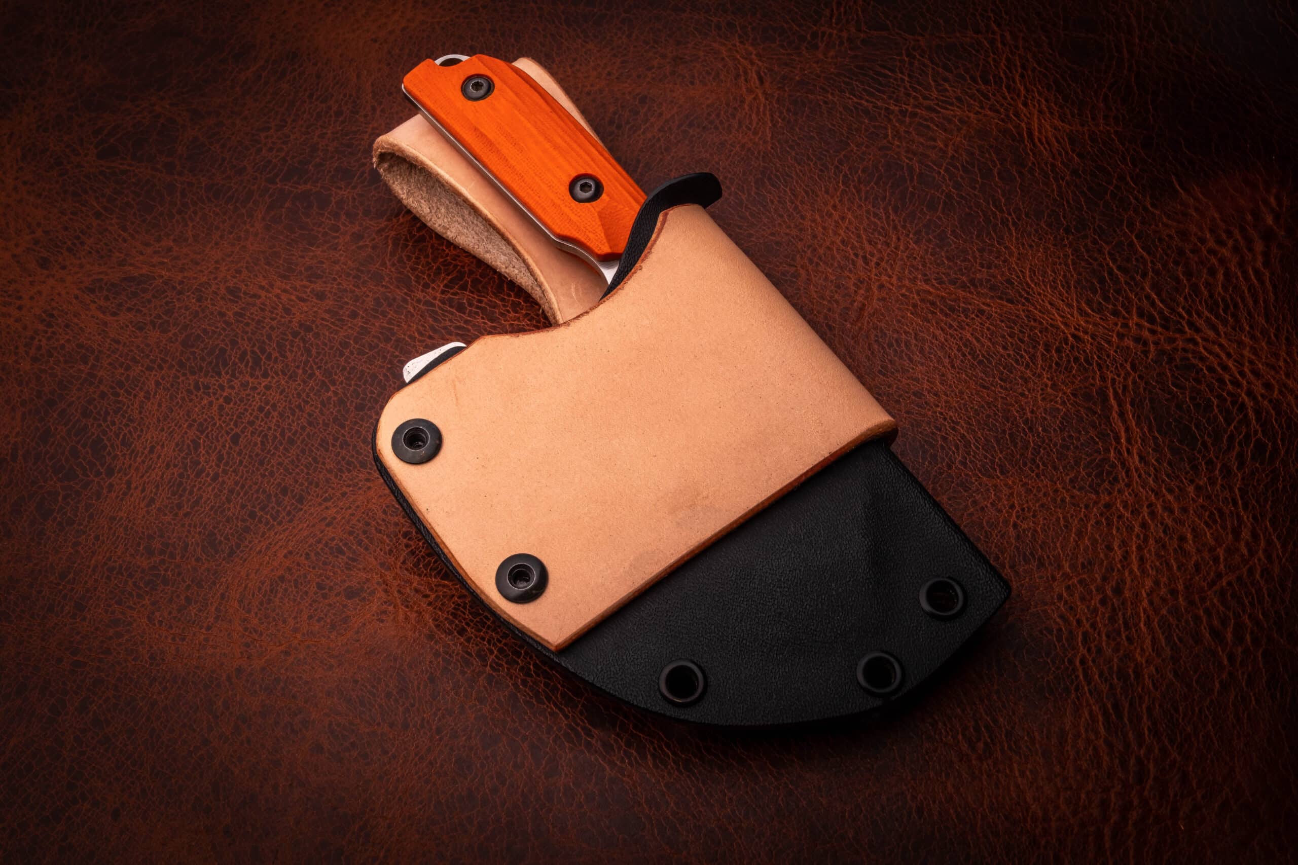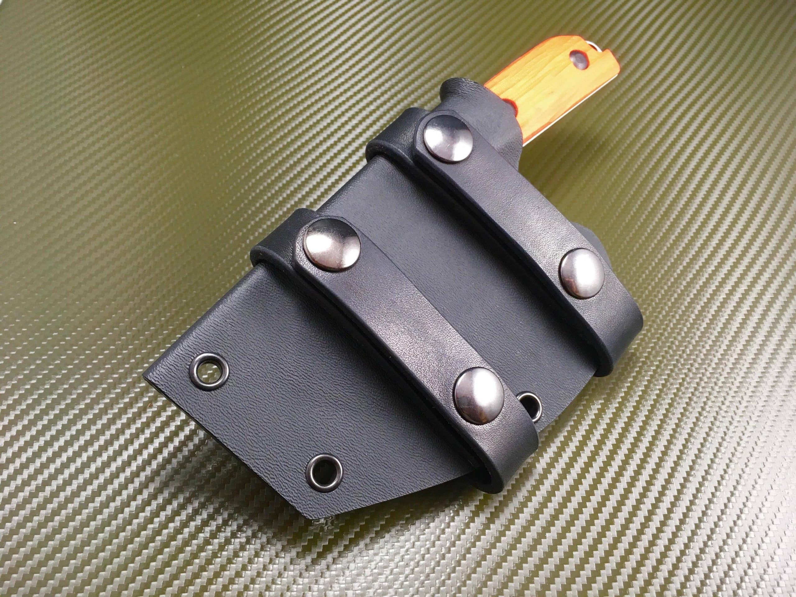 The sheath is an improvement over the plastic sheath that comes stock from Benchmade. It is available in a variety of colors and can be ordered with either a leather or kydex belt loop, There is a thumb groove to assist in drawing the knife and a drain hole in the bottom to prevent fluid buildup.