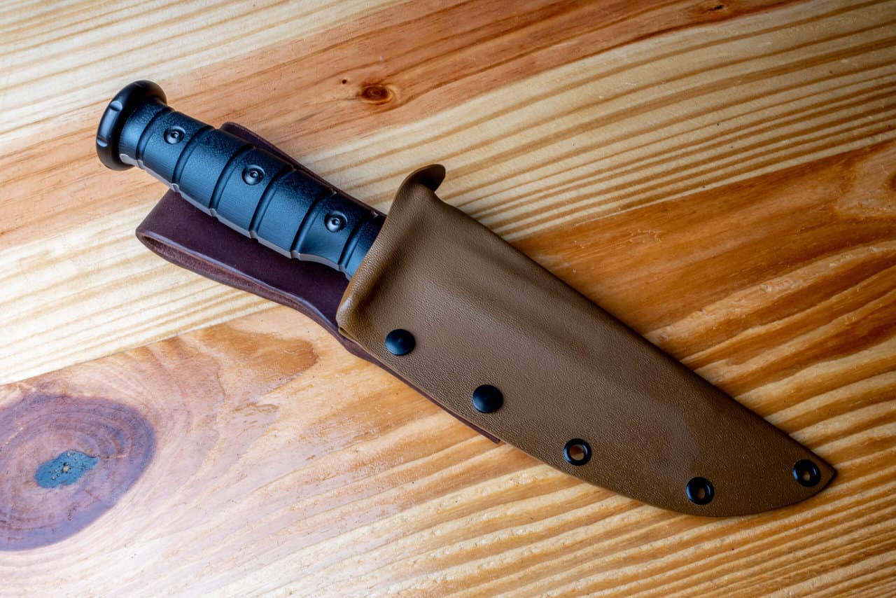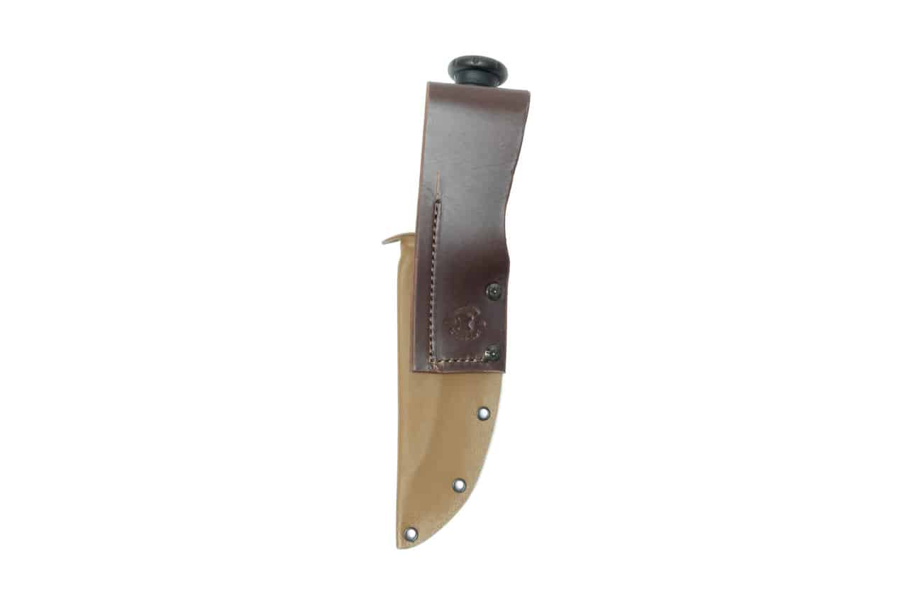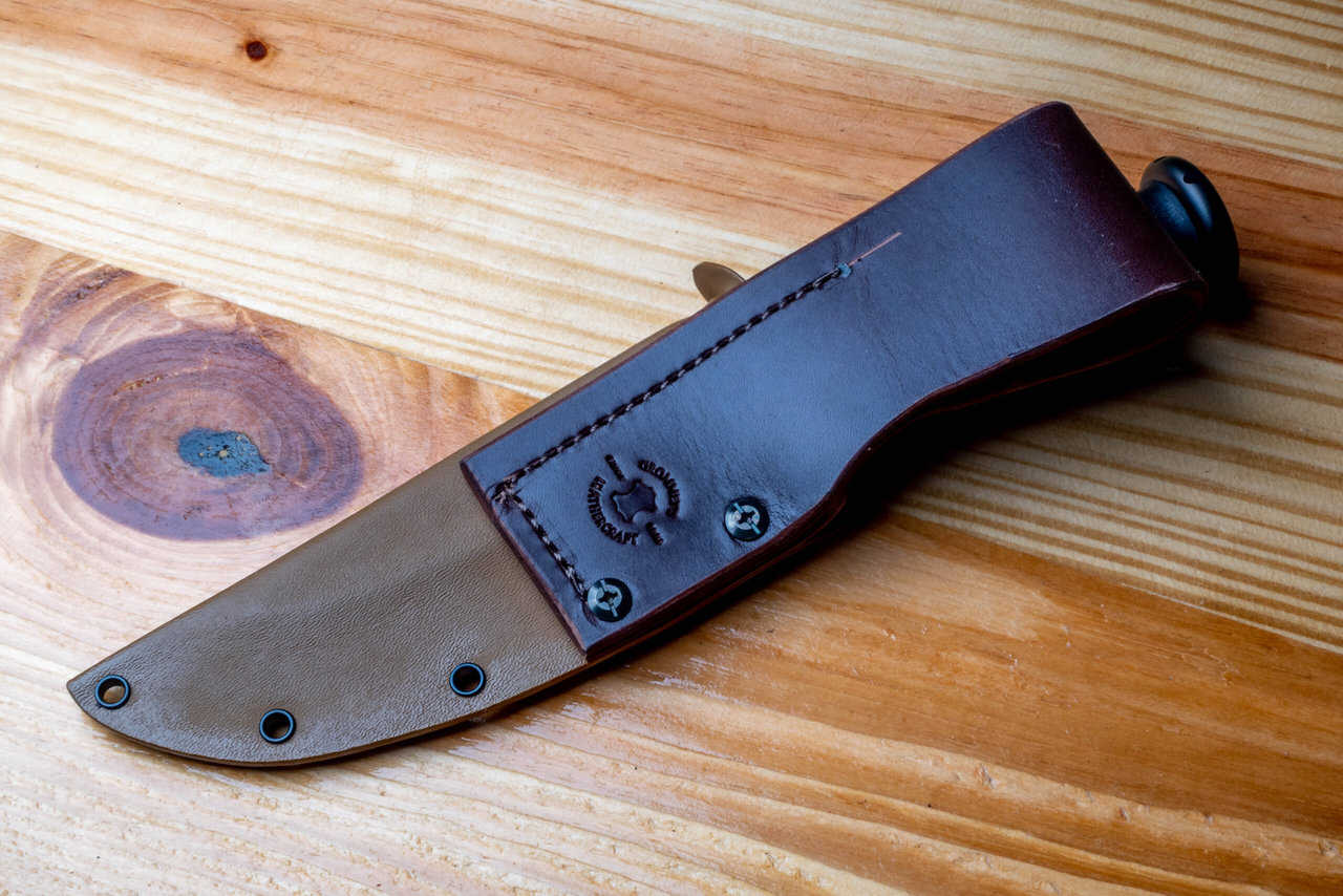 The sheath is an alternative to the leather sheath that comes stock from MKT. It is available in a variety of colors and can be ordered with either a leather or kydex belt loop, and each option can be ordered with a retention strap that snaps around the handle to keep the knife from bouncing around. There is a thumb groove to assist in drawing the knife and a drain hole in the bottom to prevent fluid buildup.
