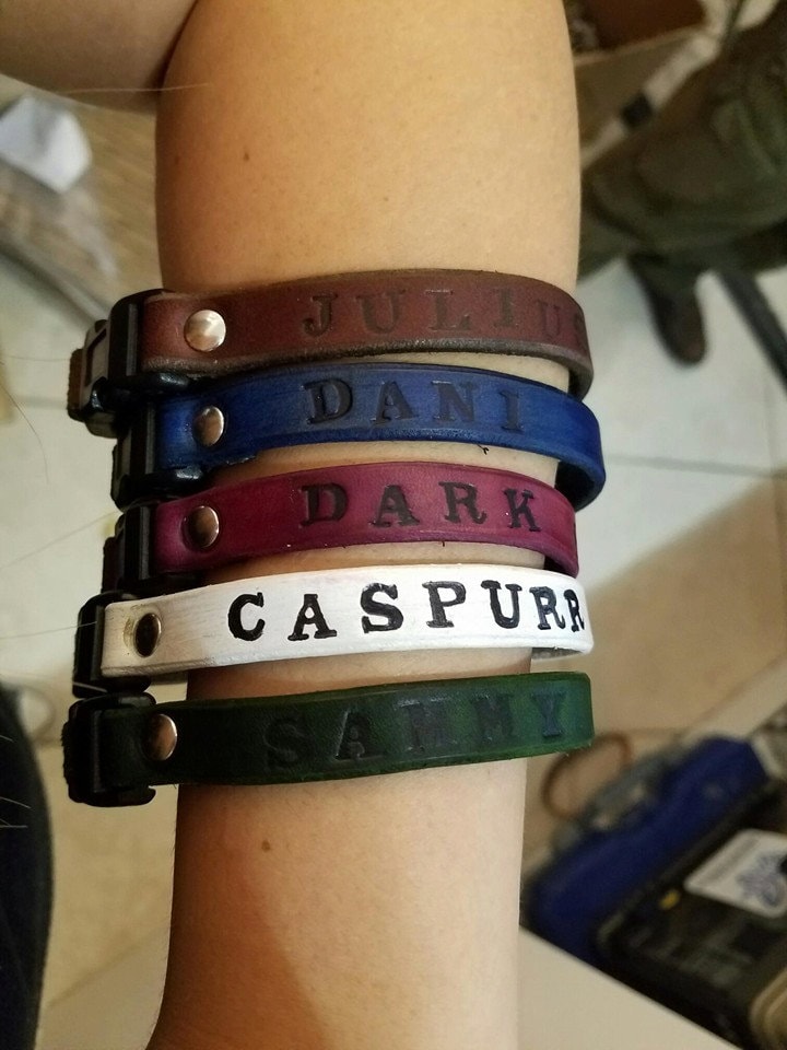 Each collar is handmade out of vegetable tanned cowhide, and can be dyed in a number of different colors.