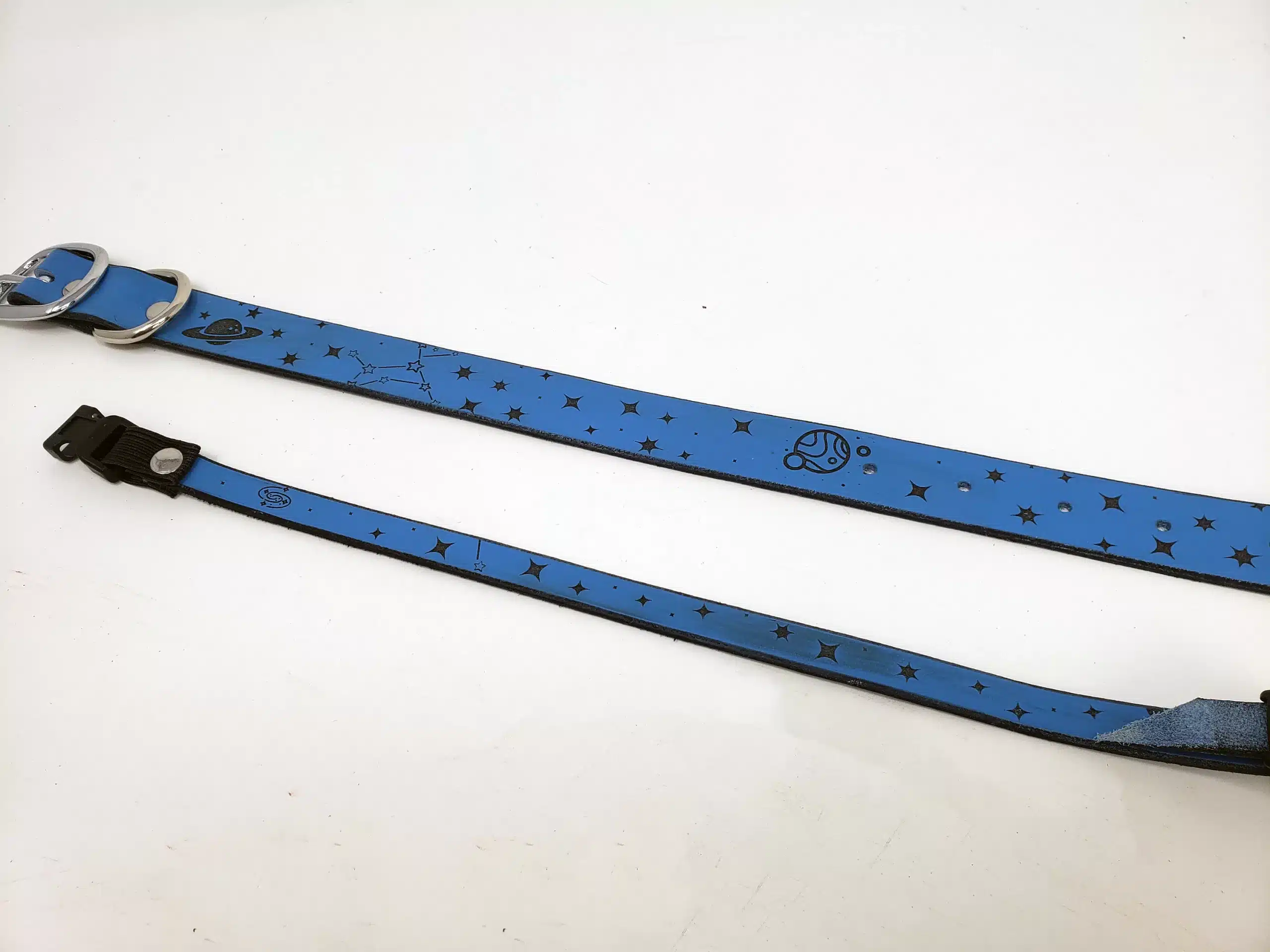 Each collar is secured via a curved squeeze buckle, and is adjustable to fit up to a 12″ neck.
