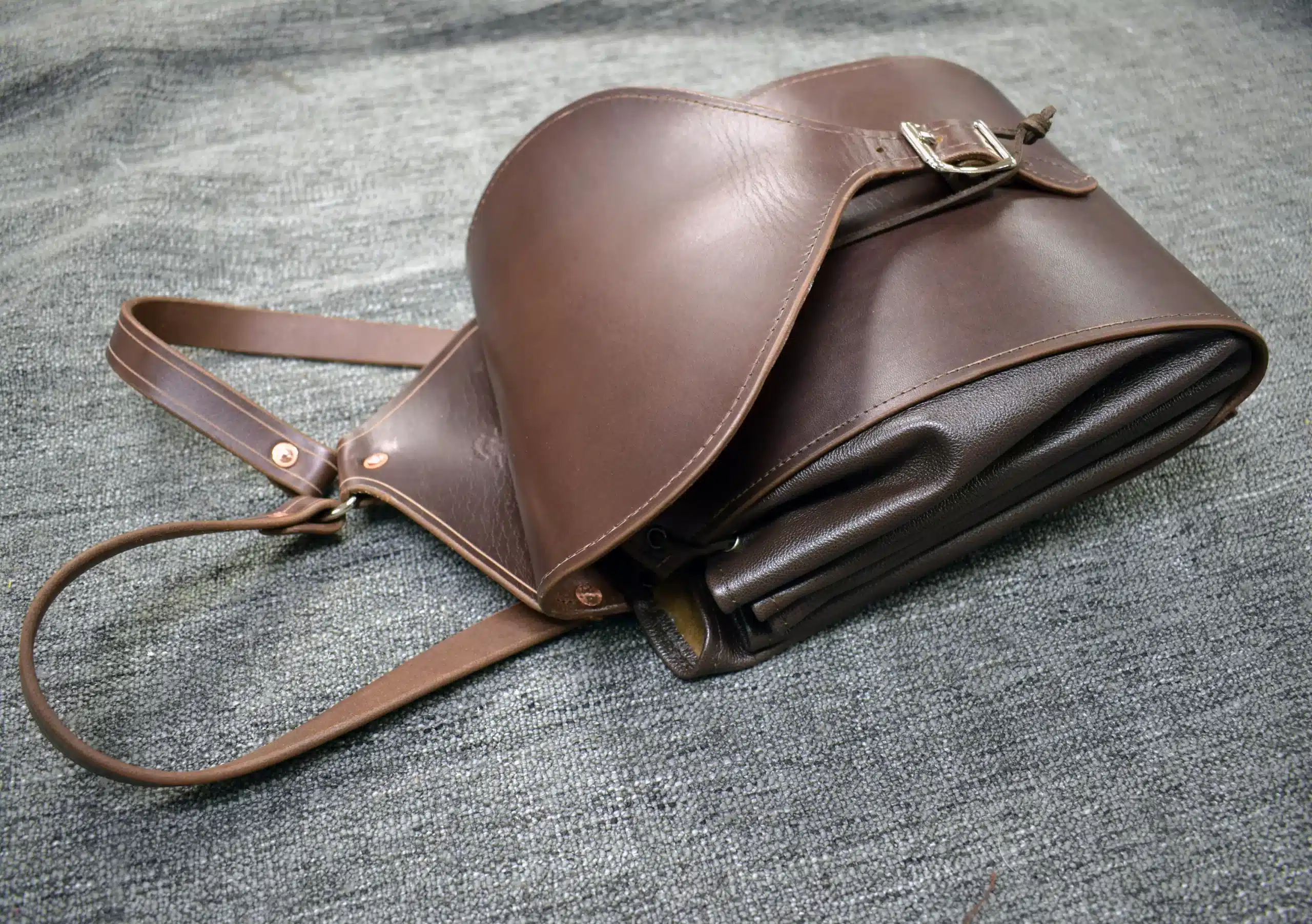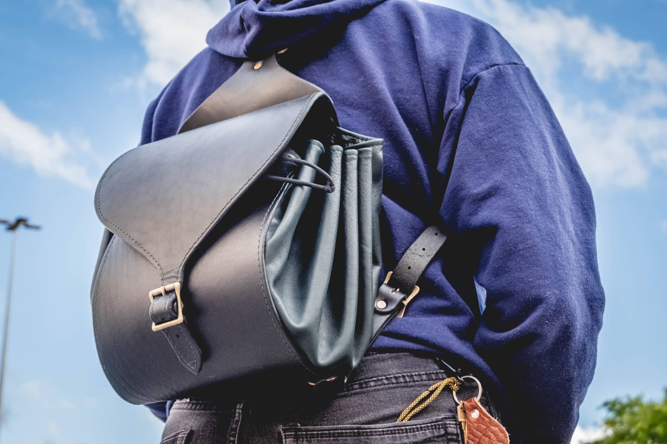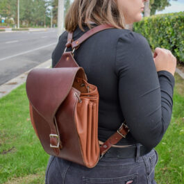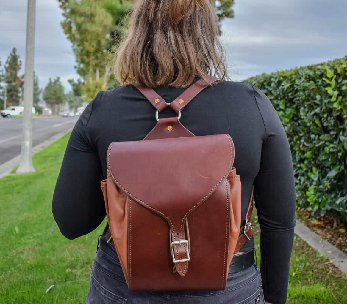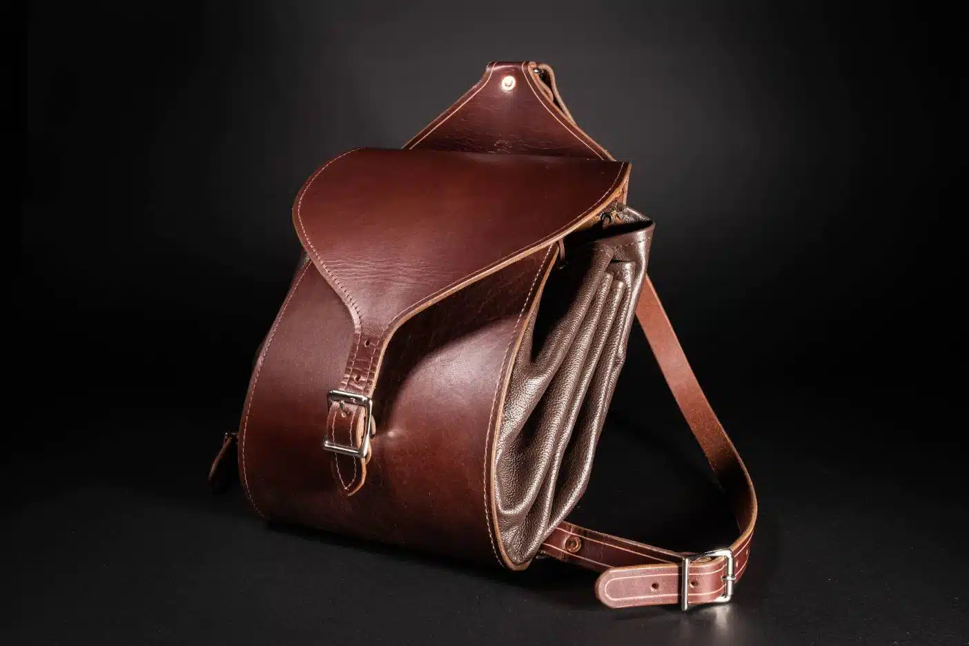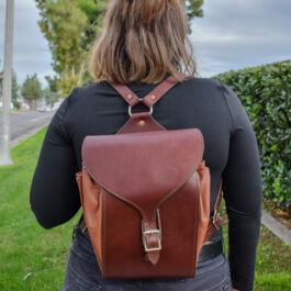 Each of these backpacks is made out of 8-10 ounce latigo cowhide for the main body, flap, and straps, with the bag portion made out of a more supple 3-4 ounce garment cowhide that cinches closed via a leather lace