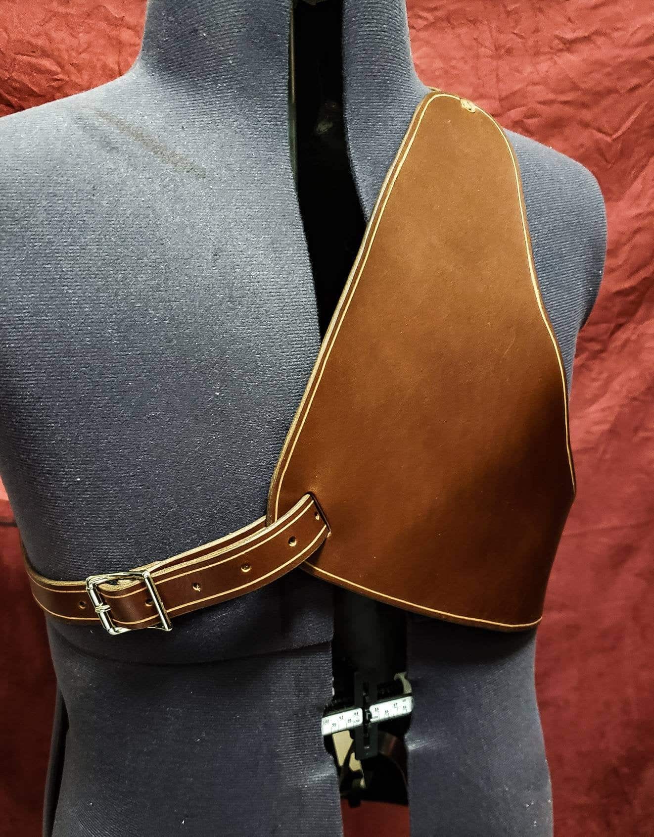Inspired by archers chest protectors, this armor works well to protect your chest while shooting your bow, or during Larp/Cosplay. As shown in the photos, it pairs well with our other armor offerings.