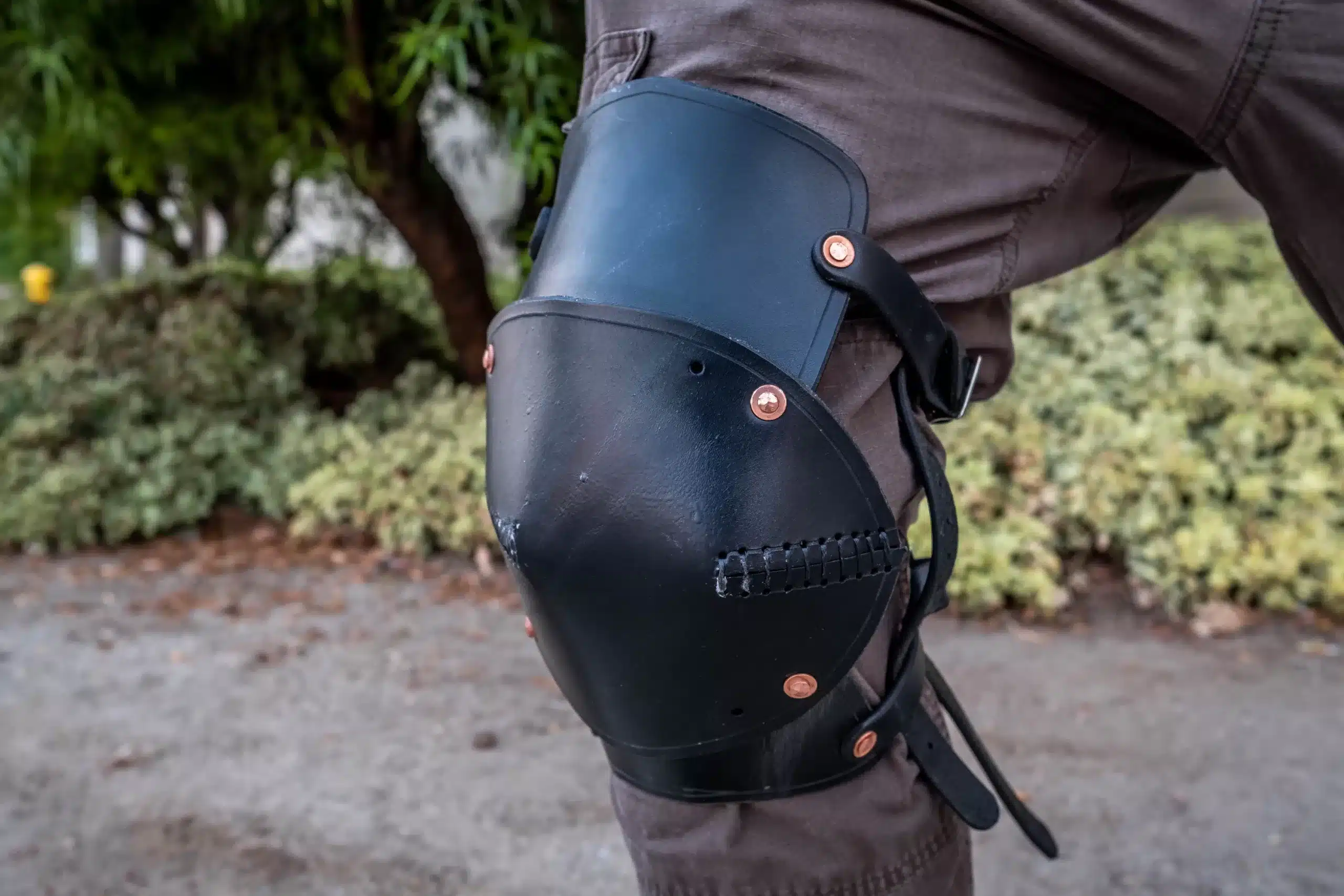 They are constructed much like the elbow armor that I offer, but are obviously larger, and have panels and straps for above and below the knee so keep them securely in place.