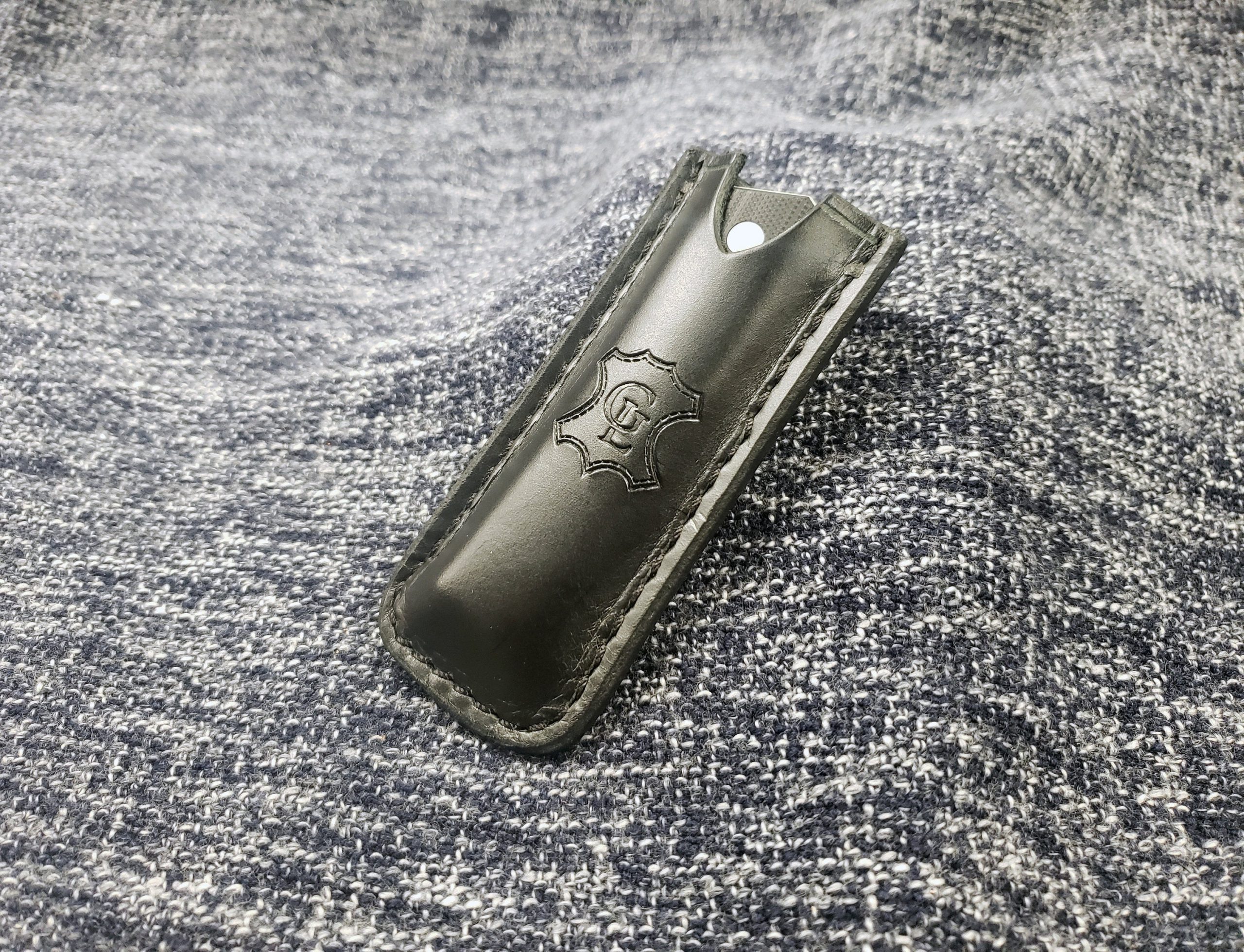 This is a simple leather sleeve that fits the Benchmade 601 Tengu Flipper, or any other similarly sized knife.