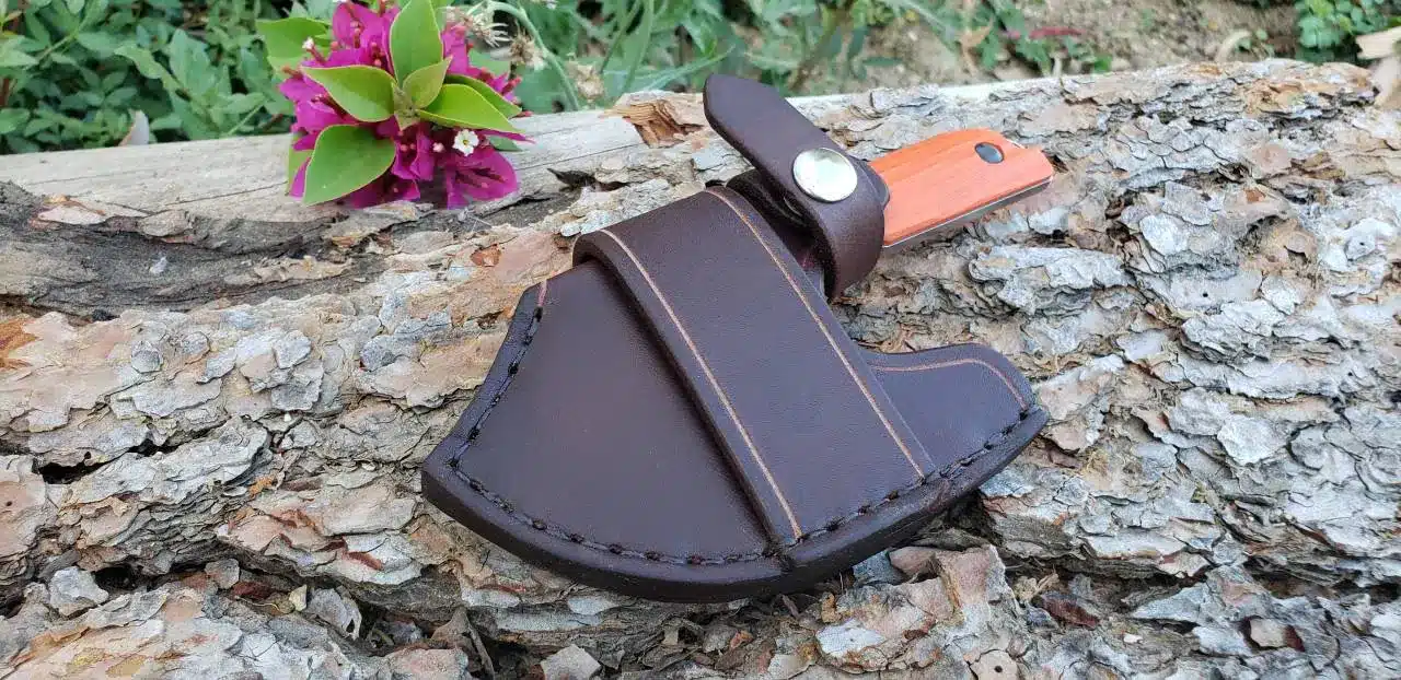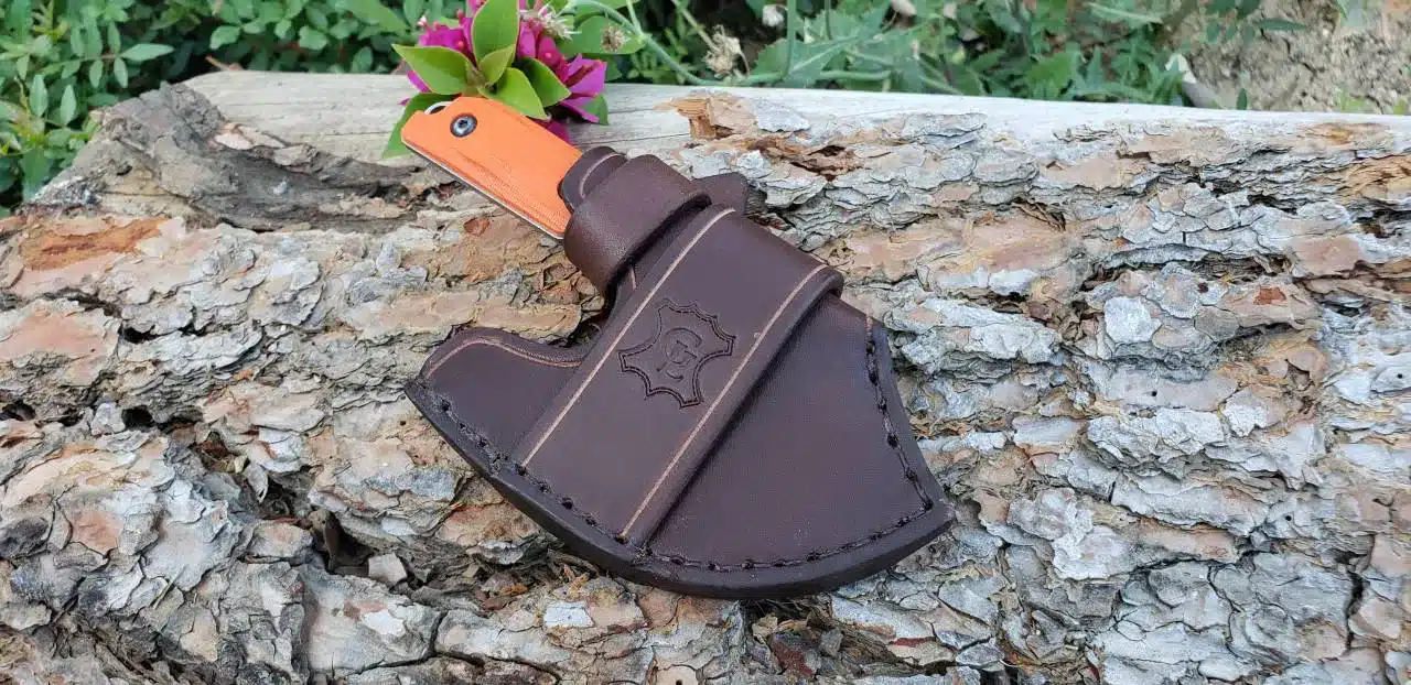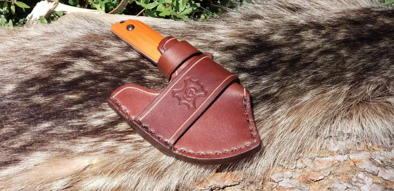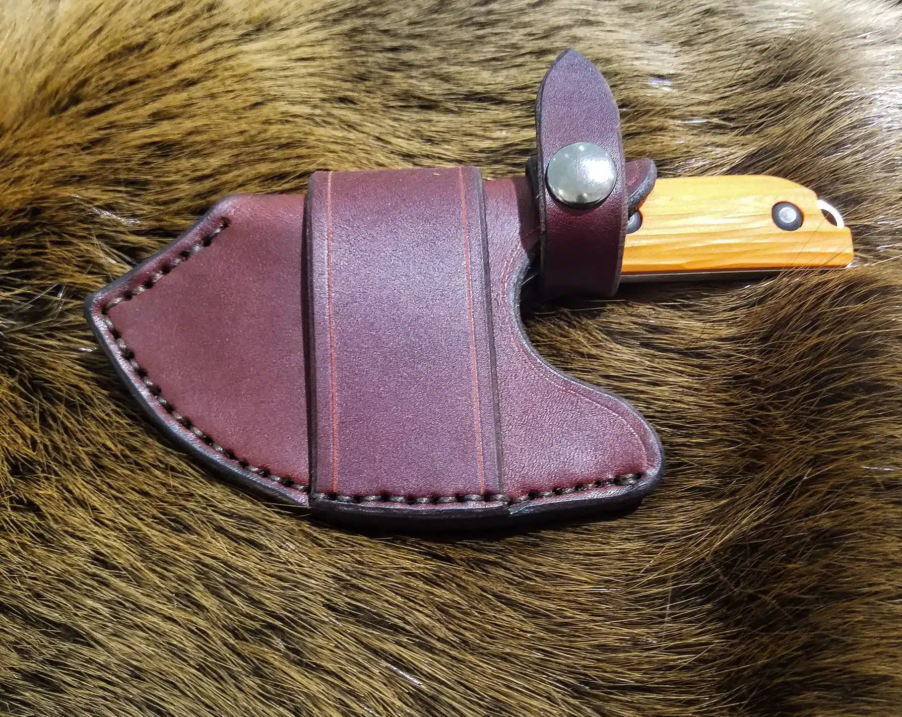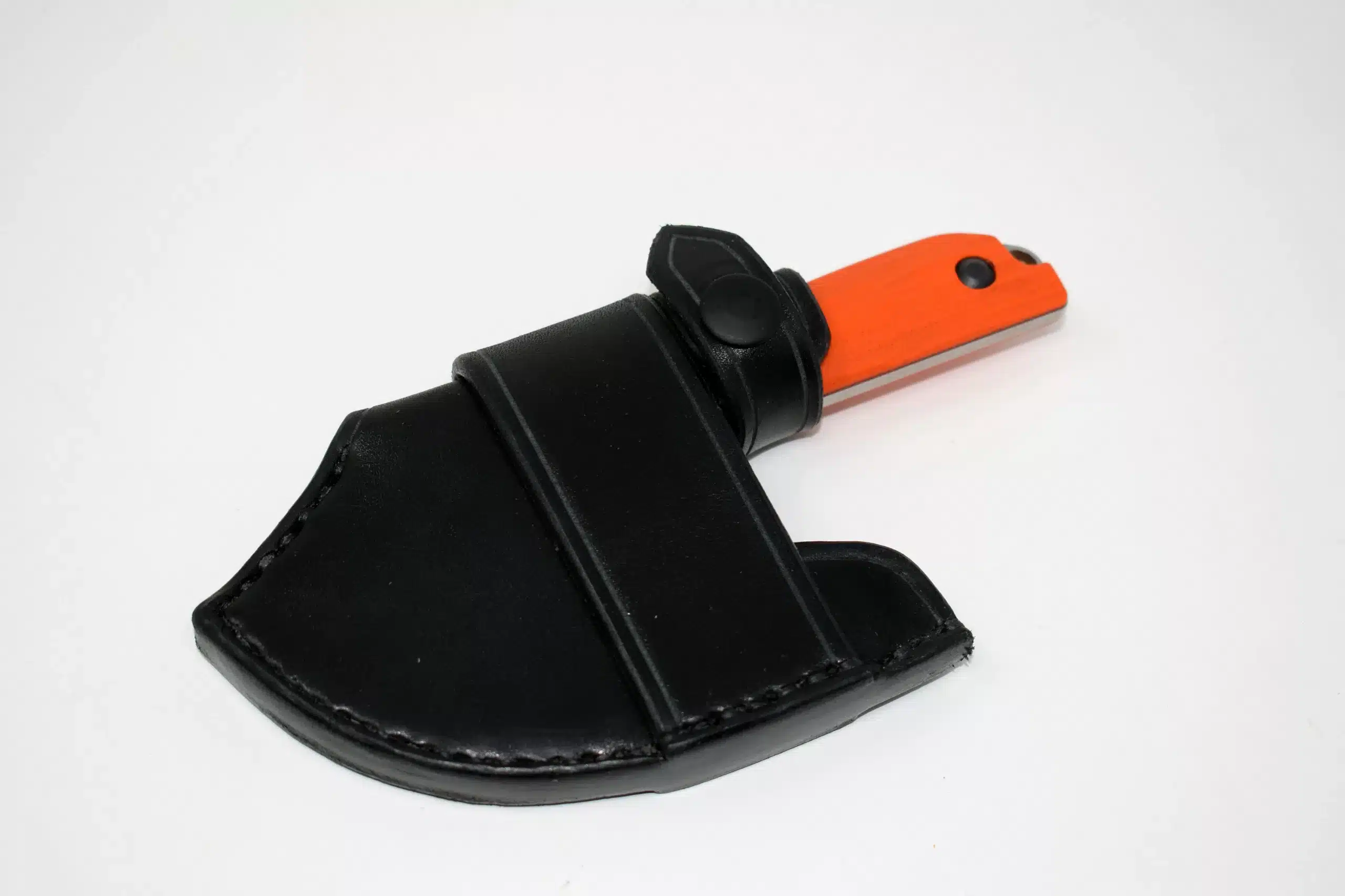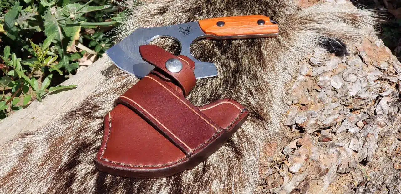 This is a handmade leather sheath for the Benchmade 15100-1 Nestucca Cleaver.