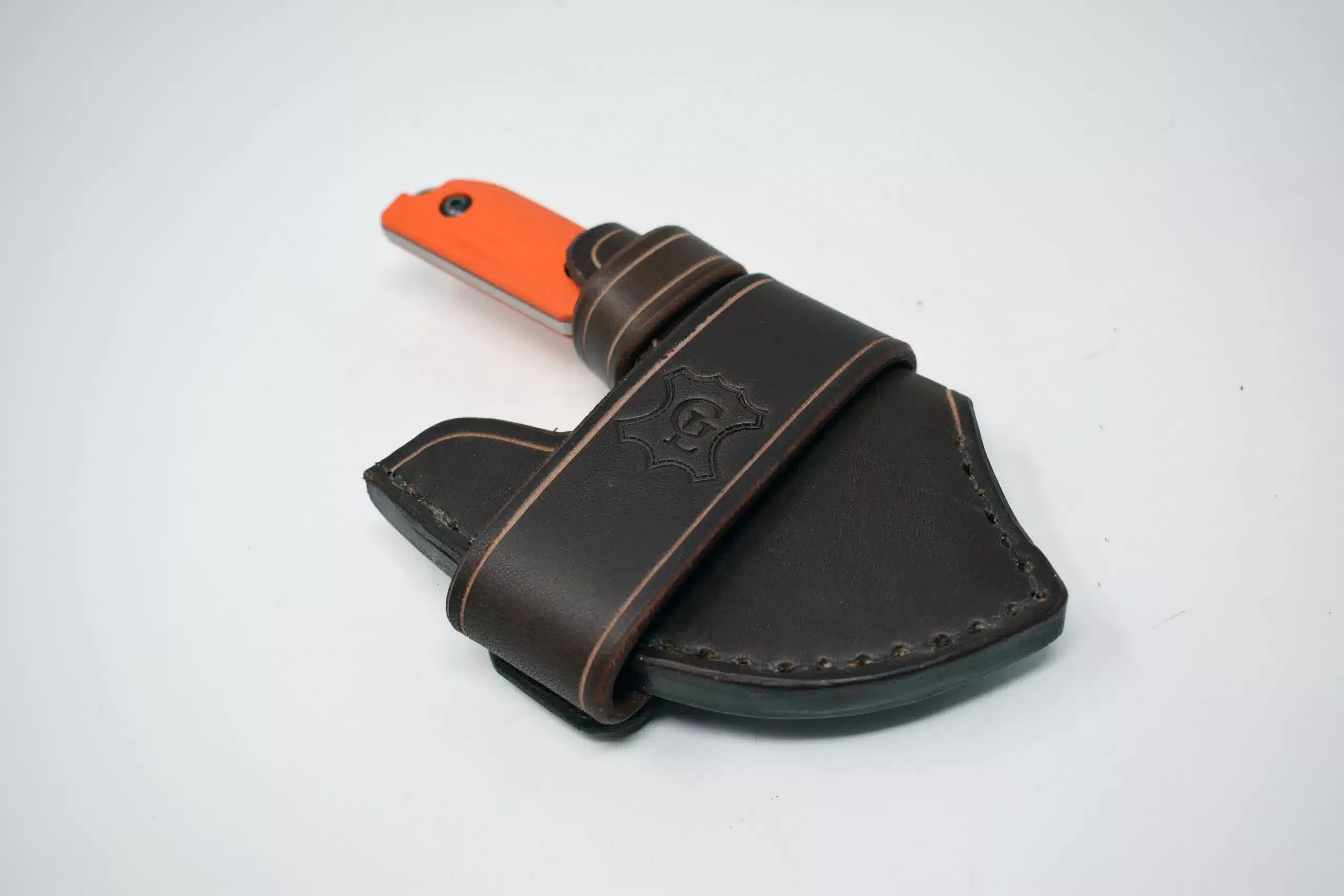 Each sheath is made out of 8-10 ounce latigo cowhide and features a double snap-closure loop for attaching the sheath horizontally to your belt, as well as a snap closure retention strap around the handle.