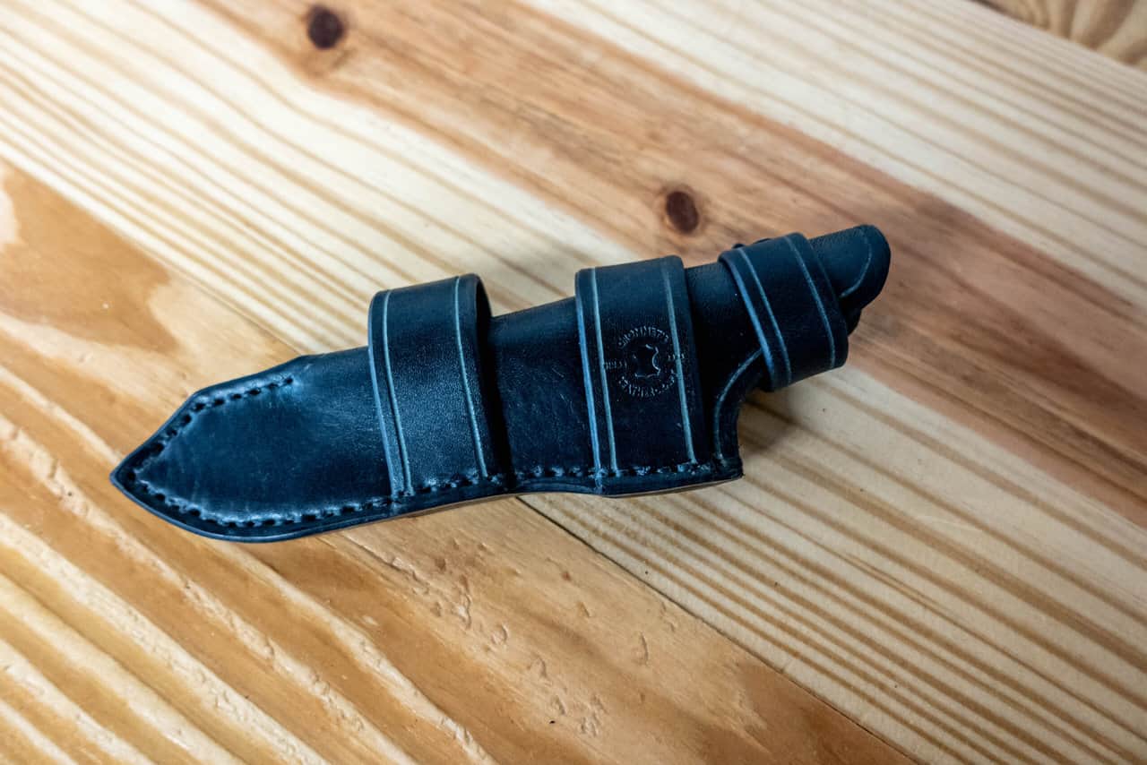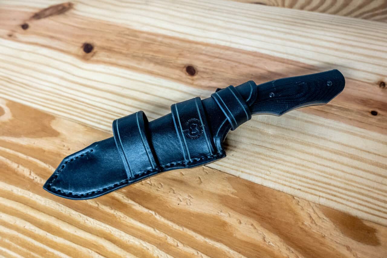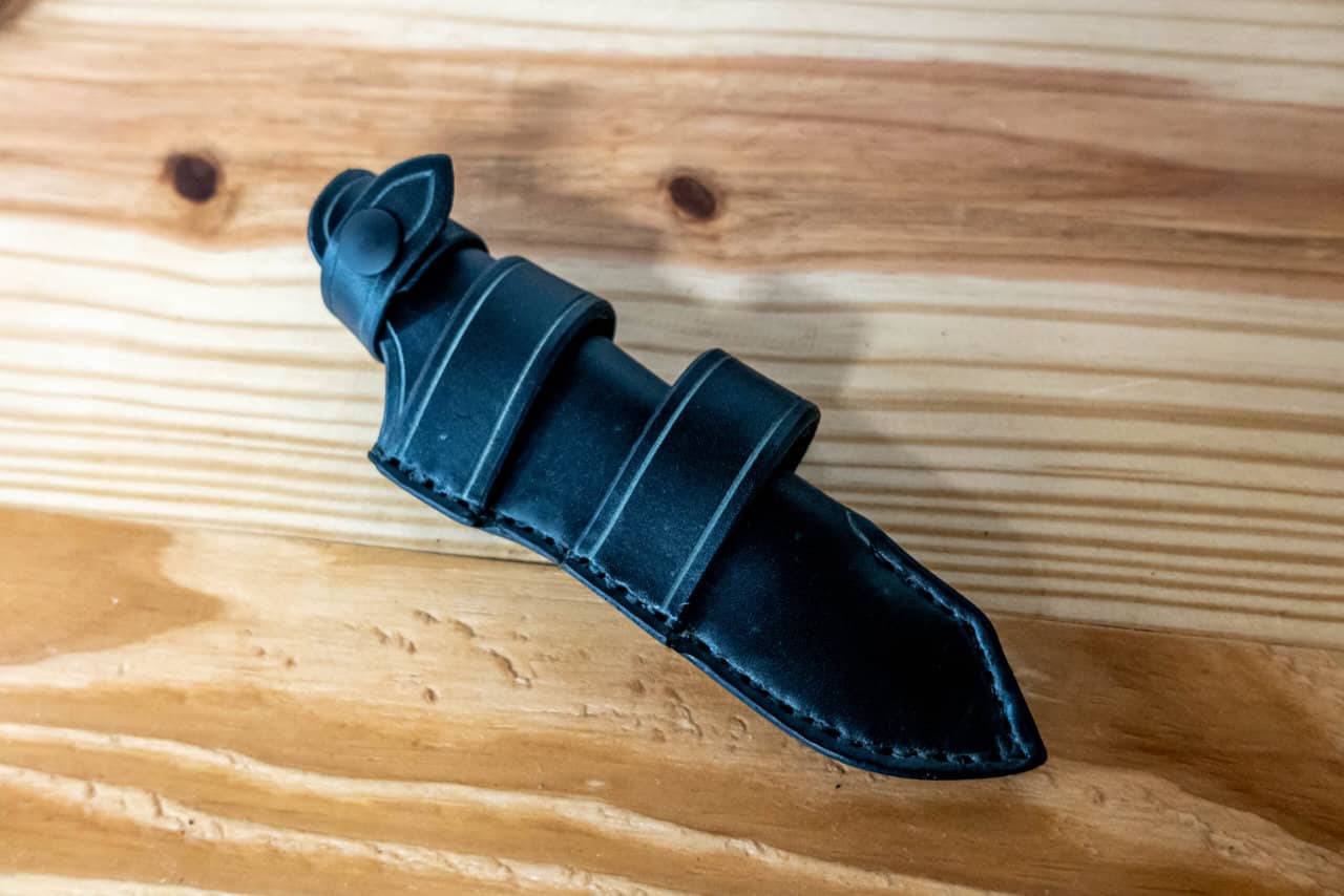 It is hand-stitched out of 8-10 ounce latigo cowhide, (or 8-10 ounce vegetable tanned cowhide if the “natural” color is chosen) and features an integrated belt loop, and snap closure that loops over the guard to secure the knife in the sheath.