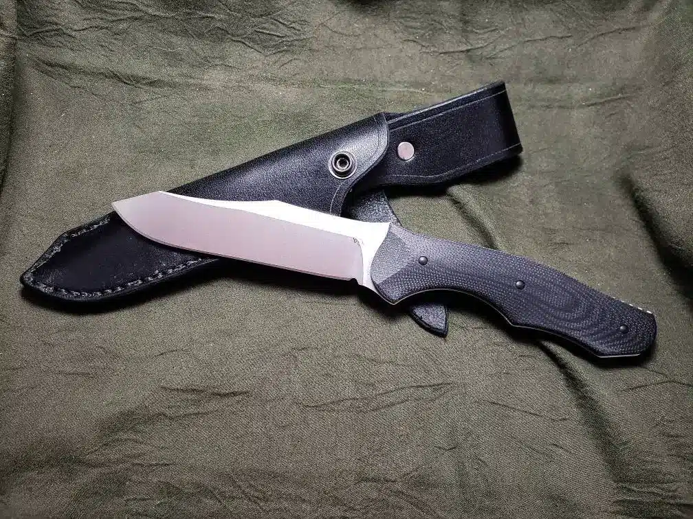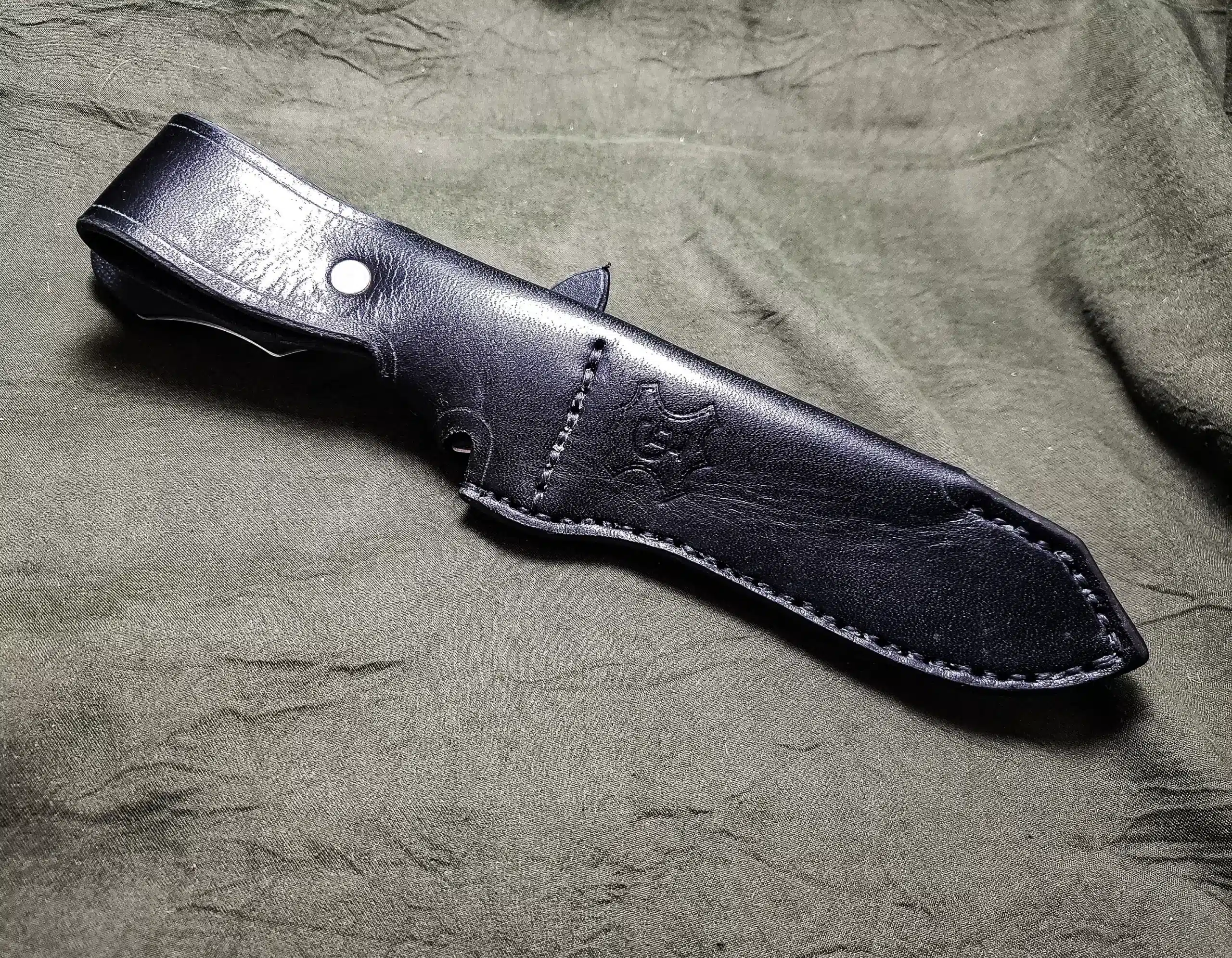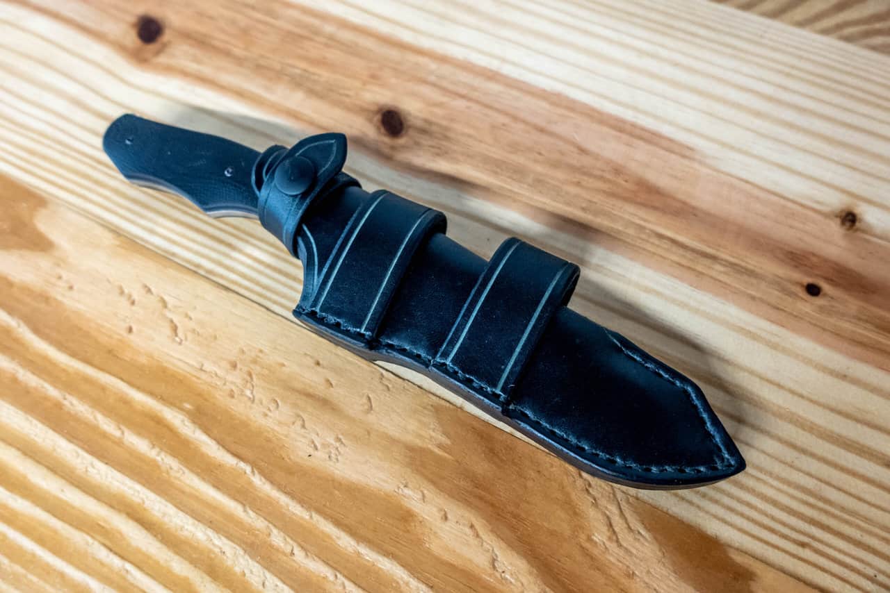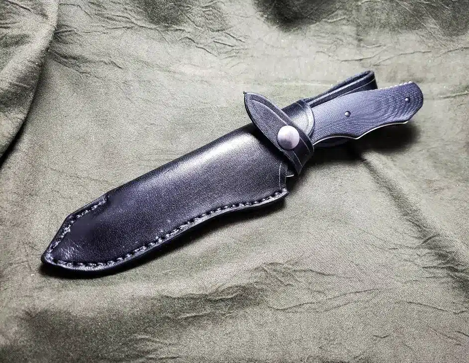 It is hand-stitched out of 8-10 ounce latigo cowhide, (or 8-10 ounce vegetable tanned cowhide if the “natural” color is chosen) and features an integrated belt loop, and snap closure that loops over the guard to secure the knife in the sheath.