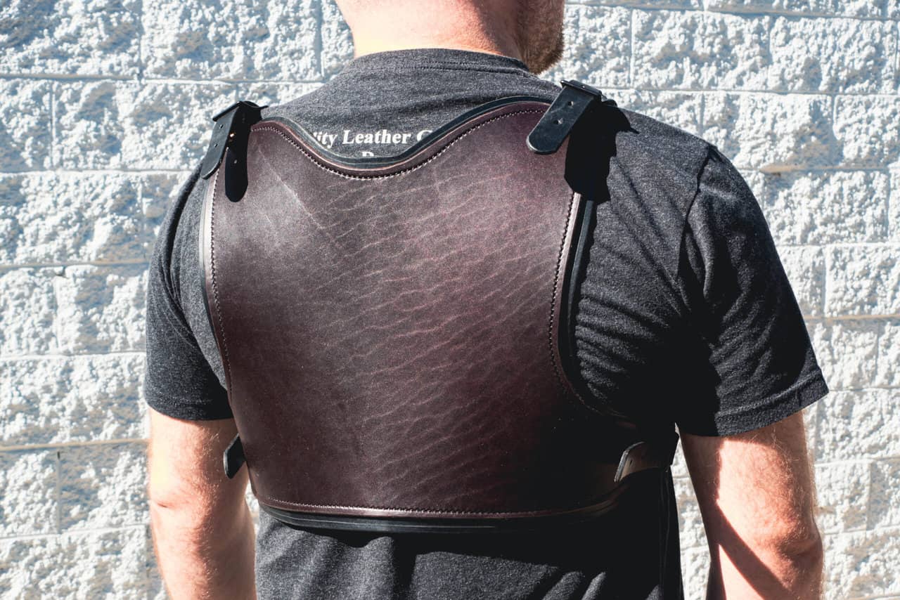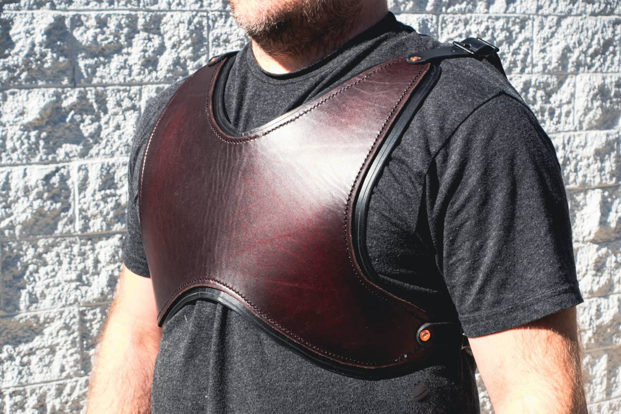 Essentially our leather chest protector, with an added back piece, this armor works well to protect your upper chest during HEMA/ Sport Fencing or during Larp/Cosplay.