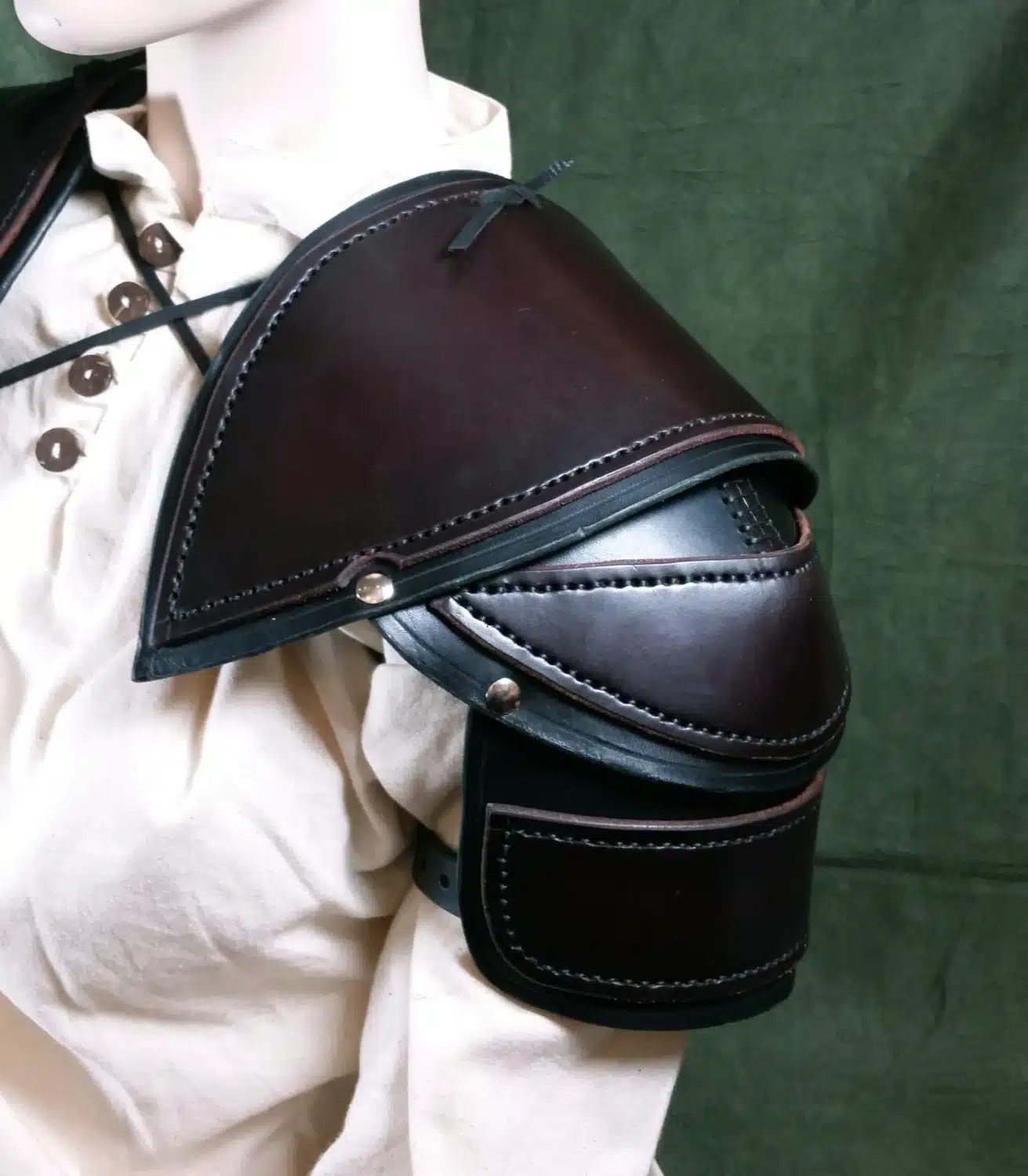 This listing is for a pair of leather Shoulder (Spaulder) armor. These are very similar to style 3, with a more angular top section. They do not offer as much coverage as the style 1 shoulder armor, but have more points of articulation, so allow a greater range of movement.