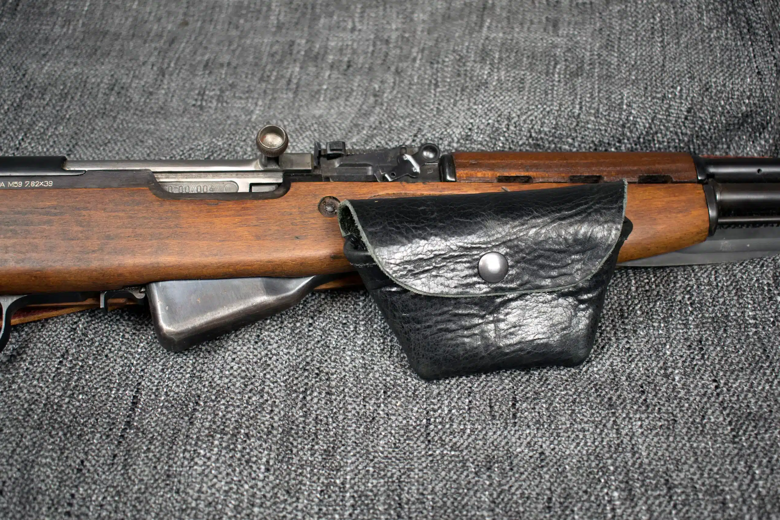 This is a handmade belt pouch that holds 2 stripper clips for an SKS or for stripper clips of a similar size.