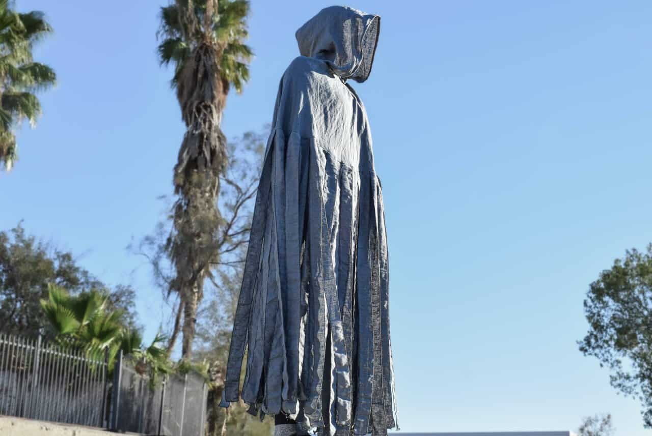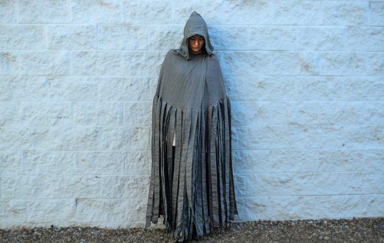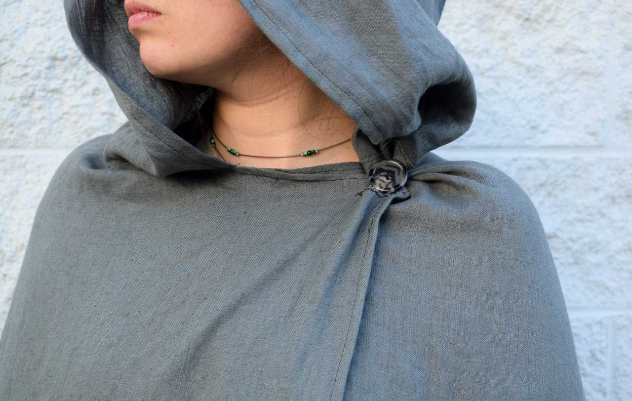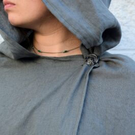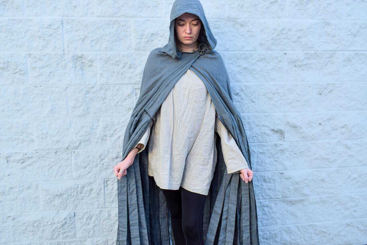 Each cloak is handmade out of the same medium weight linen as our standard hooded cloak. They each have a solid mantlepiece and generous one piece hood. Each of the strips are serged on both sides to keep from fraying. The standard length for these cloaks is 50″, but feel free to reach out if you’d like yours made longer or shorter.