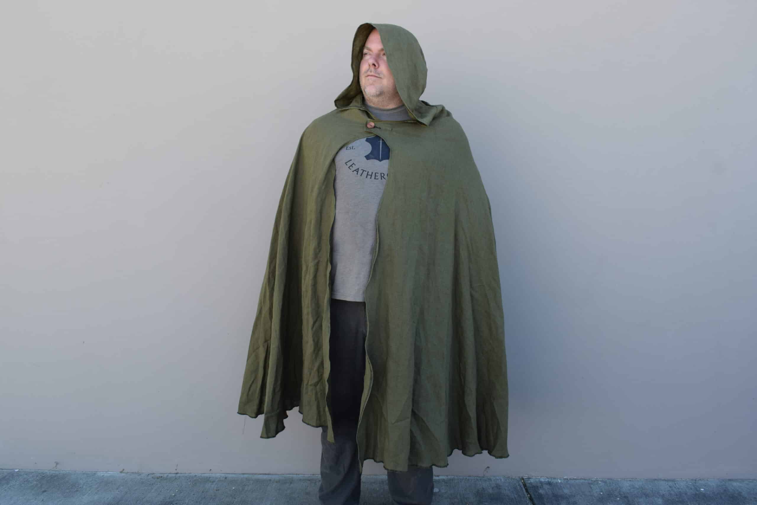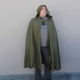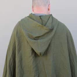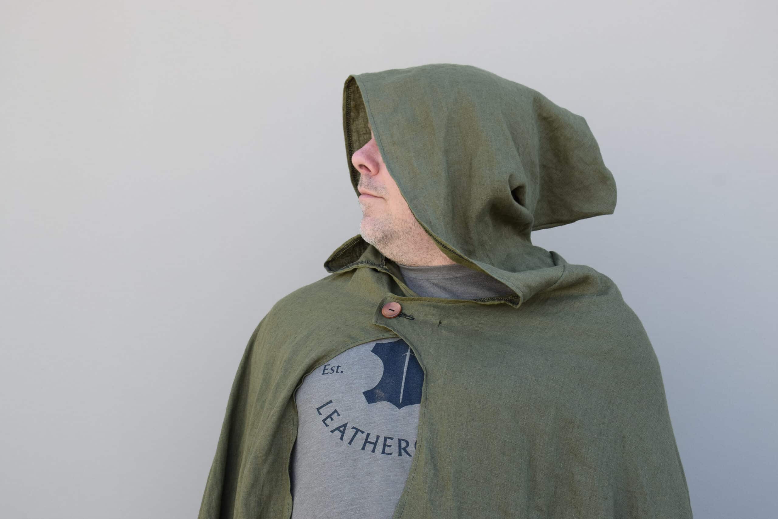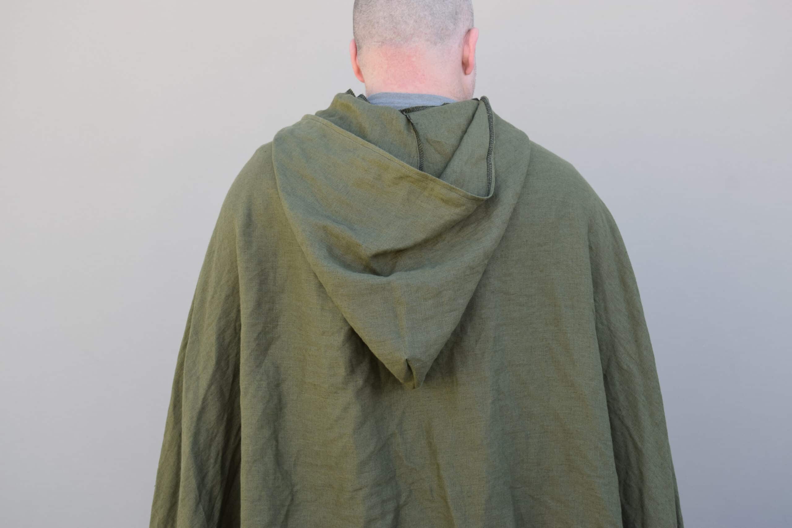 These are simple hooded cloaks made out of a medium weight linen. Similar in style to our linen hooded cloaks, but with a larger hood, shorter length, and overlapping button closure, making for a much more cozy cloak than the standard, perfect for enjoying a simple life.