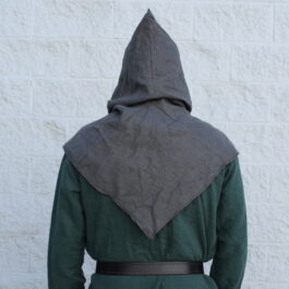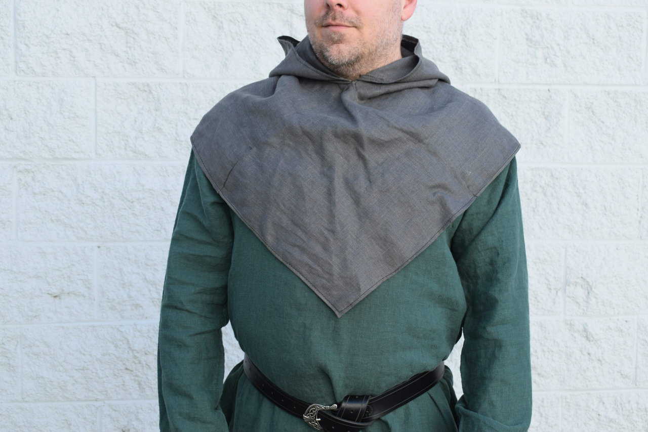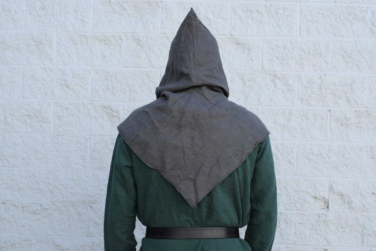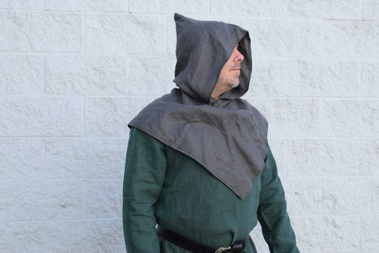 The hood fits over your head, and can be paired with a hoodless cloak, or worn alone. The linen is relatively lightweight and breaths well, making these hoods perfect for warmer weather.