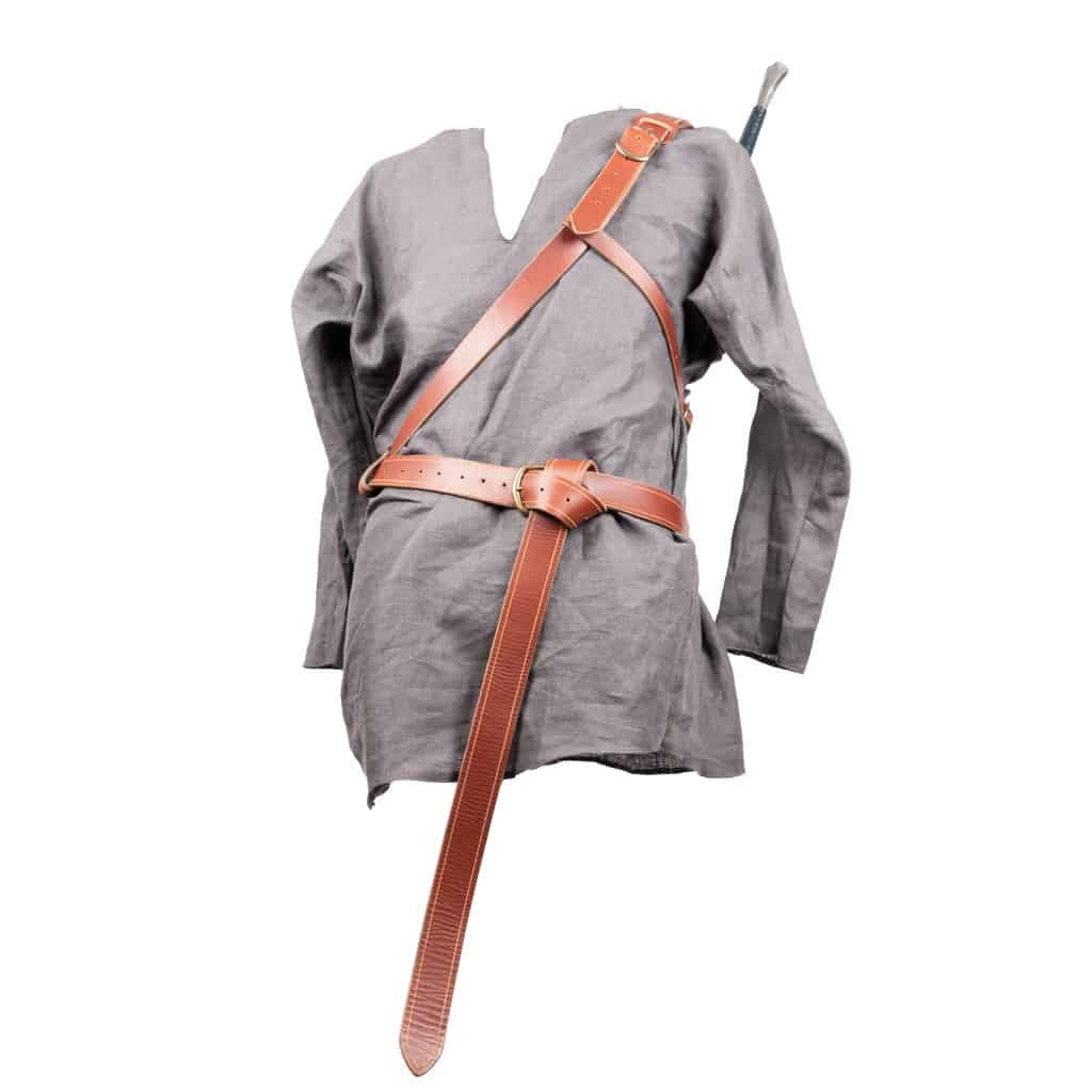 Each harness is made out of 8-10 ounce latigo cowhide with an adjustable shoulder strap that is anchored to a loop that the included swordbelt loops through. There is also a smaller buckles strap that goes under your arm for added support.