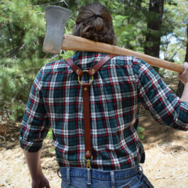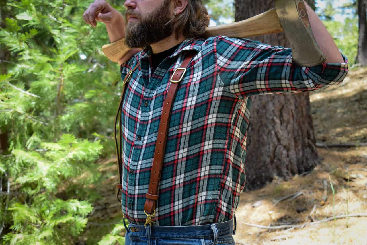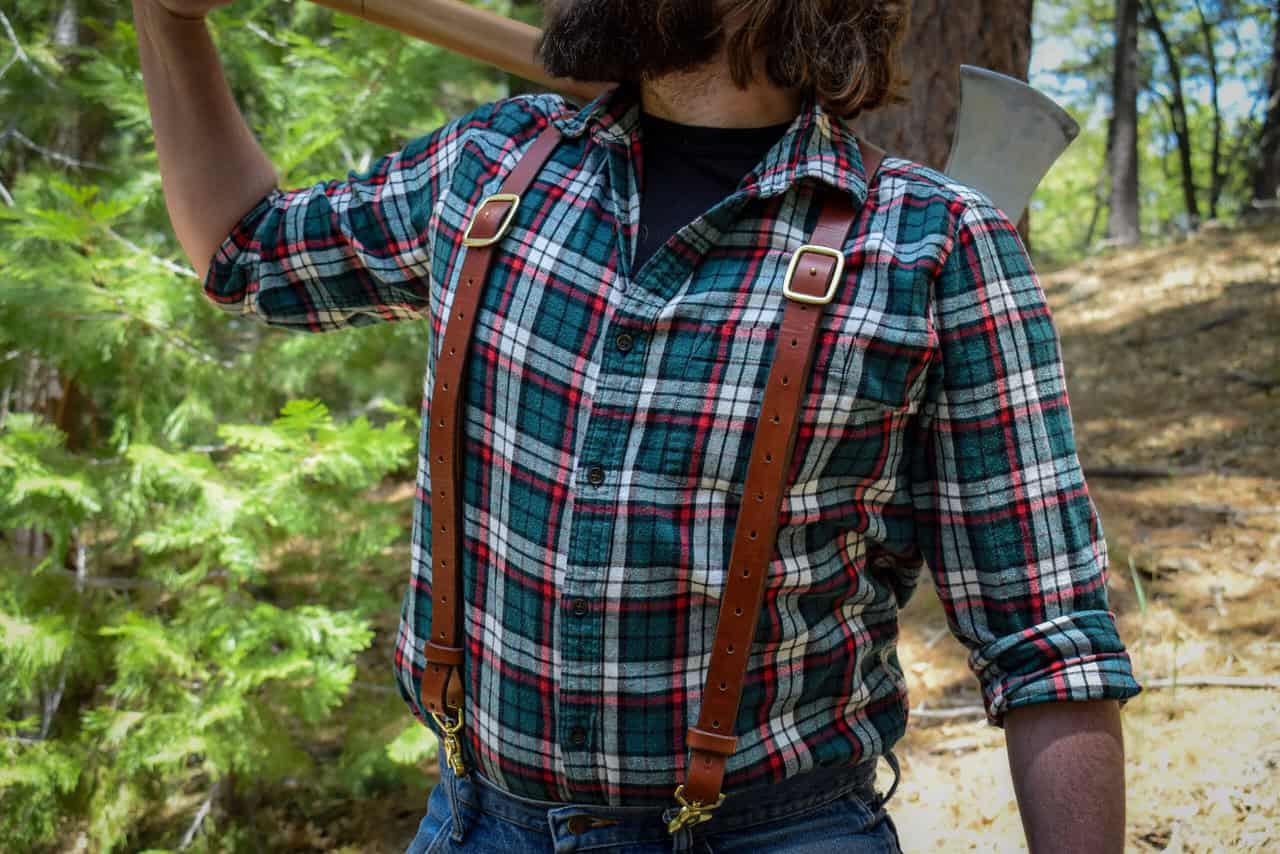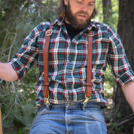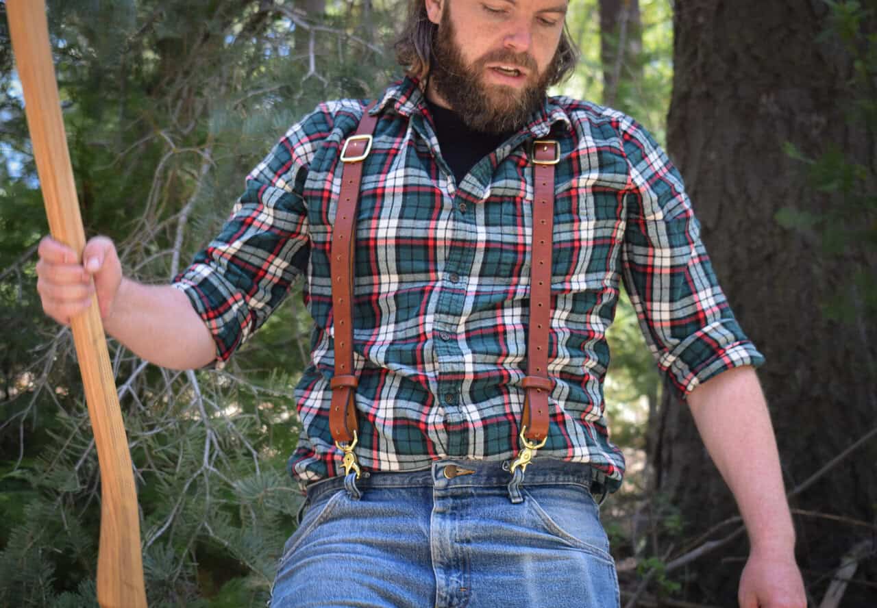 These are a set of leather suspenders. These are slightly more heavy duty than our other suspender options, made with heavier weight hardware, and fewer moving parts. You don’t have to cut down trees for a living to wear them, but they’re more than up to the task.