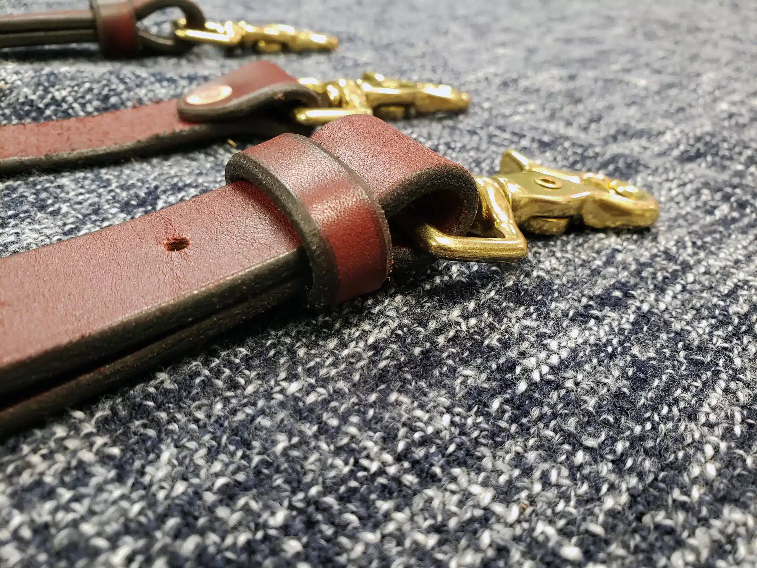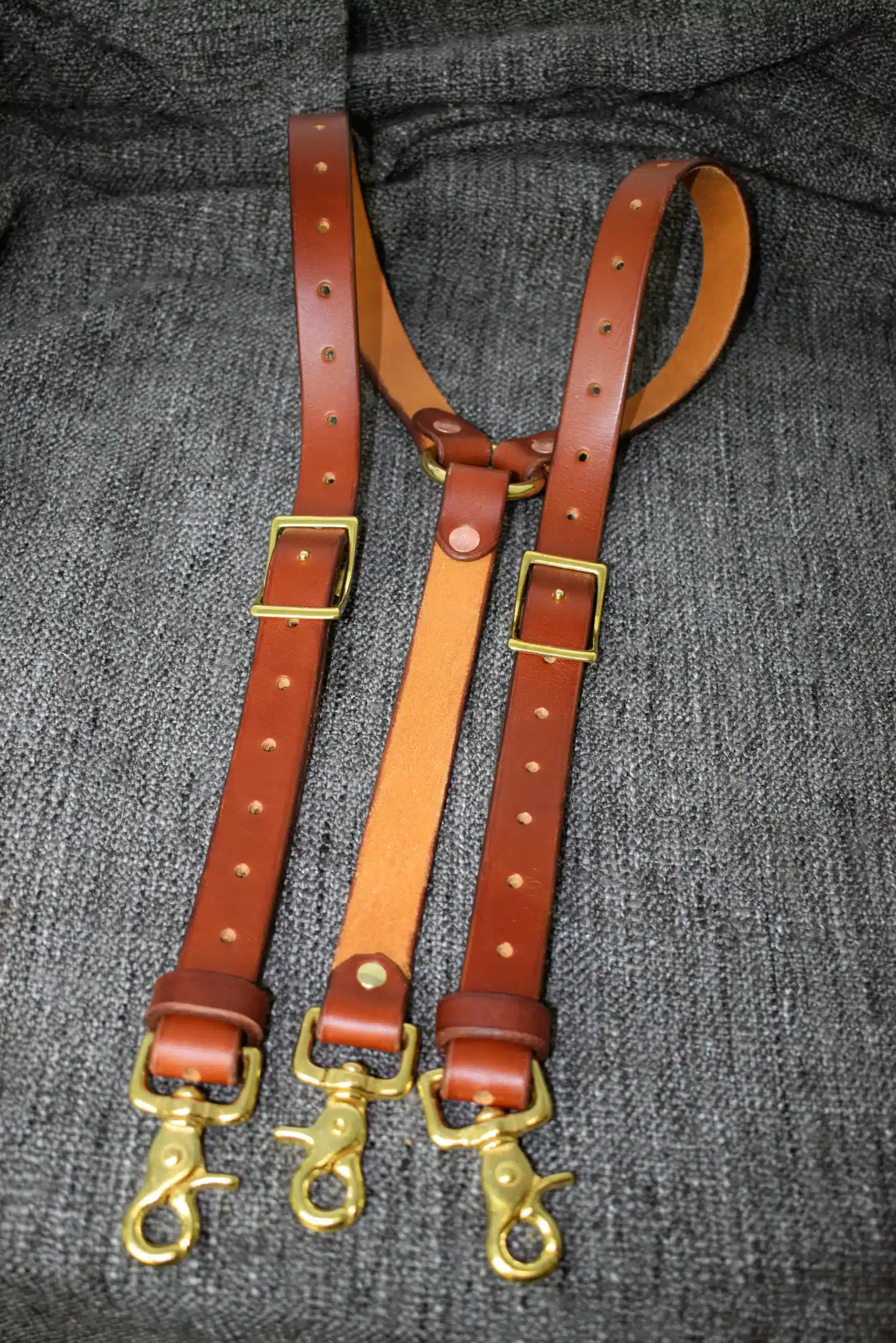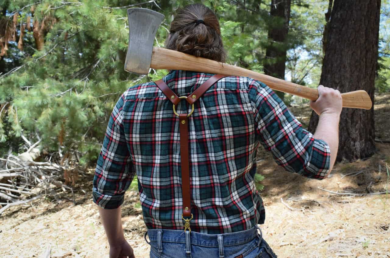 These are a set of leather suspenders. These are slightly more heavy duty than our other suspender options, made with heavier weight hardware, and fewer moving parts. You don’t have to cut down trees for a living to wear them, but they’re more than up to the task.