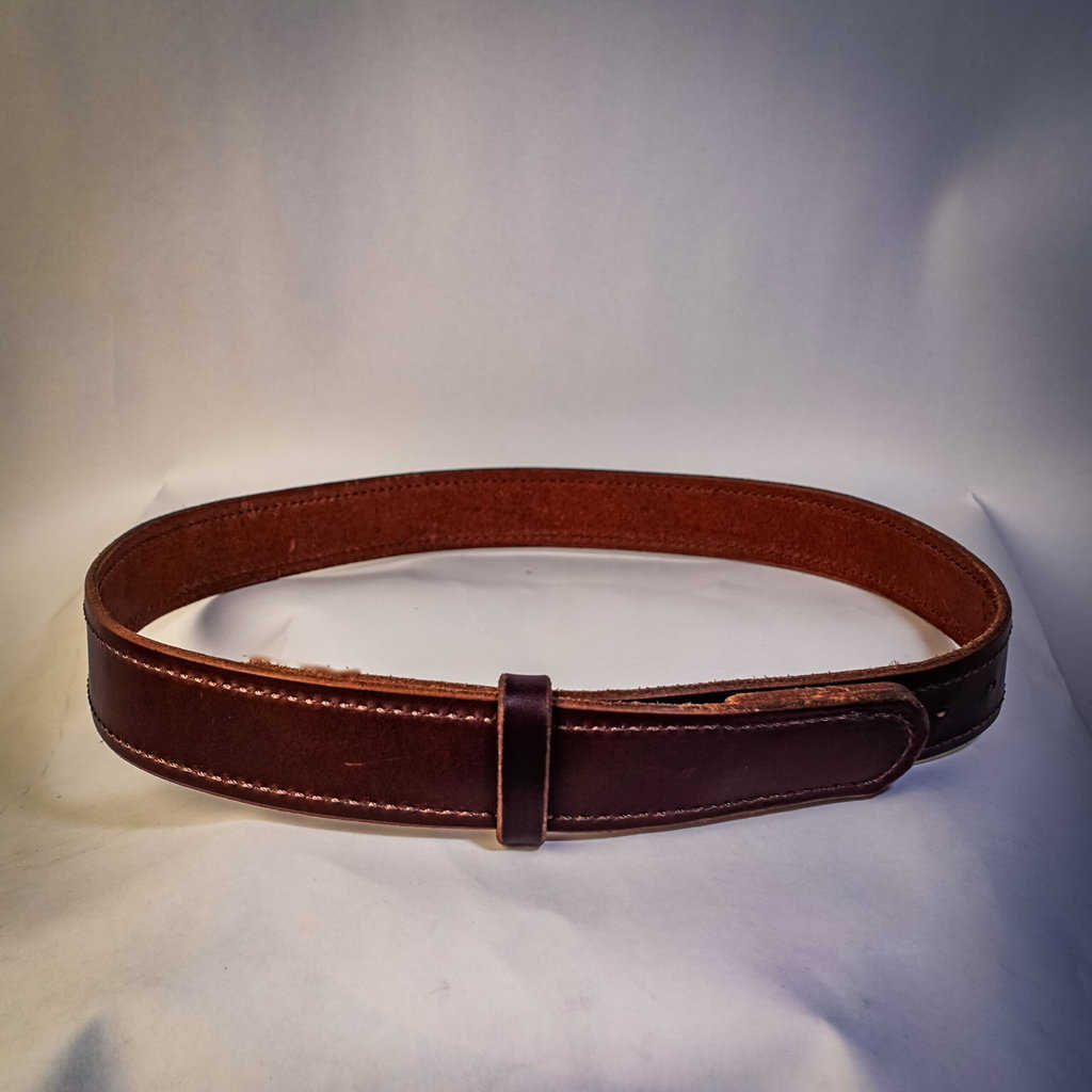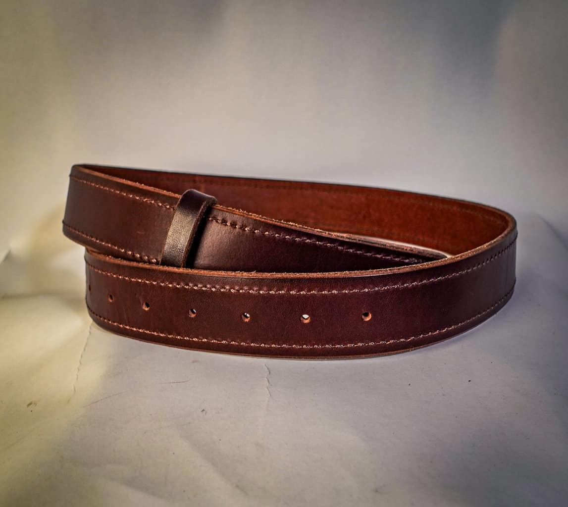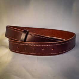 Each belt is 1.5″ wide and made out of 8-10 ounce latigo cowhide and is stitched all along the border in a color of your choice.