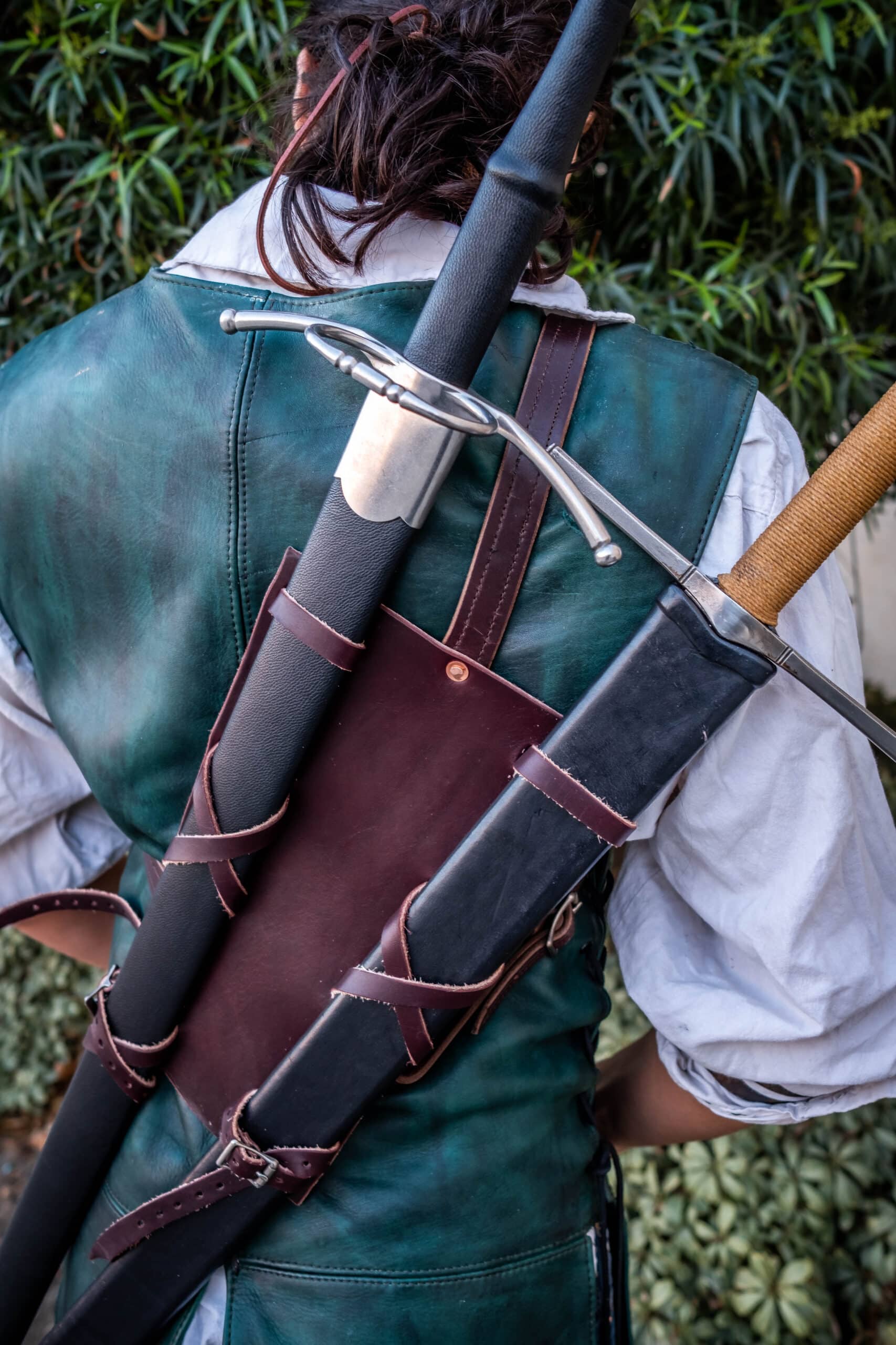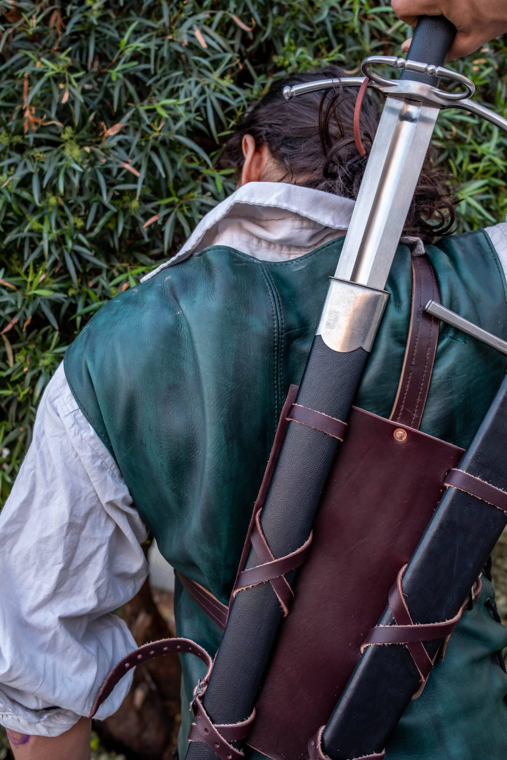 It is important to note that while back carry is a very convenient and comfortable way to carry a sword, longer swords may be difficult to draw or re-sheath without a bit of help. Shorter swords are a bit easier, but it is unlikely that your experience will match those you’ve seen in movies/video games.