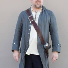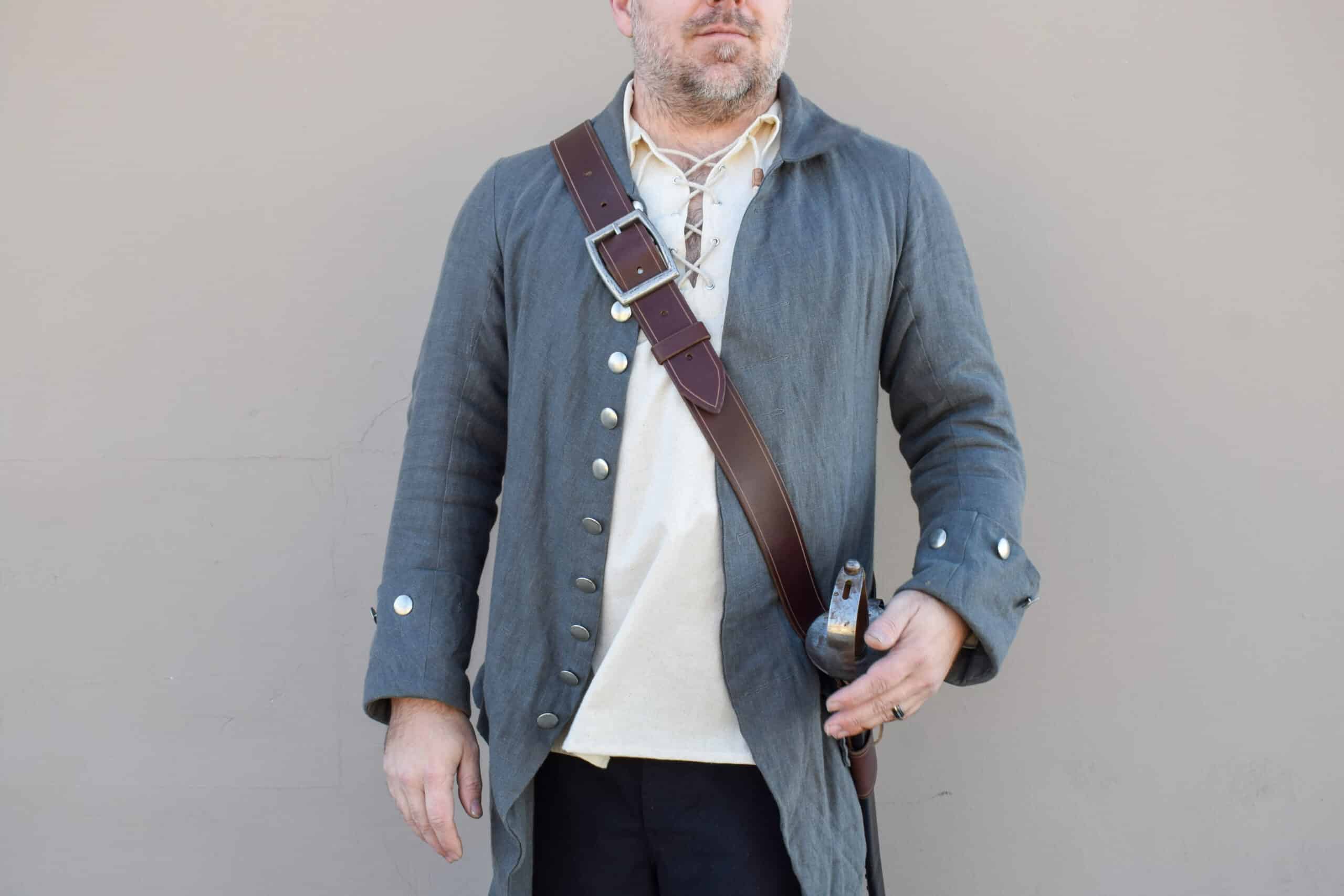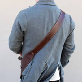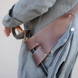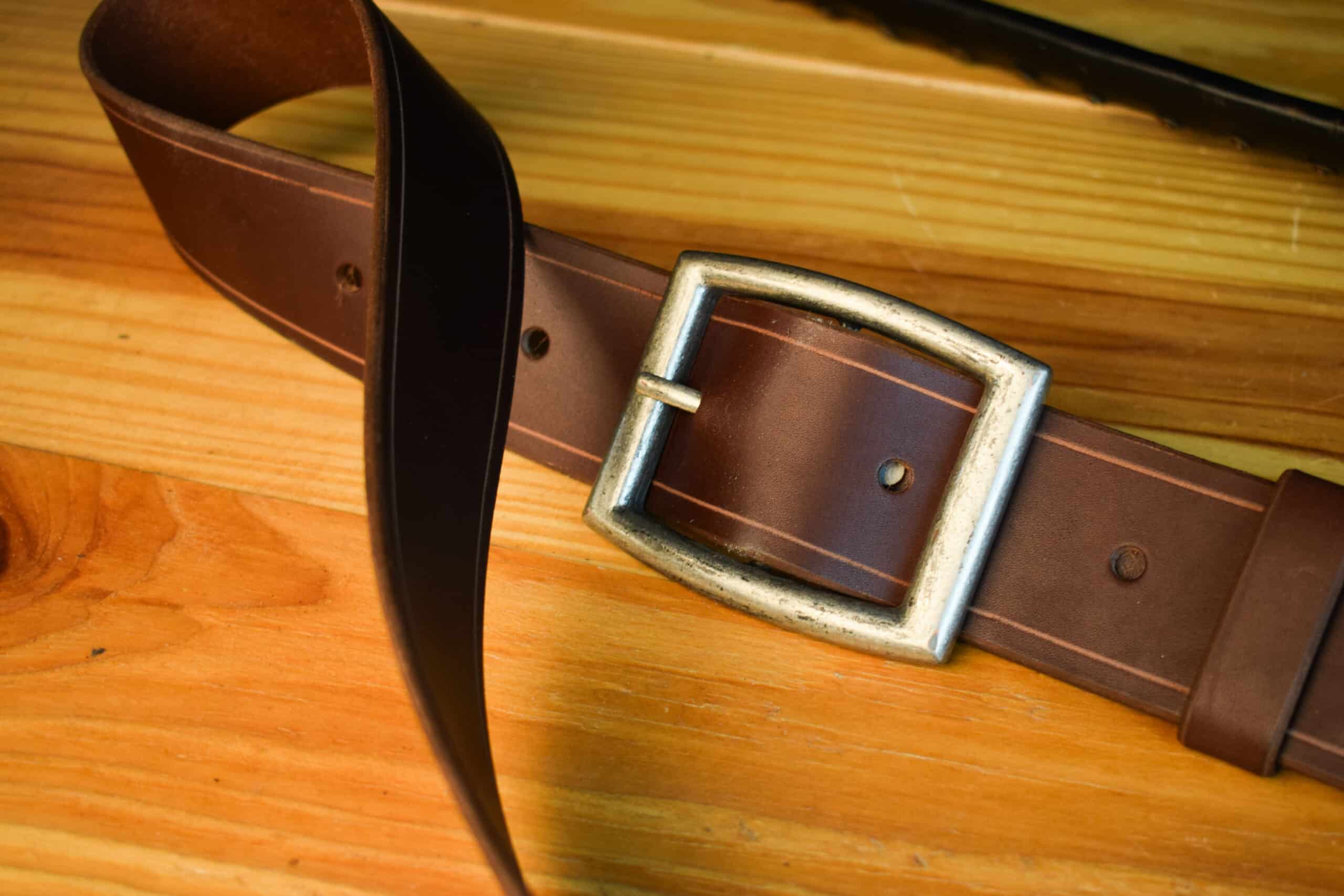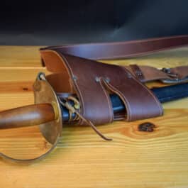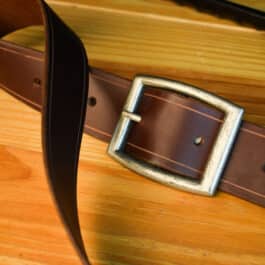 The baldric is made out of 8-10 ounce latigo cowhide, and is available with 26 different buckles, in several different widths. The “natural” color option will be made out of Vegetable tanned leather, instead of the latigo.