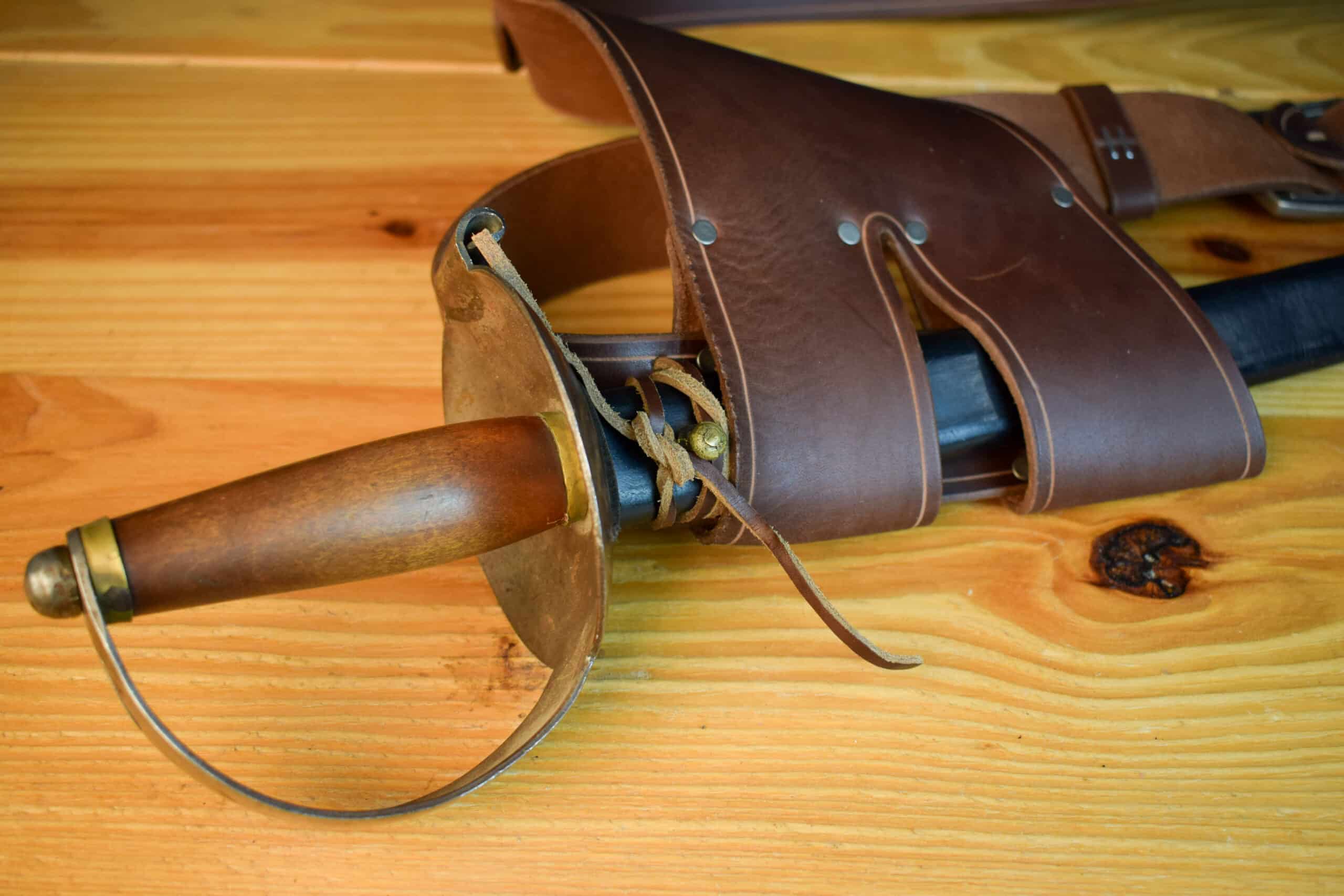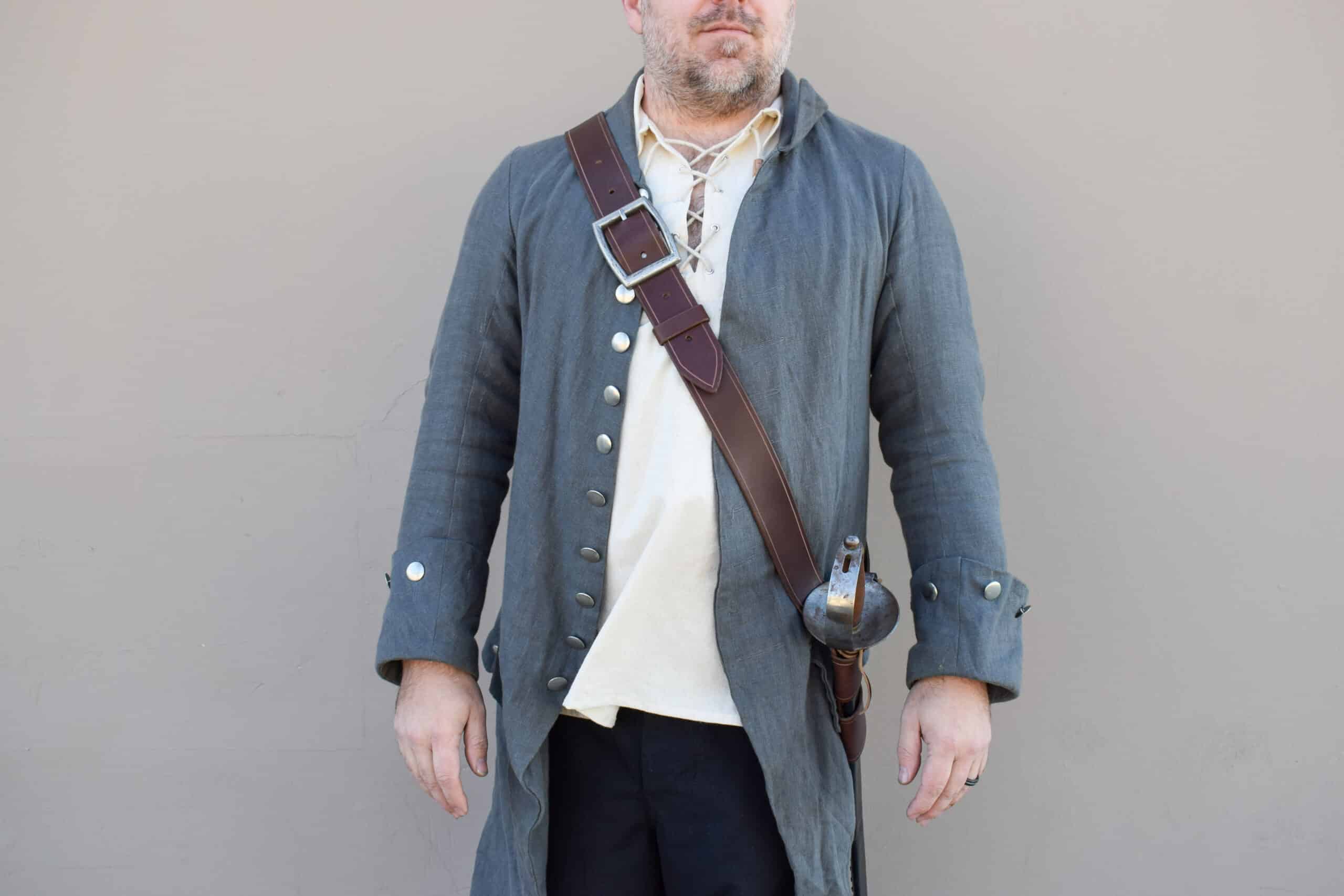 The baldric is set up to hold many different sized swords, with a leather lace at the throat of the frog to secure the scabbard inside.