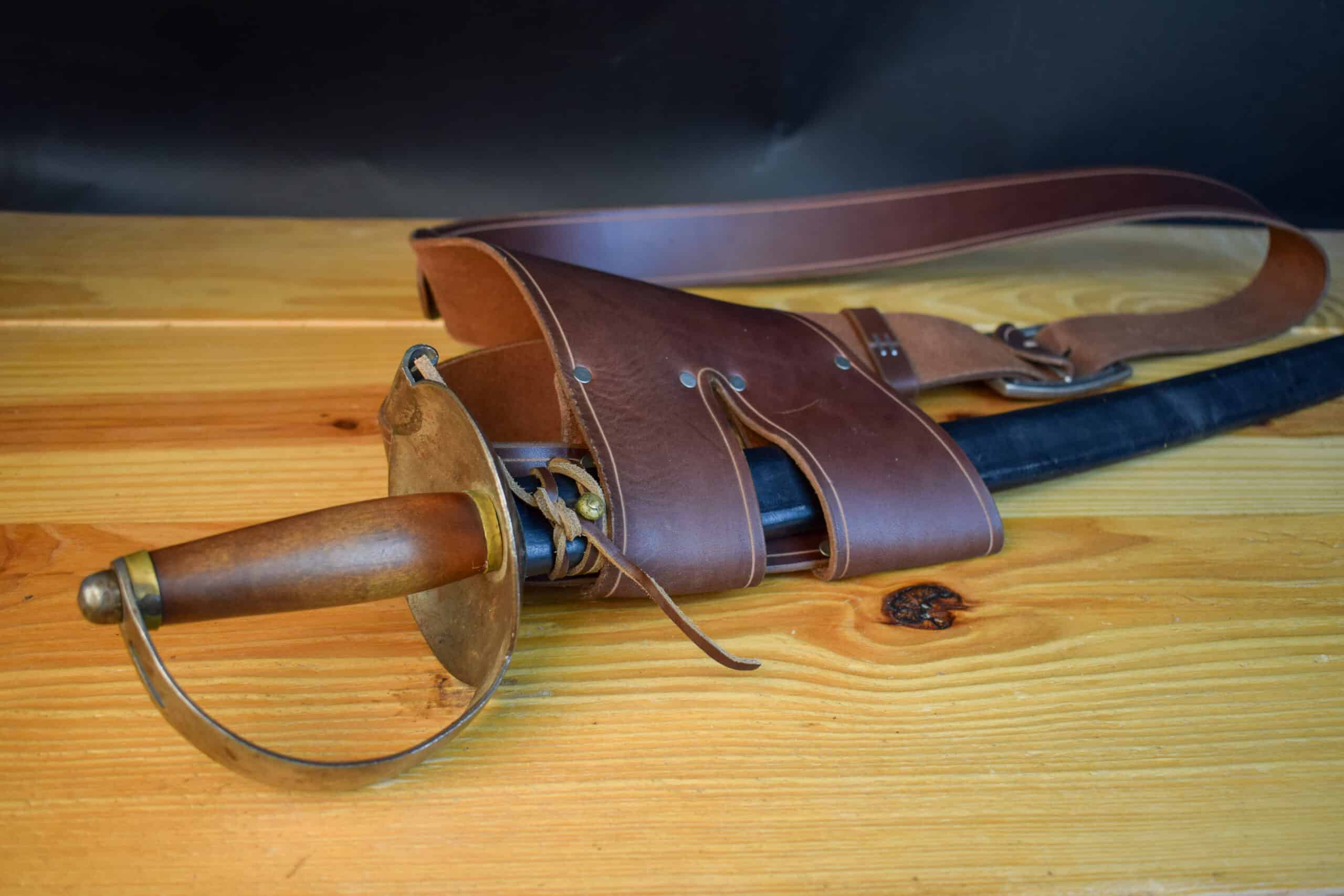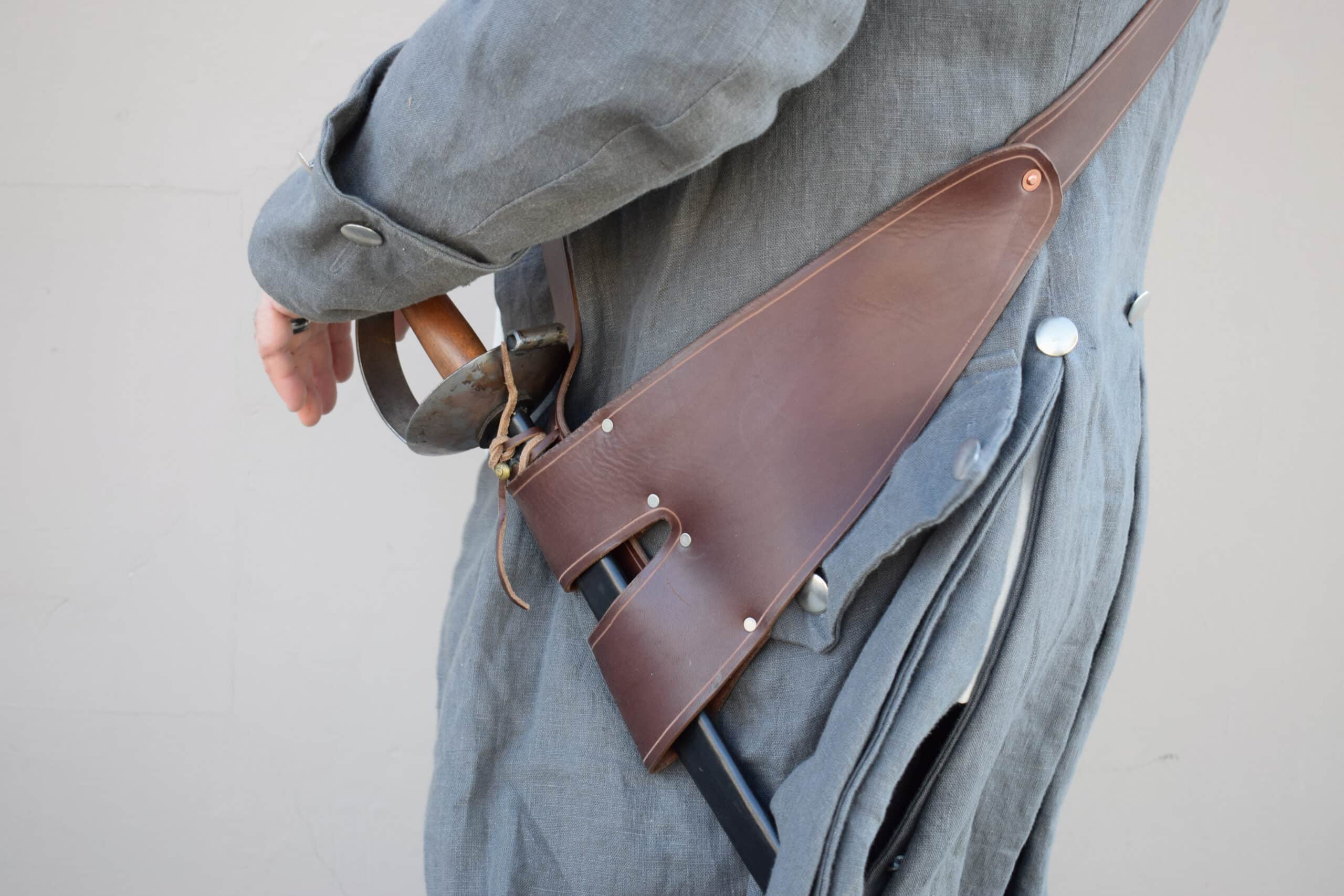 This listing is for a handmade leather baldric. The title says pirate baldric, but it works for any type of sword-carrying.