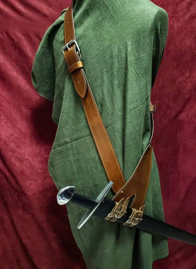 The baldric has buckled straps on the frog, which allows you to carry a variety of swords.