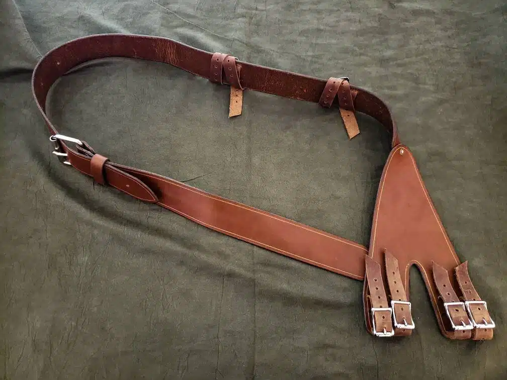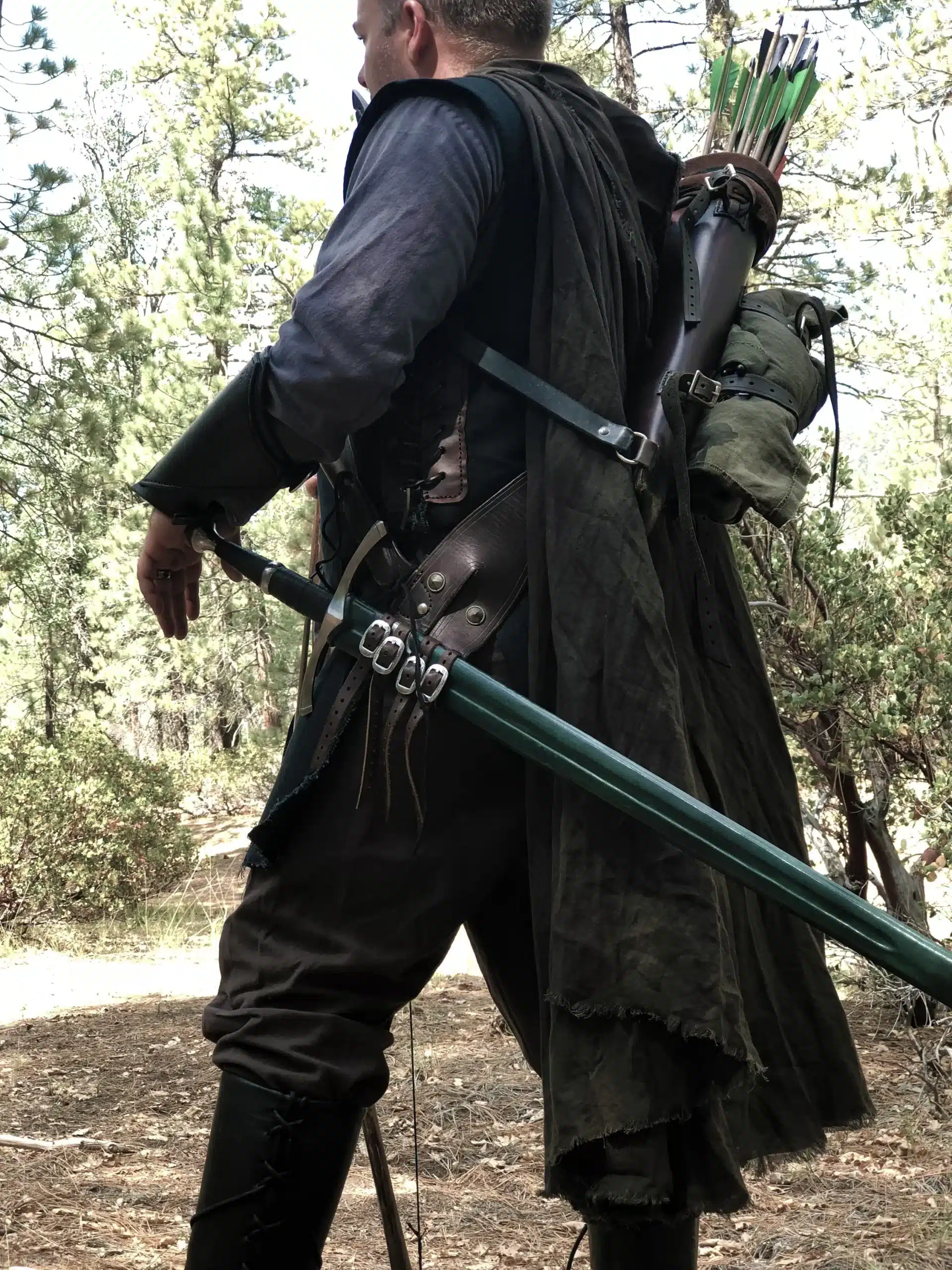 I’ve included a few different options for add-ons. First, I can add an integrated sheath on the lower strap of the baldric that will accommodate a knife with up to a 5″ blade. Also, I can add two buckled straps on the back of the baldric which can be used to carry a bedroll, backup weapon, Halfling, or whatever you wish.