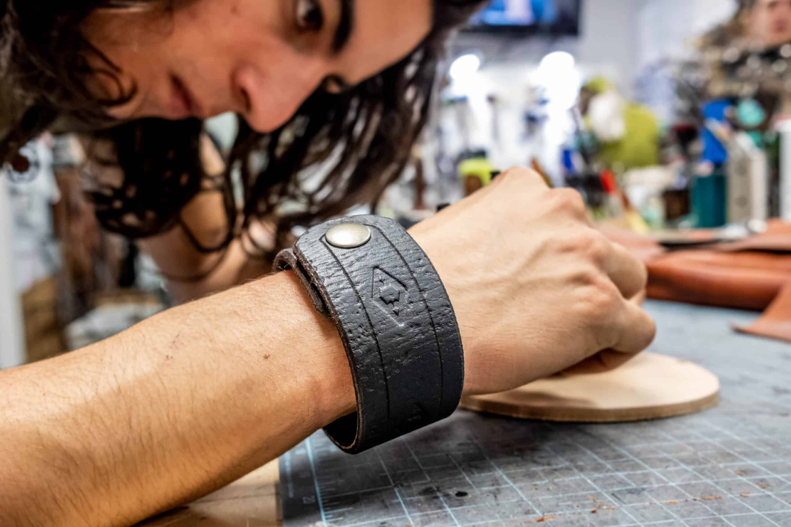 Each cuff is made out of the same 1.5″ wide vegetable tanned leather as our belts. They are then hand dyed, hand stamped, and cut to your wrist size with a snap closure.
