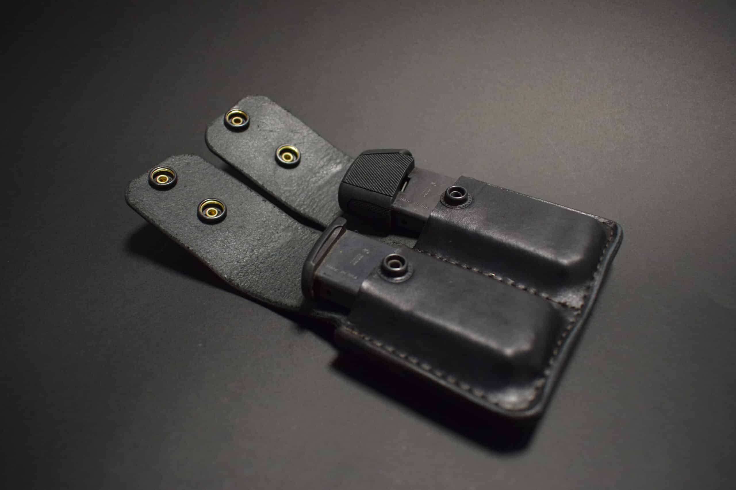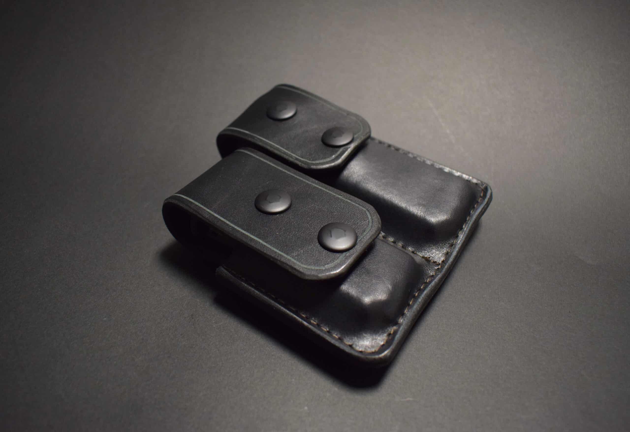 Each pouch is made out of 8-10 ounce latigo cowhide, and features two flaps that snap closed, securing the magazines inside.