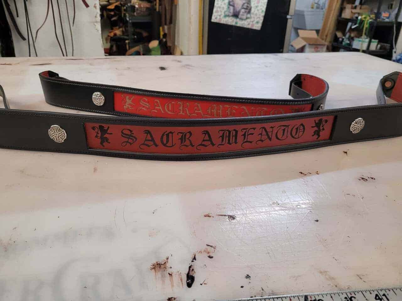 3 XXL 54″ drum belts with  concho’s and inside buckles out from 4 1/4 ” to 3″ from the ends of the window on the back.