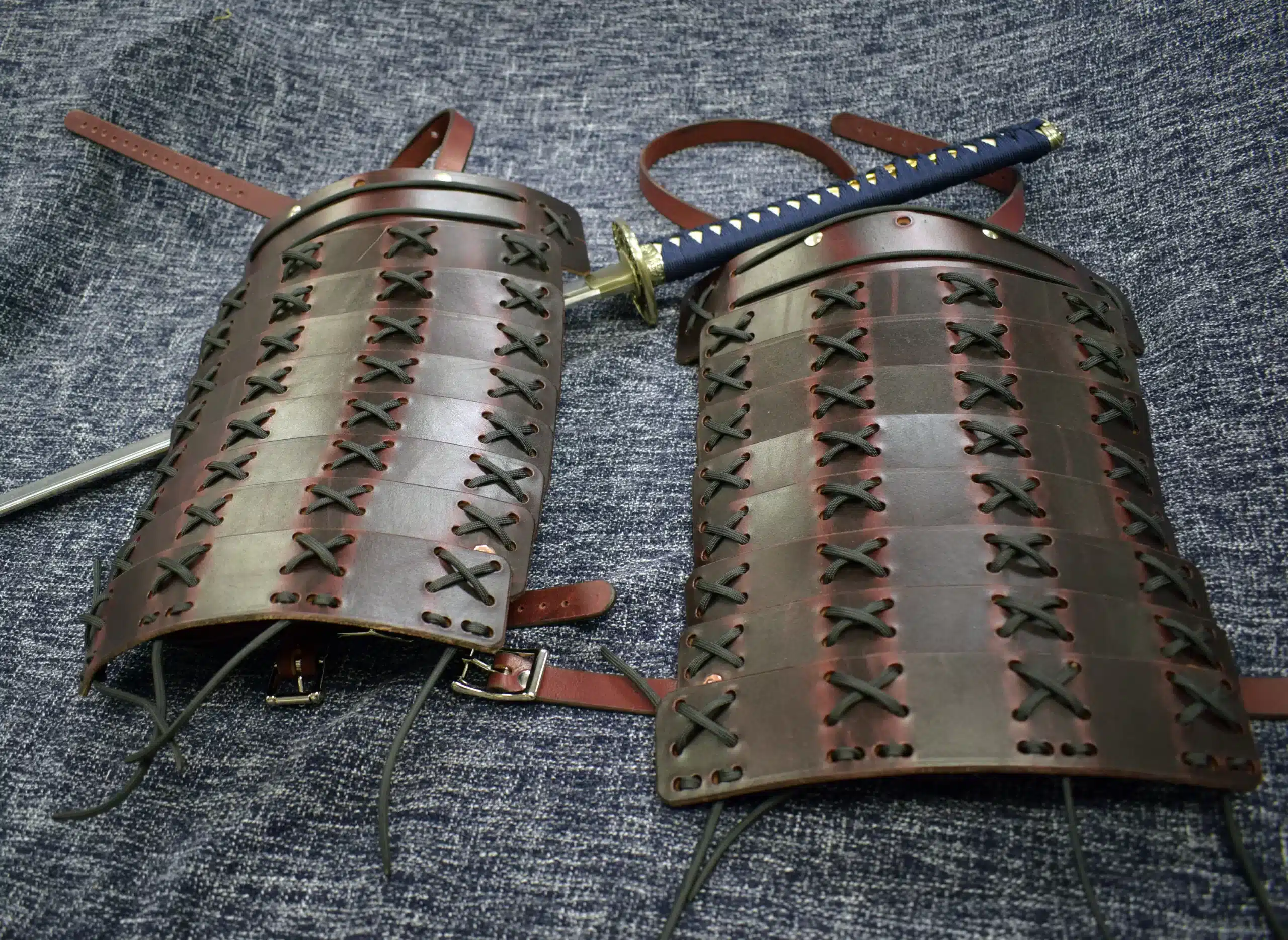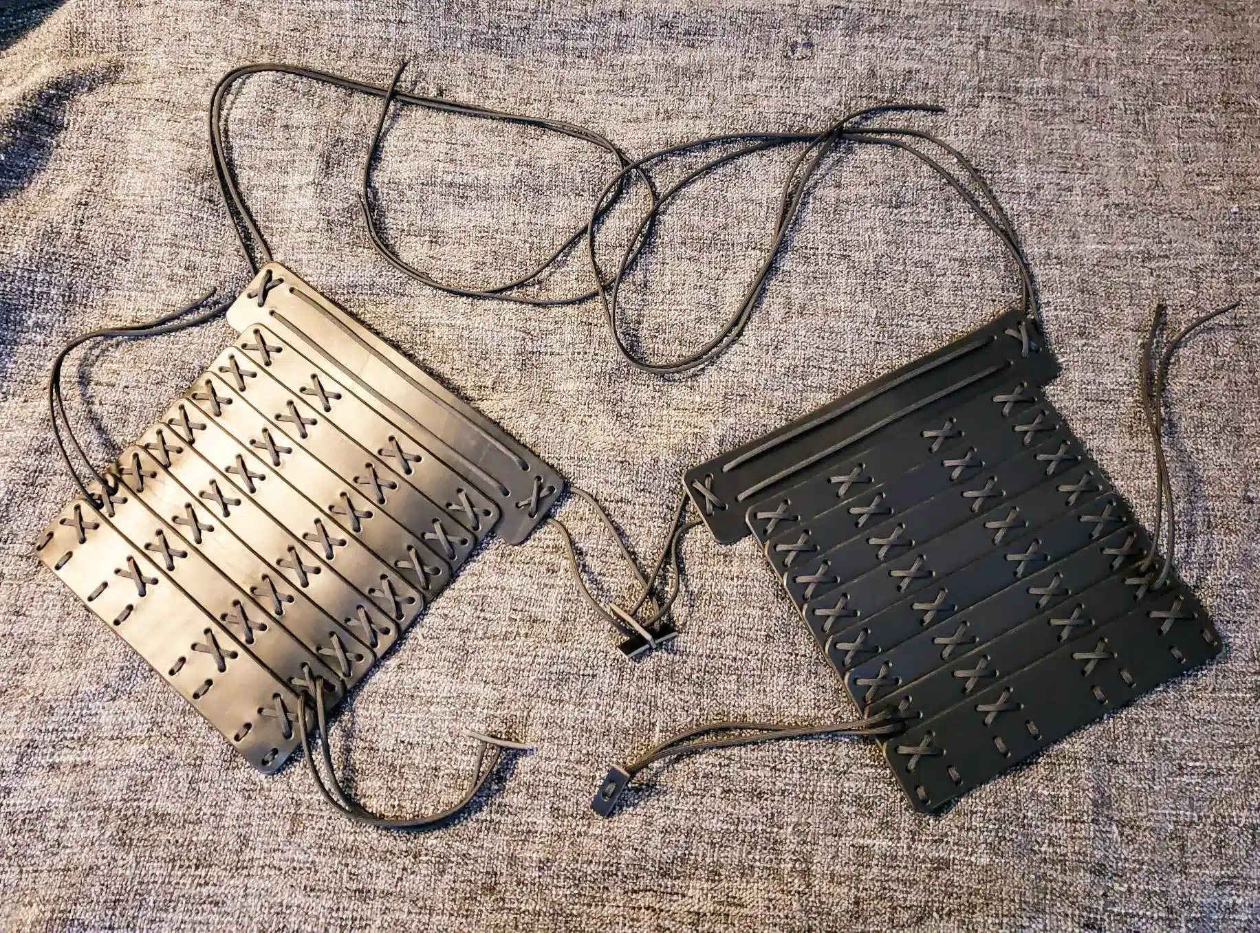 Each set is made of 8 overlapping panels of 8-10 ounce leather laced on with paracord.