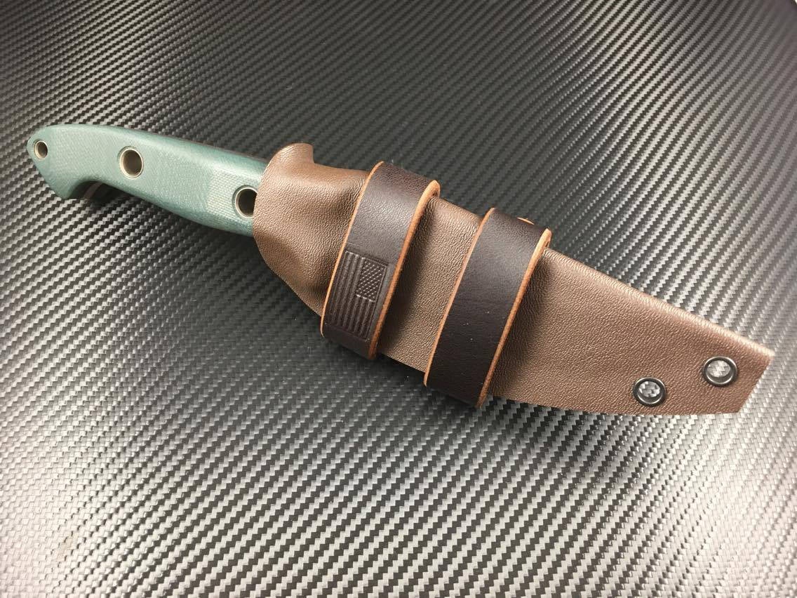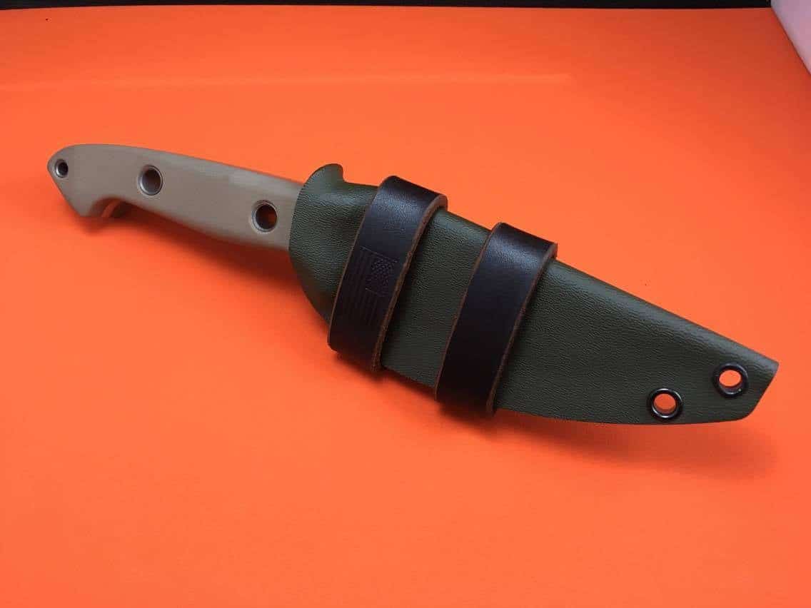 The sheath is an improvement over the thin kydex sheath that comes stock from Benchmade. It is available in a variety of colors. This listing features scout strap suspension, which allows you to carry the knife horizontally on the belt. The scout style sheath does not have a retention strap, however; there is a thumb groove to assist in drawing the knife and a drain hole in the bottom to prevent fluid buildup.