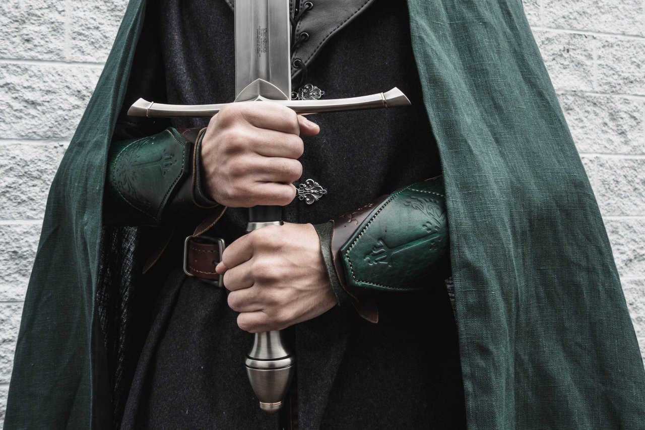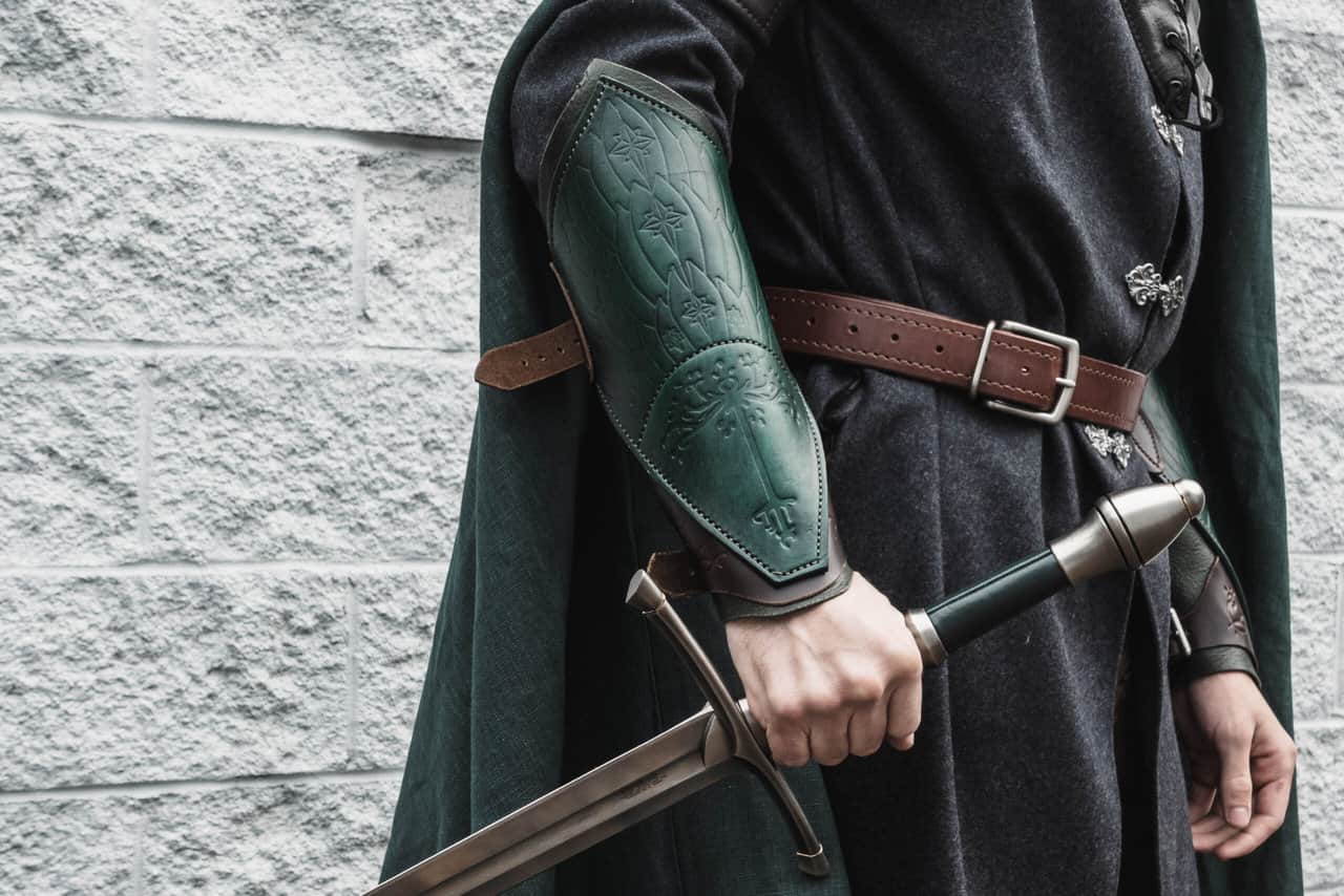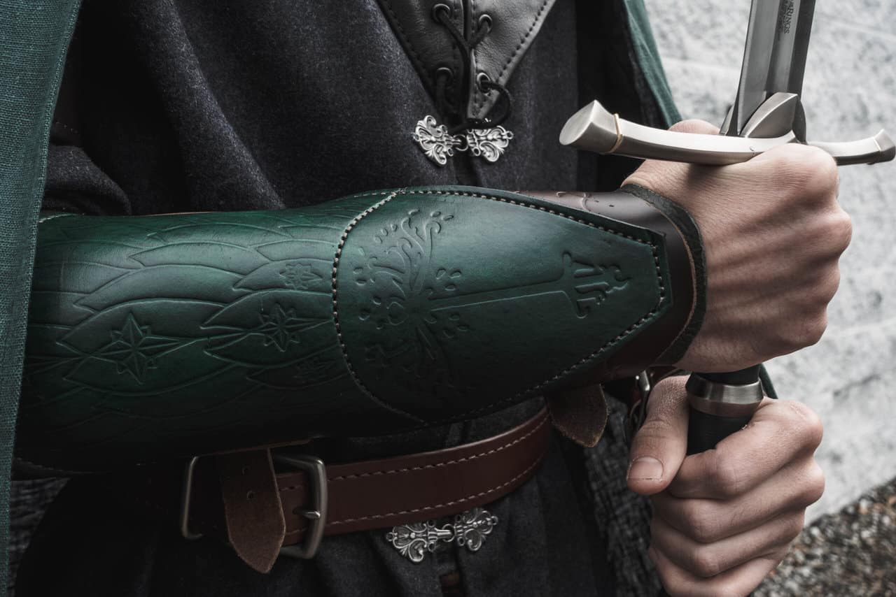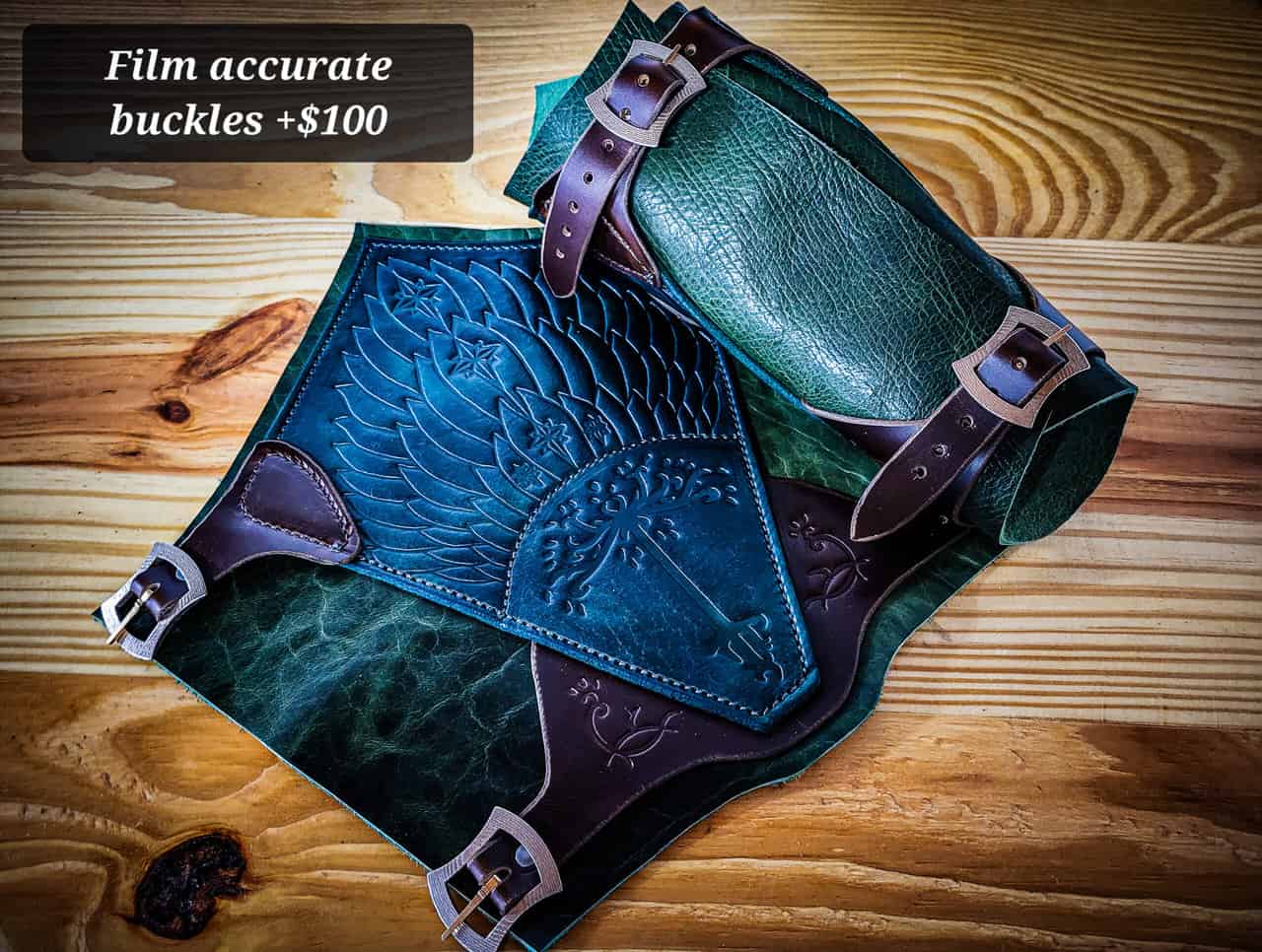 Each pair is made out of a top layerof 8-10 ounce vegetable tanned cowhide that is stamped with the design and hand dyed a rustic dark green color. There is also an integrated under bracer made out of 5-6 ounce green bison leather and buckle straps made out of 5-6 ounce oul tanned cowhide.