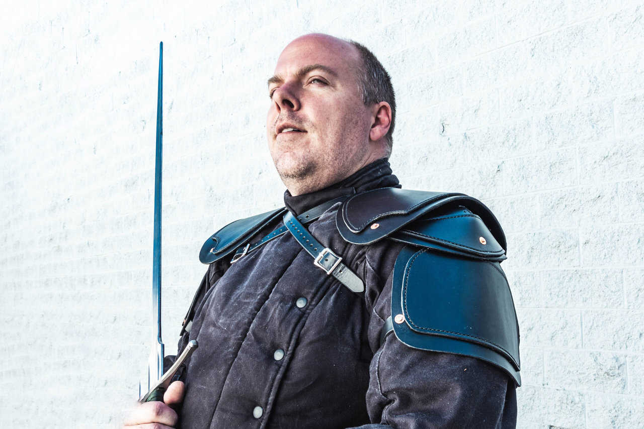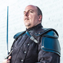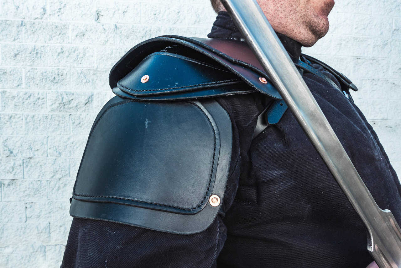 They are made from 8 oz Latigo leather and feature a long buckled strap that runs across the chest, as well as two straps that secure it to your arm. The chest straps are attached via Chicago screws, which makes them easily removable to use alternate attachment options. There are two holes on the top edge of the pauldrons which allow them to be laced onto a gambeson or maille shirt via point ties; or attached to the gorget that I offer via chicago screw.