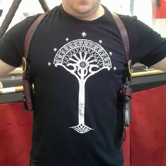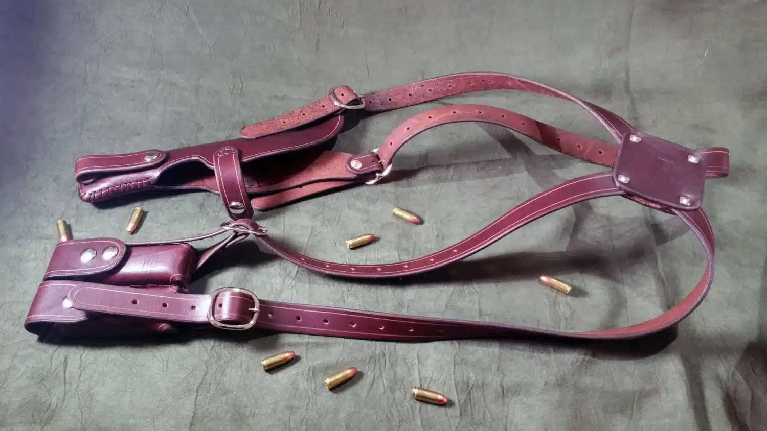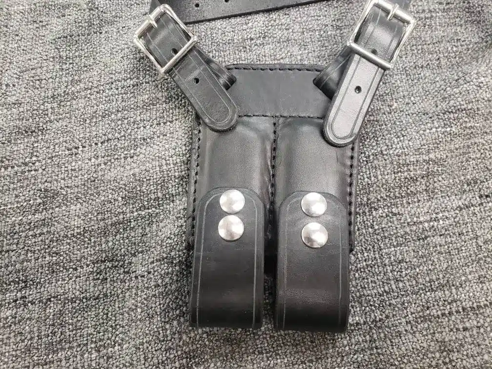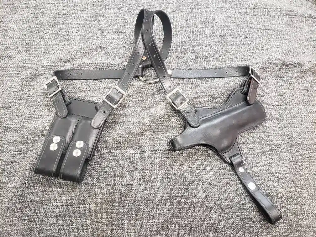 The holster features shoulder straps that are adjustable via 4 buckles. It features a holster for the gun, loop to attach holster to your belt and a double mag pouch.