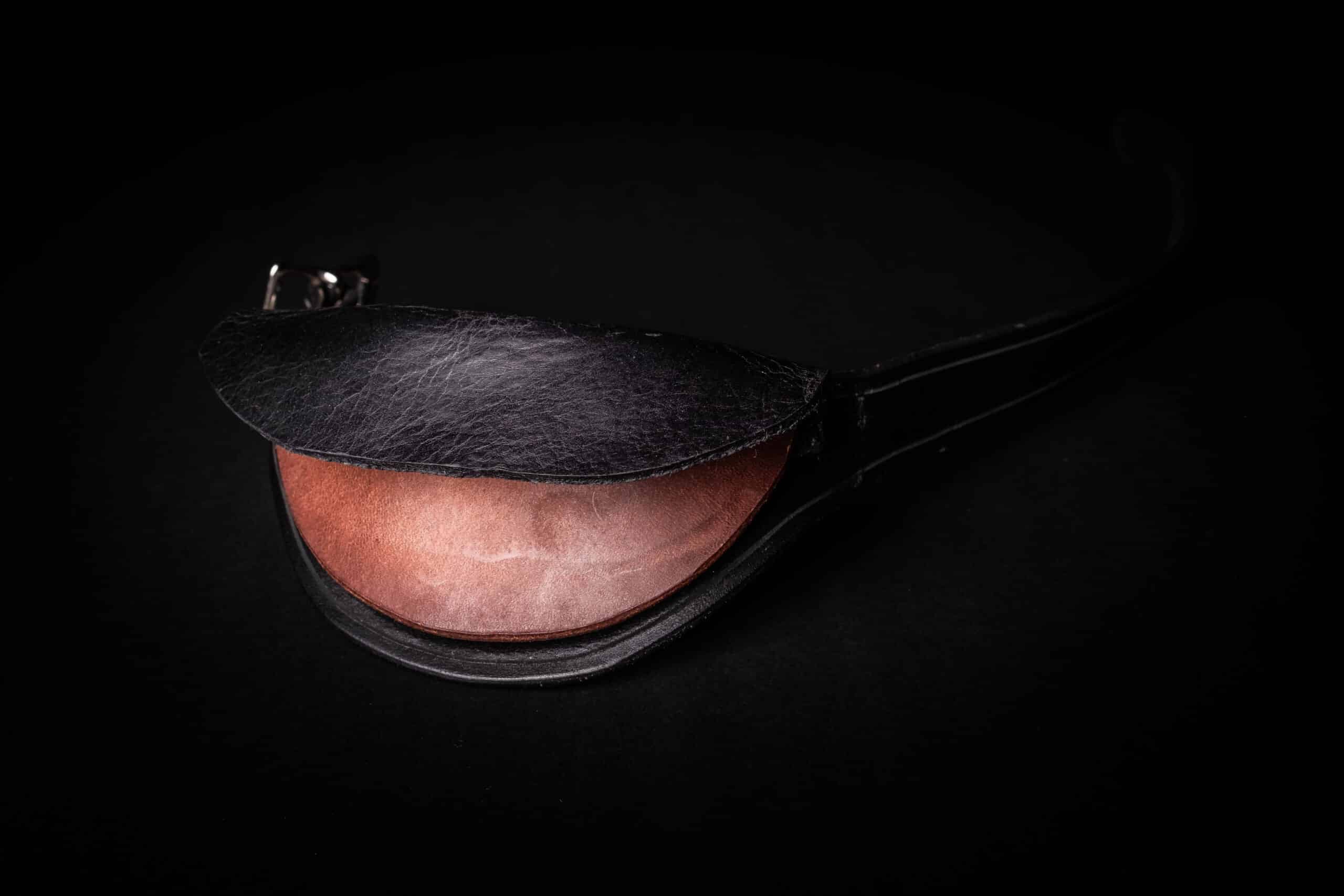 Each gorget consists of a bottom layer of 8-10 ounce latigo cowhide with a rigid 15 ounce sole bend half circle attached to the front to provide protection. You have the option of wax hardening the front of the gorget, though the sole bend itself is tanned specifically to be extremely rigid, so hardening is not completely necessary.