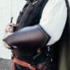 Each pair is made out of 8-10 ounce latigo cowhide with a 3-4 ounce bison panel on the inside to protect the arm from the lacing.