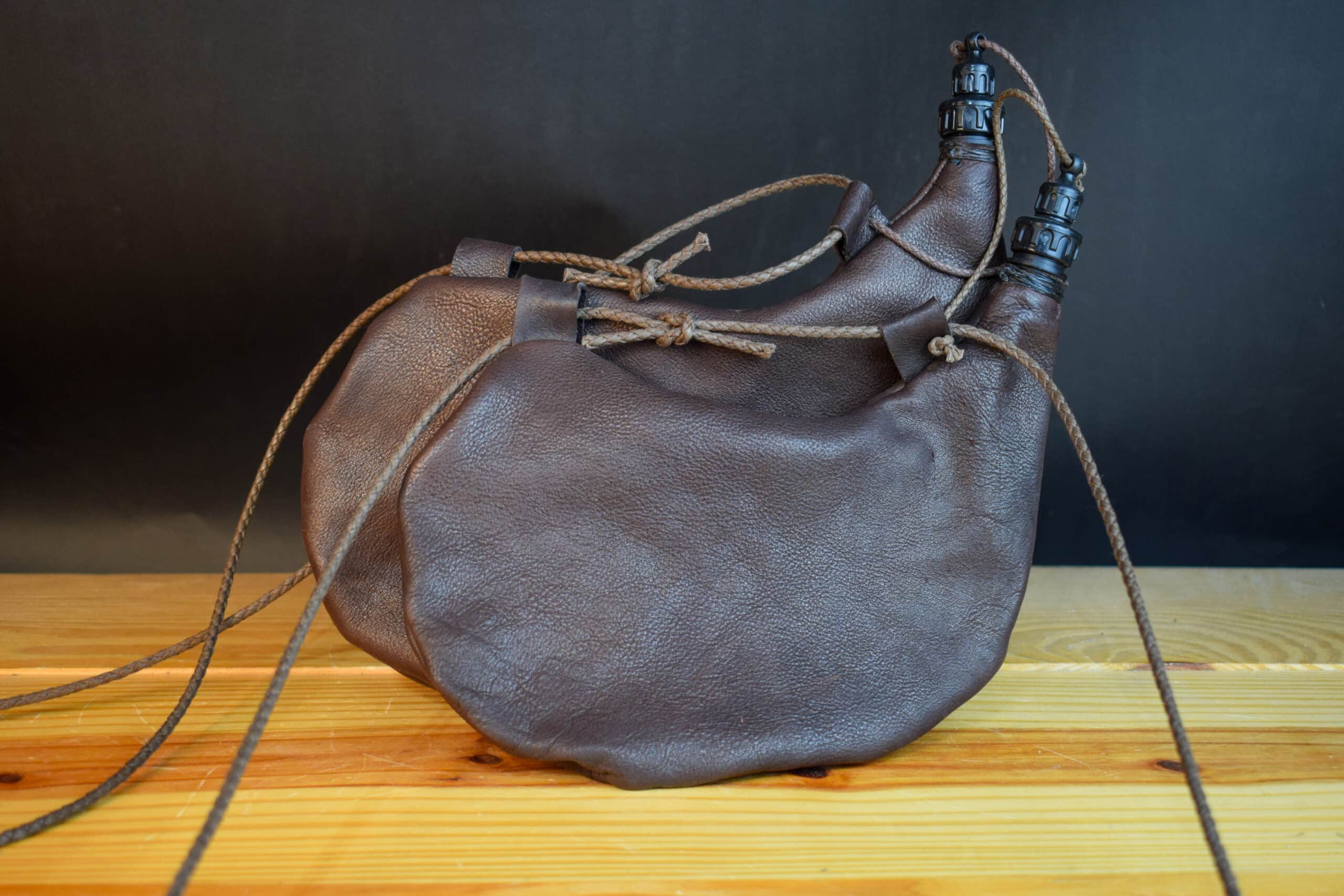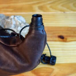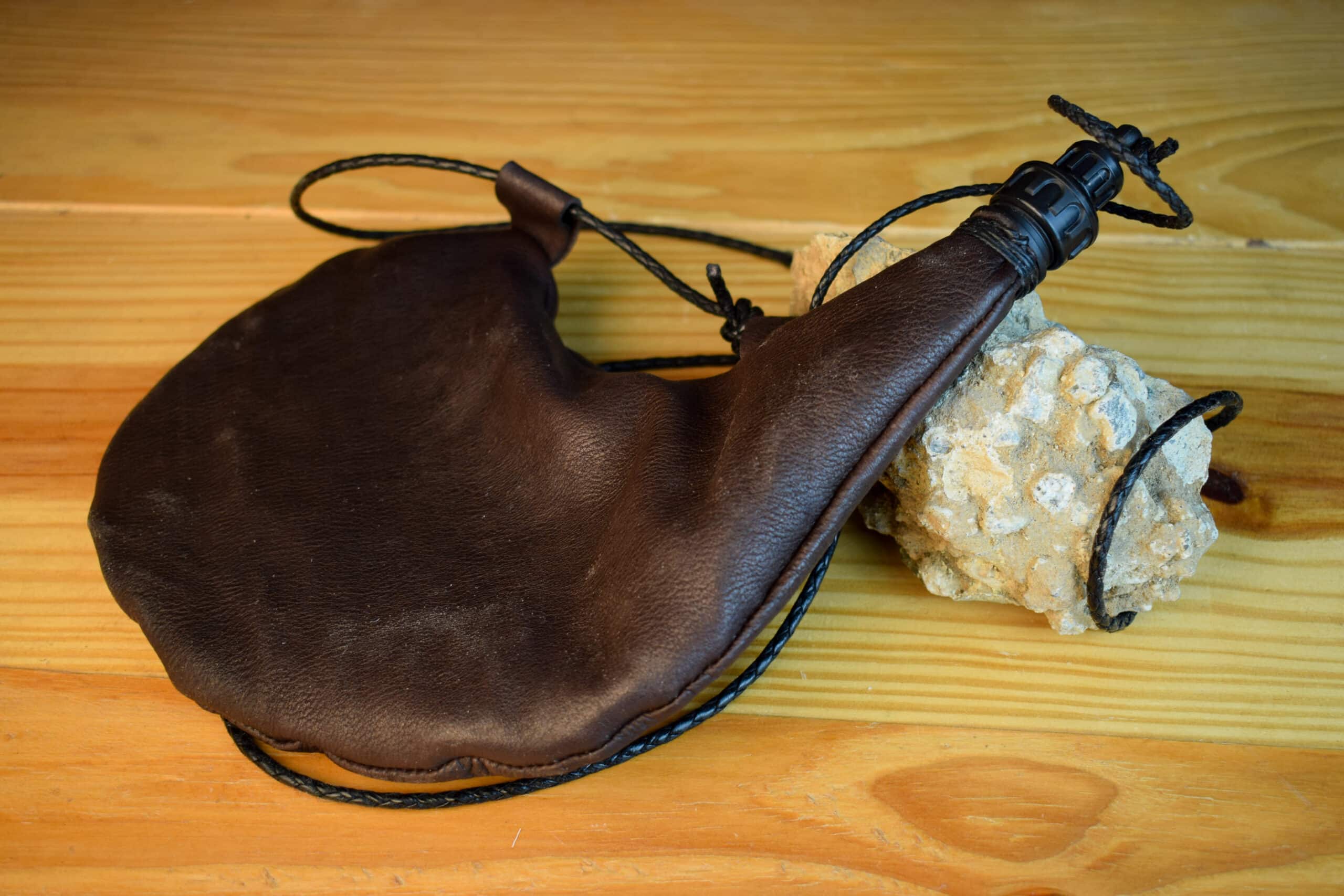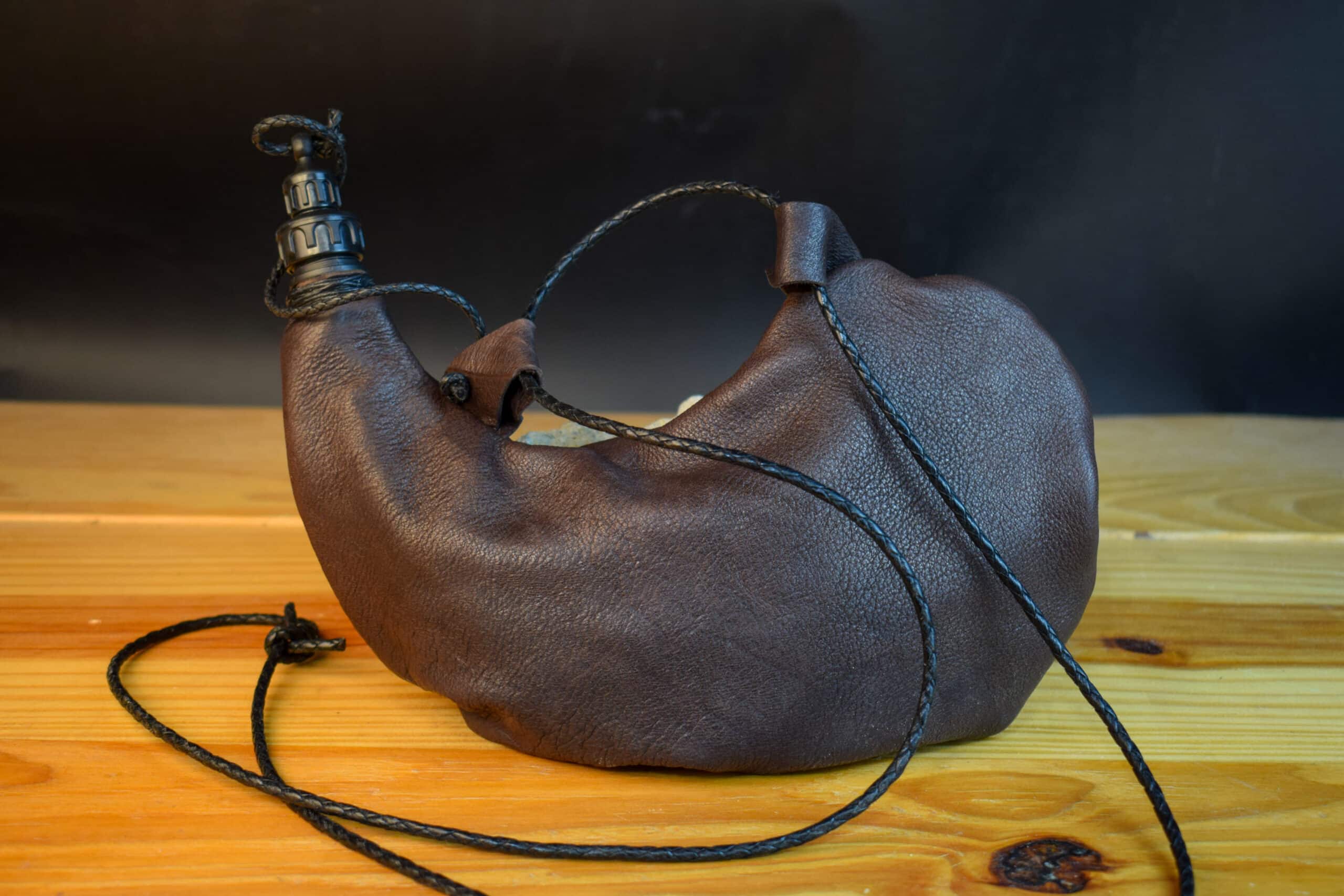 These classic bota style wineskins are similar to our waxed leather costrels, but made with a plastic bladder inside a shell of supple deerskin, making them much softer than the hardened costrel style.