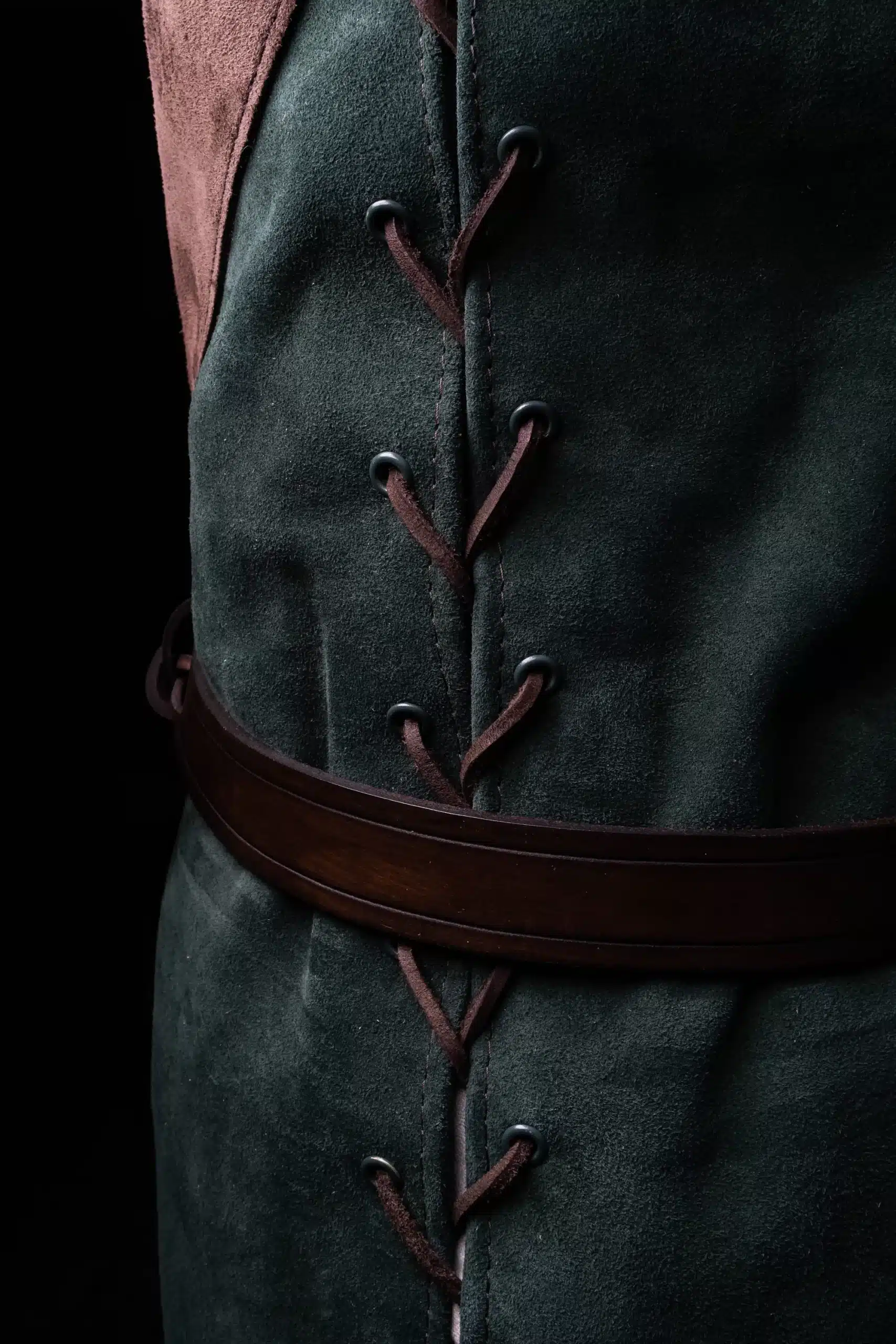 Each jerkin has your choice of two colors for the top and bottom sections. All of the edges are hemmed, and the side lace closures are reinforced with a second layer of leather and metal eyelets.