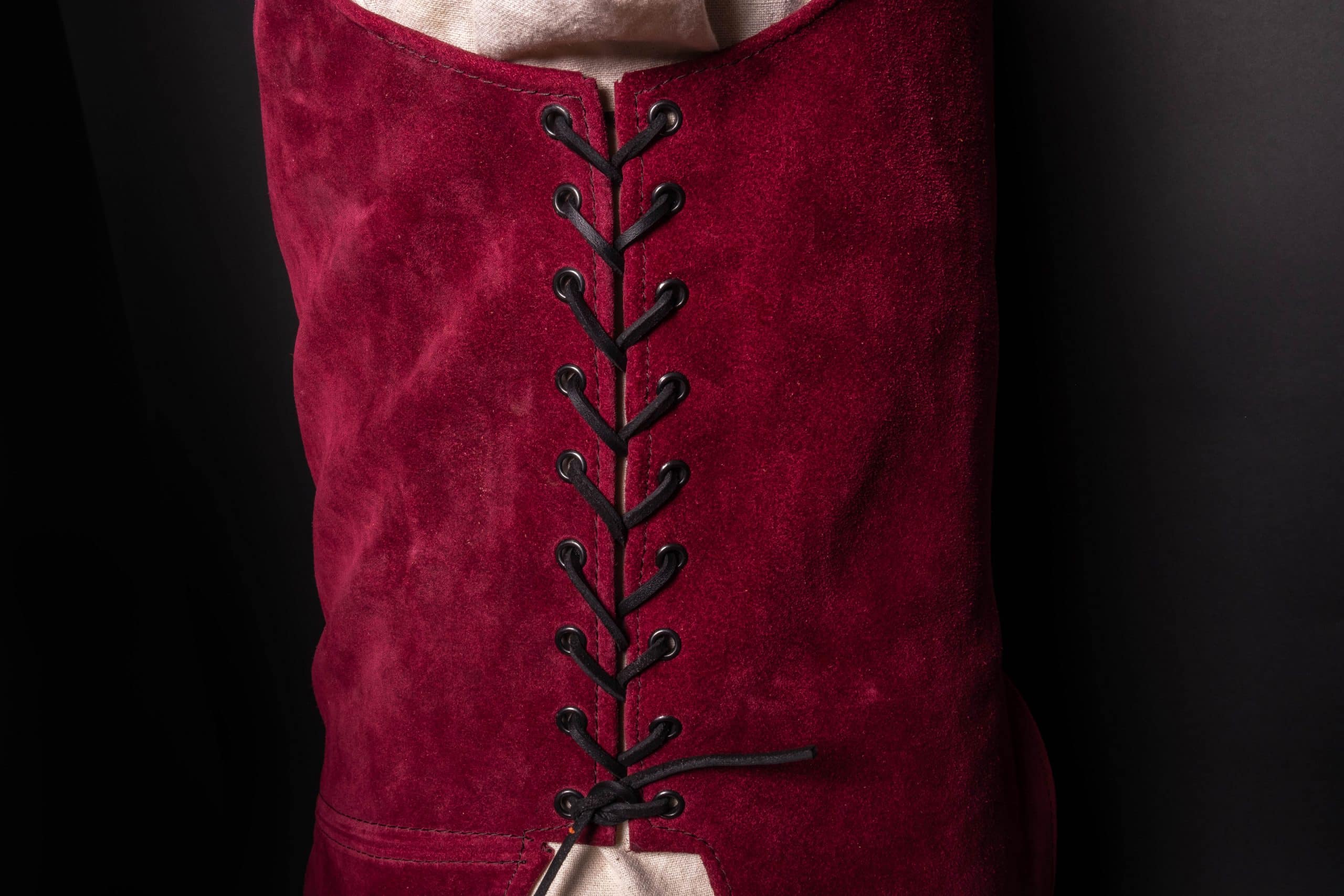 Each jerkin has a back seam along the waist line and an angled seam in front. All of the edges are hemmed, and the side lace closures are reinforced with a second layer of leather and metal eyelets.