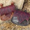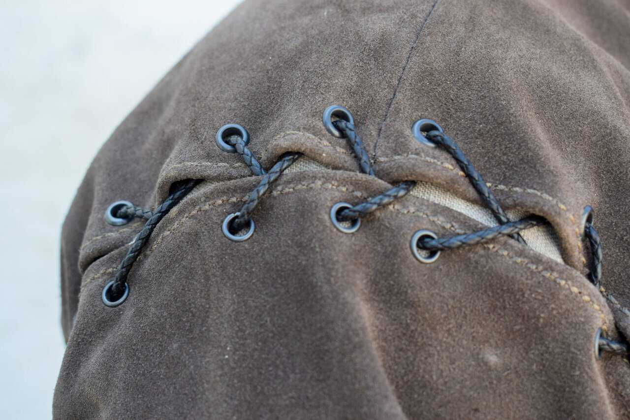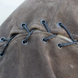 Each jerkin has an angled seam in front. All of the edges are hemmed, and the side lace closures are reinforced with a second layer of leather and metal eyelets.